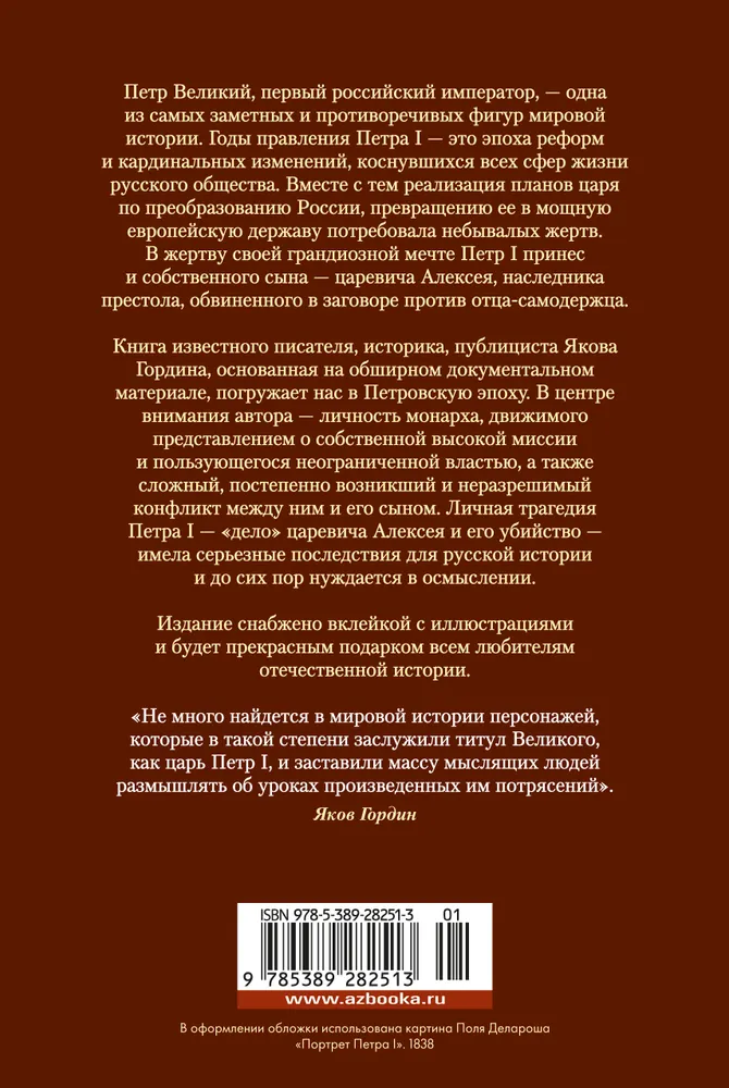 ОписаниеАннотация к книге "Царь и Бог: Петр Великий и его утопия" Гордин Я. А.:Петр Великий, первый российский император, — одна из самых заметных и противоречивых фигур мировой истории. Годы правления Петра I — это эпоха реформ и кардинальных изменений, коснувшихся всех сфер жизни русского общества. Вместе с тем реализация планов царя по преобразованию России, превращению ее в мощную европейскую державу потребовала больших жертв. В жертву своей грандиозной мечте Петр I принес и собственного сына — царевича Алексея, наследника престола, обвиненного в заговоре против отца-самодержца.Книга известного писателя, историка, публициста Якова Гордина, основанная на обширном документальном материале, погружает нас в Петровскую эпоху. В центре внимания автора — личность монарха, движимого представлением о собственной высокой миссии и пользующегося неограниченной властью, а также сложный, постепенно возникший и неразрешимый конфликт между ним и его сыном. Личная трагедия Петра I — «дело» царевича Алексея и его убийство — имела серьезные последствия для русской истории и до сих пор нуждается в осмыслении. Издание снабжено вклейкой с иллюстрациями и будет прекрасным подарком всем любителям отечественной истории. Читать дальше…
