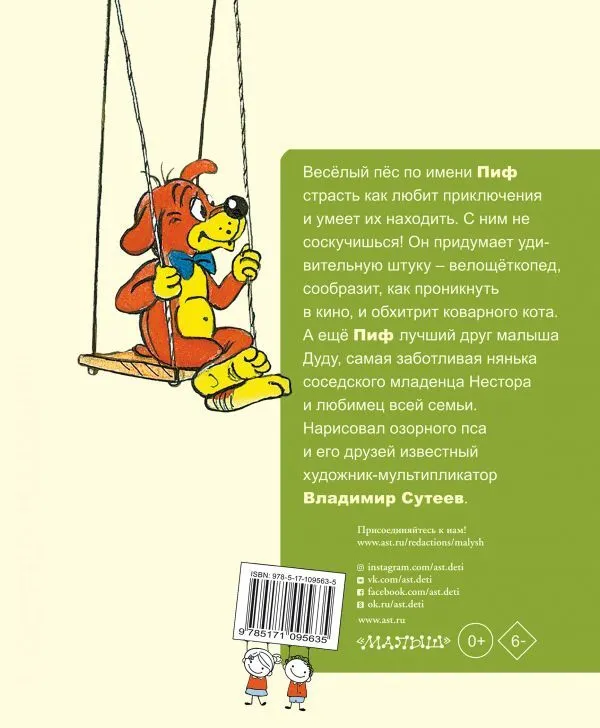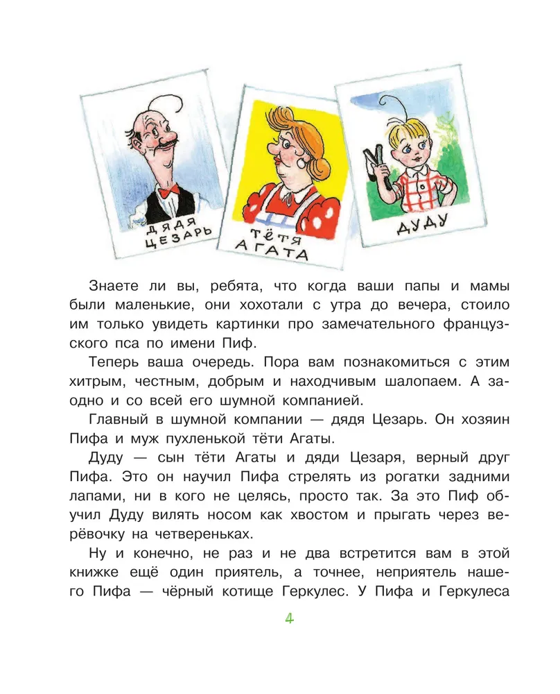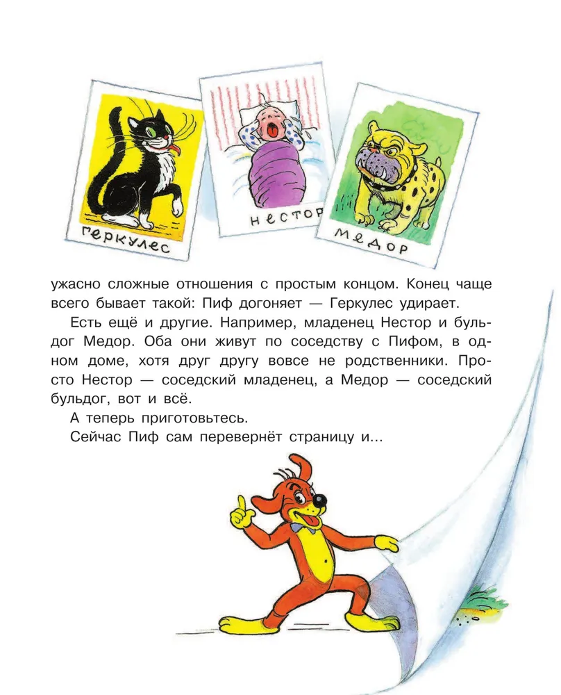ОписаниеПриключения Пифа. Остер Г.Б. Остер — малышам! «Приключения Пифа» Григория Остера – это весёлые истории про озорного пса Пифа и его друзей: дядю Цезаря, тётю Агату, малыша Дуду и кота Геркулеса. Пиф может превратить любое даже самое скучное занятие в настоящее приключение. В этом ему помогают остроумие и изобретательность. Ну кто ещё будет пилить дрова, качаясь на качелях?! Яркие и подробные иллюстрации нарисовал художник В.Г. Сутеев. Для детей до 3-х лет.