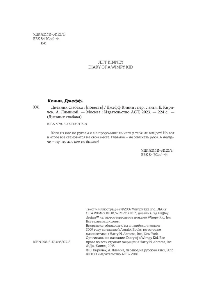 Объем, стр. 224 ISBN 978-5-17-095203-8 Минимальный возраст 10+ Год издания книги 2023 Автор Кинни Джефф Серия Дневник слабака Тип обложки Твердый переплет Иллюстрации Черно-белые Вес, г 336г Размеры 205х145х25 мм - Отзывы