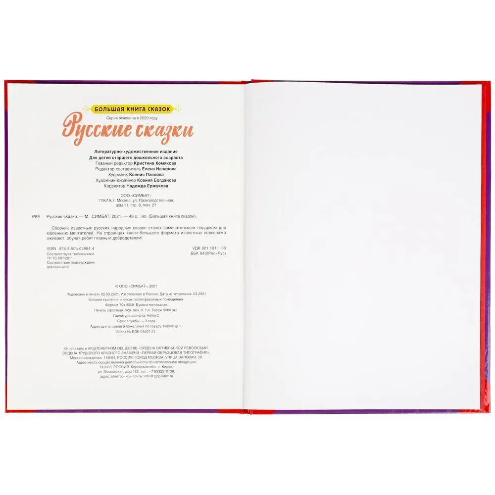 Объем, стр. 48 ISBN 978-5-506-05984-4 Минимальный возраст 0+ Год издания книги 2021 Автор Сборник народных сказок, Назарова Евгения Серия Большая книга сказок Тип обложки Твердый переплет Иллюстрации Цветные Вес, г 243г Размеры 320х240х15 мм - Отзывы