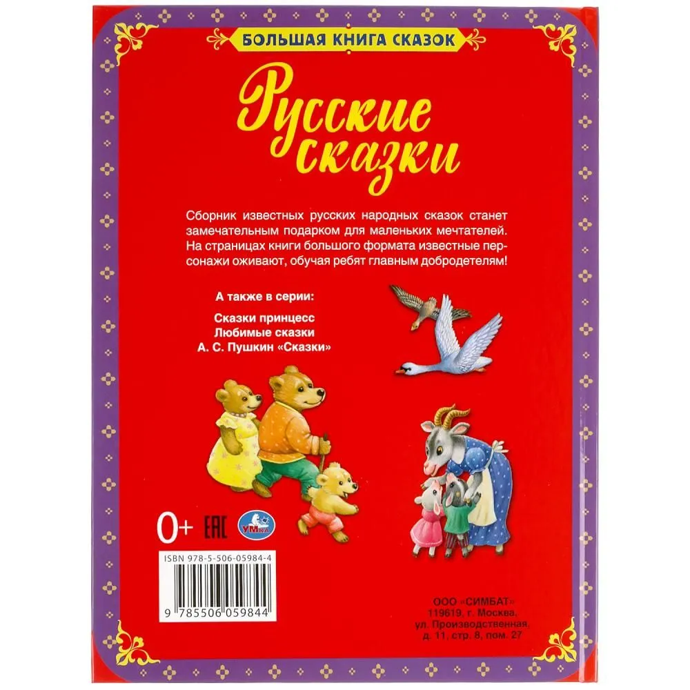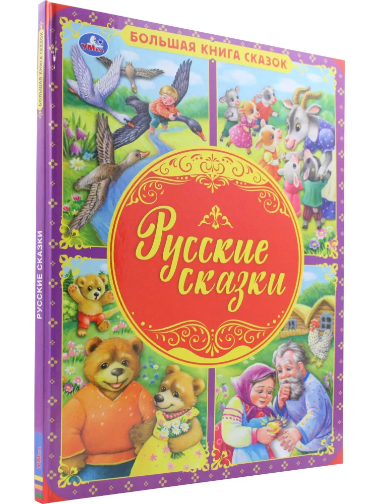 ОписаниеКнига «Русские сказки» из серии «Большая книга сказок» станет отличным подарком для ребёнка:- 4 сказки: «Три медведя», «Золотое яичко», «Гуси-лебеди», «Волк и коза»- красочные крупные иллюстрации- твёрдый переплёт- большой формат- красивые глянцевые страницыЯркий сборник сказок в обработке известных российских писателей (Л. Н. Толстого, К. Д. Ушинского, А. Н. Афанасьева) займёт достойное место в детской библиотеке. Красочные иллюстрации и увлекательные сказки непременно понравятся малышу. Страницы изготовлены из мелованной бумаги, они приятны на ощупь и их удобно листать.Читая вместе с родителями книгу ТМ «УМка», ребёнок будет развивать:- образное мышление- визуальное восприятие- внимание- память- речь