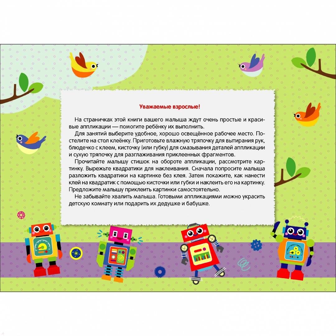 ОписаниеНа страничках этой книги вашего малыша ждут очень простые и красивые аппликации - помогите ребёнку их выполнить. Для занятий выберите удобное, хорошо освещённое рабочее место. Постелите на стол клеёнку. Приготовьте влажную тряпочку для вытирания рук, клей для смазывания деталей аппликации и сухую тряпочку для разглаживания приклеенных фрагментов.Аппликации для детей дошкольного возраста.На страничках этой книги вашего малыша ждут очень простые и красивые аппликации - помогите ребёнку их выполнить. Для занятий выберите удобное, хорошо освещённое рабочее место. Постелите на стол клеёнку. Приготовьте влажную тряпочку для вытирания рук, клей для смазывания деталей аппликации и сухую тряпочку для разглаживания приклеенных фрагментов.Аппликации для детей дошкольного возраста.