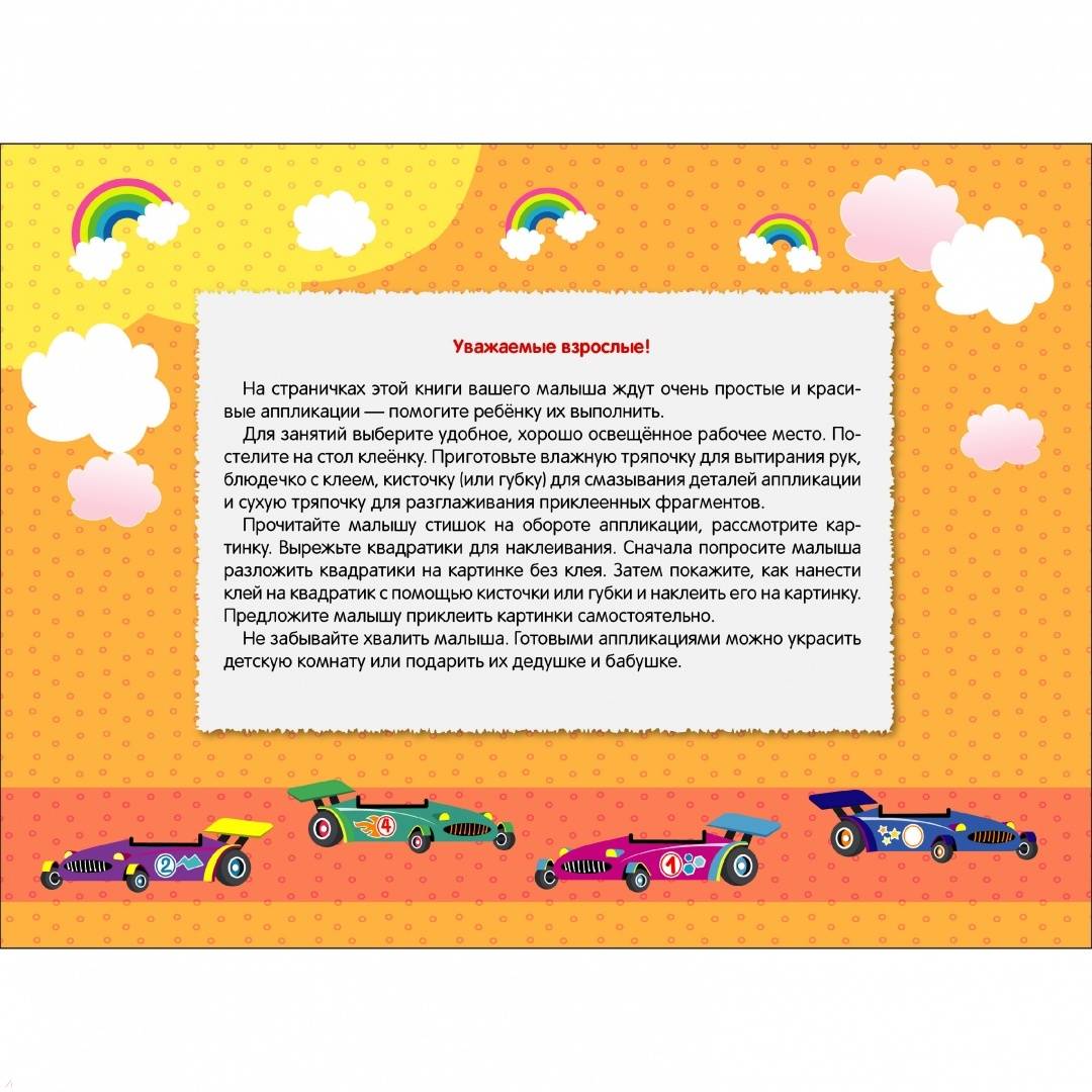 ОписаниеНа страничках этой книги вашего малыша ждут очень простые и красивые аппликации – помогите ребёнку их выполнить. Для занятий выберите удобное, хорошо освещённое рабочее место. Постелите на стол клеёнку. Приготовьте влажную тряпочку для вытирания рук, клей для смазывания деталей аппликации и сухую тряпочку для разглаживания приклеенных фрагментов.Аппликации для детей дошкольного возраста.На страничках этой книги вашего малыша ждут очень простые и красивые аппликации – помогите ребёнку их выполнить. Для занятий выберите удобное, хорошо освещённое рабочее место. Постелите на стол клеёнку. Приготовьте влажную тряпочку для вытирания рук, клей для смазывания деталей аппликации и сухую тряпочку для разглаживания приклеенных фрагментов.Аппликации для детей дошкольного возраста.