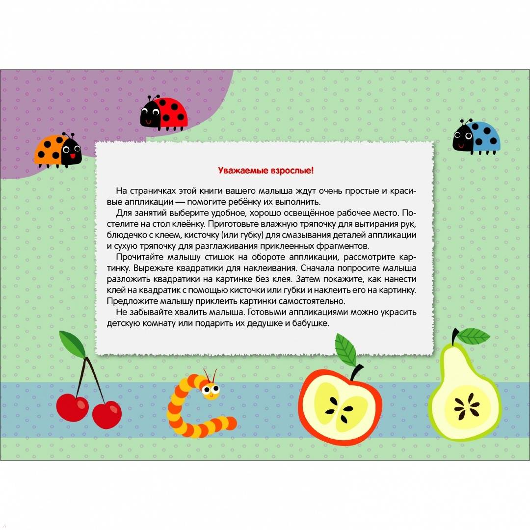 ОписаниеНа страничках этой книги вашего малыша ждут очень простые и красивые аппликации – помогите ребёнку их выполнить. Для занятий выберите удобное, хорошо освещённое рабочее место. Постелите на стол клеёнку. Приготовьте влажную тряпочку для вытирания рук, клей для смазывания деталей аппликации и сухую тряпочку для разглаживания приклеенных фрагментов.Аппликации для детей дошкольного возраста.На страничках этой книги вашего малыша ждут очень простые и красивые аппликации – помогите ребёнку их выполнить. Для занятий выберите удобное, хорошо освещённое рабочее место. Постелите на стол клеёнку. Приготовьте влажную тряпочку для вытирания рук, клей для смазывания деталей аппликации и сухую тряпочку для разглаживания приклеенных фрагментов.Аппликации для детей дошкольного возраста.