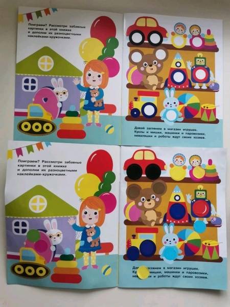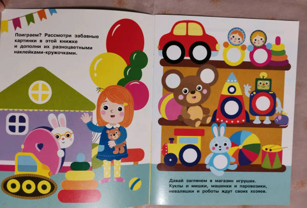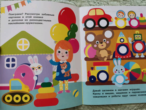 ОписаниеПриклеивая на картинки в этой книге яркие разноцветные многоразовые наклейки-кружочки, ваш малыш сможет повторять названия цветов и предметов, развивать мелкую моторику и усидчивость.Для детей до 3-х лет.Приклеивая на картинки в этой книге яркие разноцветные многоразовые наклейки-кружочки, ваш малыш сможет повторять названия цветов и предметов, развивать мелкую моторику и усидчивость.Для детей до 3-х лет.