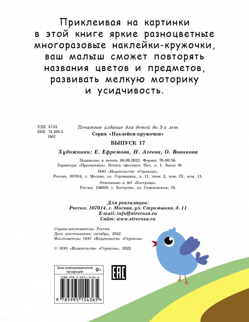 Объем, стр. 10 ISBN 978-5-9951-5436-5 Автор Ефремова Екатерина, Агеева Н., Вовикова О. Художник Ефремова Екатерина, Агеева Н., Вовикова О. Серия Наклейки-кружочки Язык Русский Год издания книги 2022 Тип обложки Мягкий переплет Иллюстрации Цветные Вес, г 38 Размеры 210х160х2 мм - Отзывы