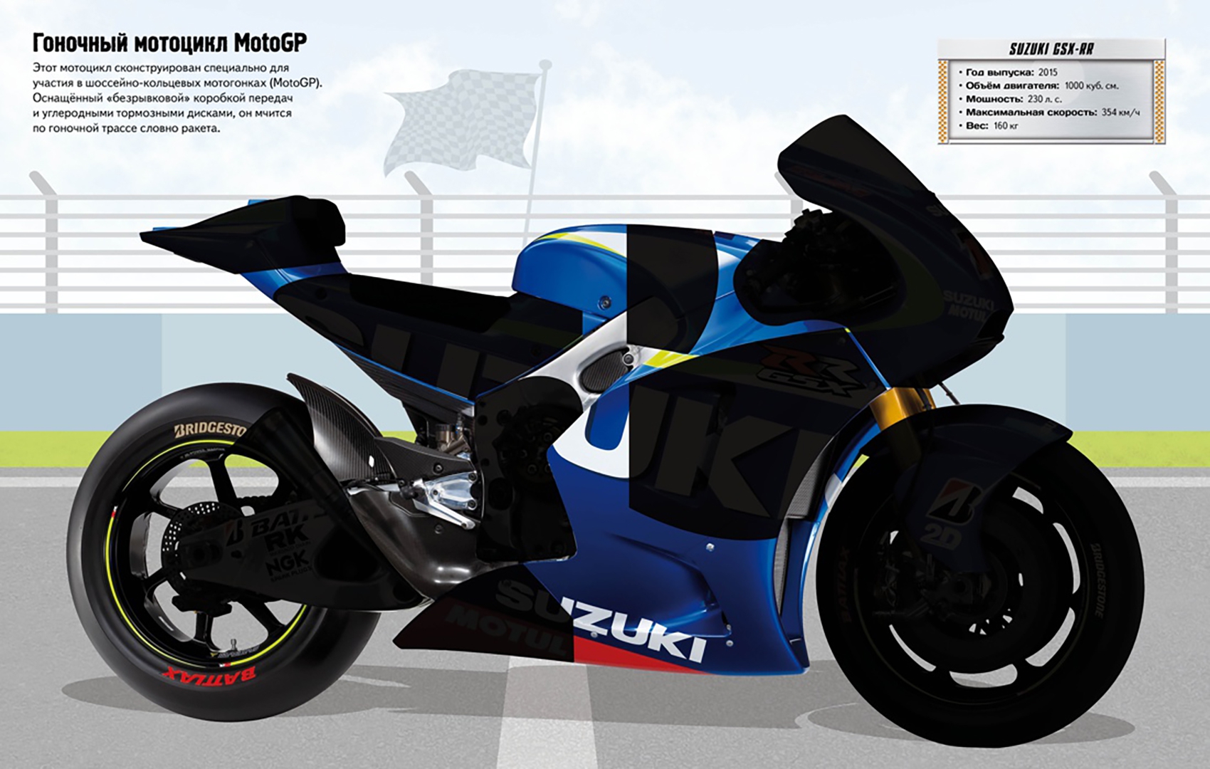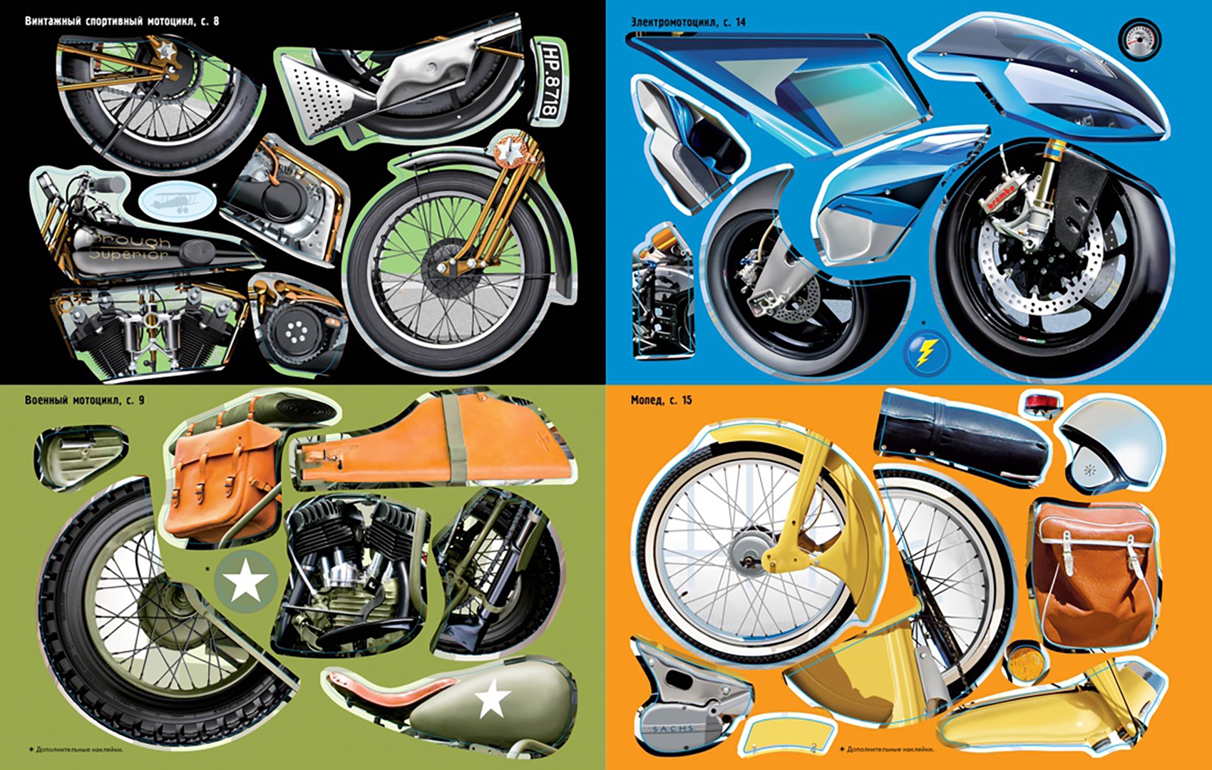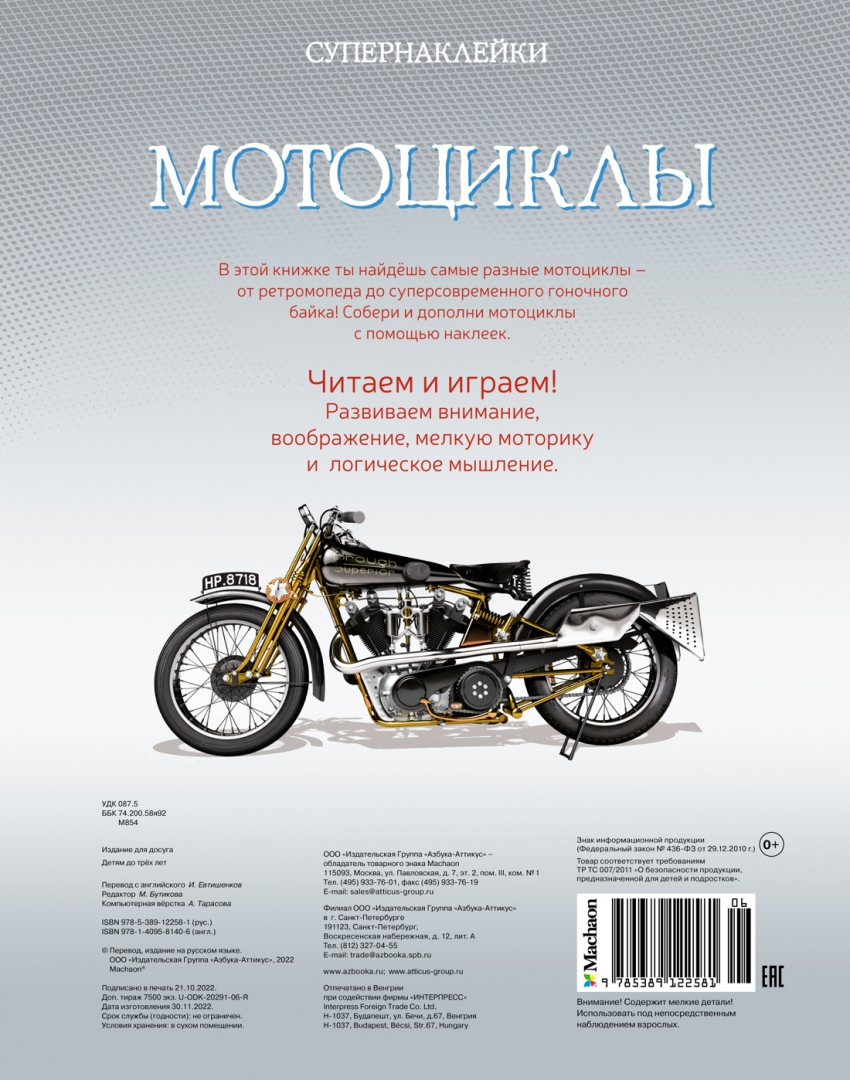 ОписаниеВ этой книжке ты найдёшь самые разные мотоциклы - от ретро-мопеда до суперсовременного гоночного байка! Собери и дополни мотоциклы с помощью наклеек. Читаем и играем! Развиваем внимание, воображение, мелкую моторику и художественный вкус. Играя с книгами из серии "Супернаклейки", ребенок развивает мелкую моторику, аккуратность и чувство прекрасного. Добрые и яркие картинки интересно разглядывать, а небольшие познавательные истории помогают расширять кругозор маленьких читателей. Книги яркие и качественные: у них плотные страницы, глянцевая бумага и приятная обложка. Ребенок сможет играть с книжкой в течение пяти часов, а благодаря удобному формату взять любимую историю с собой в поездку. "Супернаклейки" точно понравятся и детям, и их родителям!В этой книжке ты найдёшь самые разные мотоциклы - от ретро-мопеда до суперсовременного гоночного байка! Собери и дополни мотоциклы с помощью наклеек. Читаем и играем! Развиваем внимание, воображение, мелкую моторику и художественный вкус. Играя с книгами из серии "Супернаклейки", ребенок развивает мелкую моторику, аккуратность и чувство прекрасного. Добрые и яркие картинки интересно разглядывать, а небольшие познавательные истории помогают расширять кругозор маленьких читателей. Книги яркие и качественные: у них плотные страницы, глянцевая бумага и приятная обложка. Ребенок сможет играть с книжкой в течение пяти часов, а благодаря удобному формату взять любимую историю с собой в поездку. "Супернаклейки" точно понравятся и детям, и их родителям!