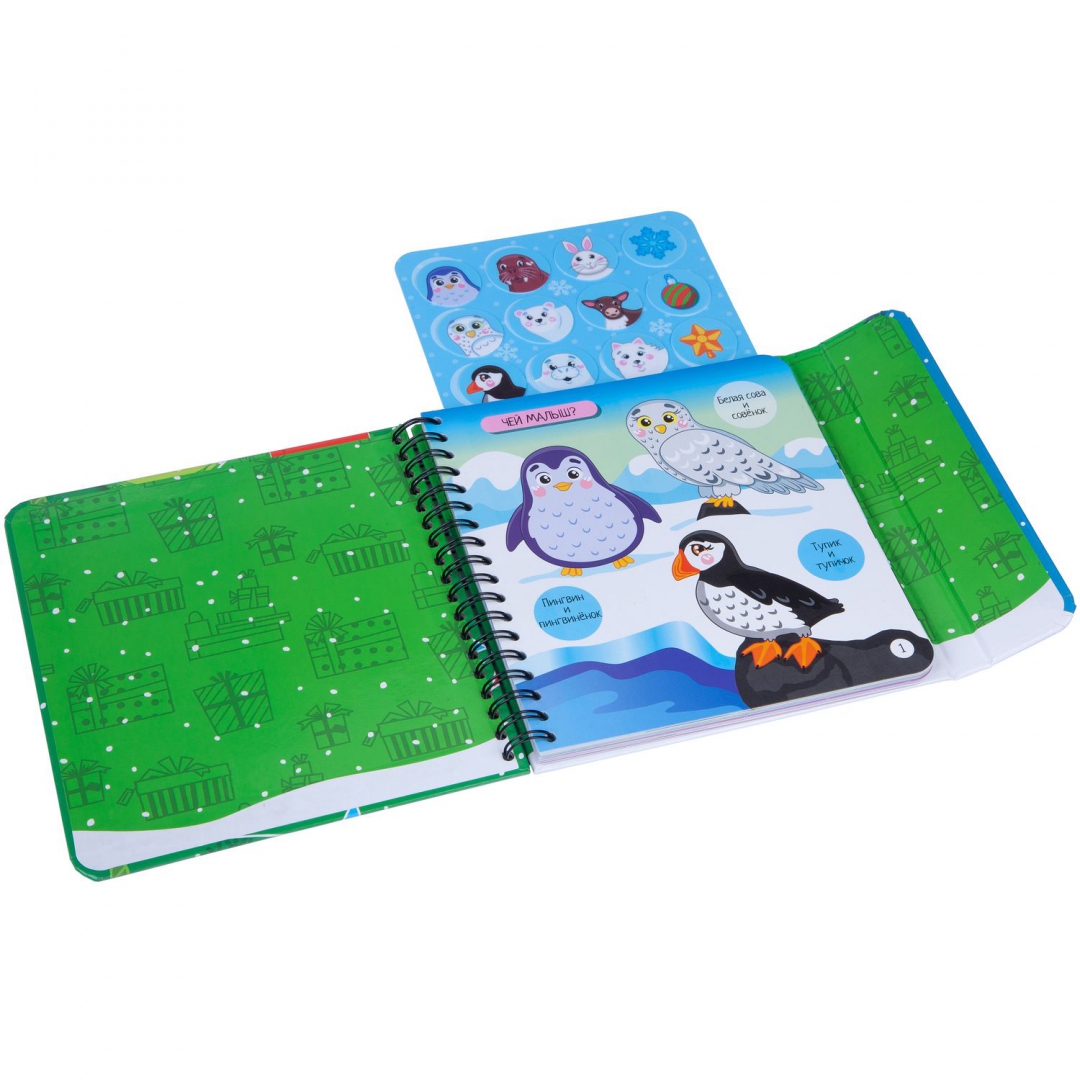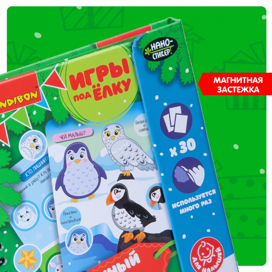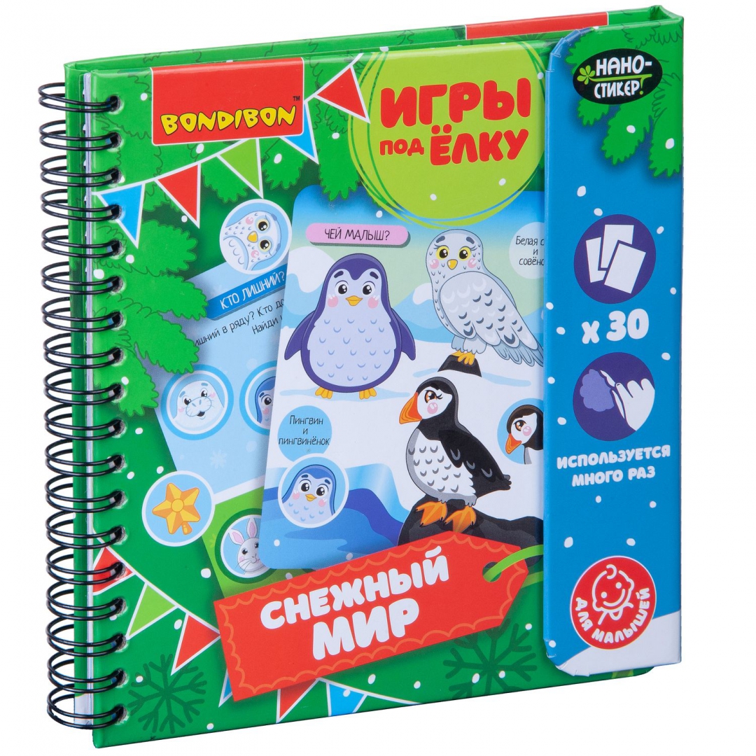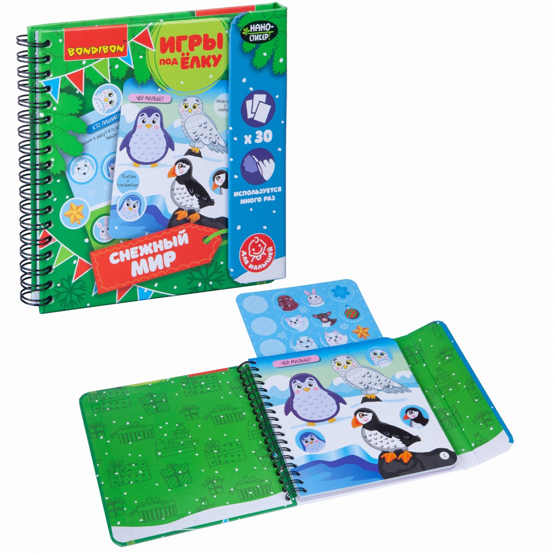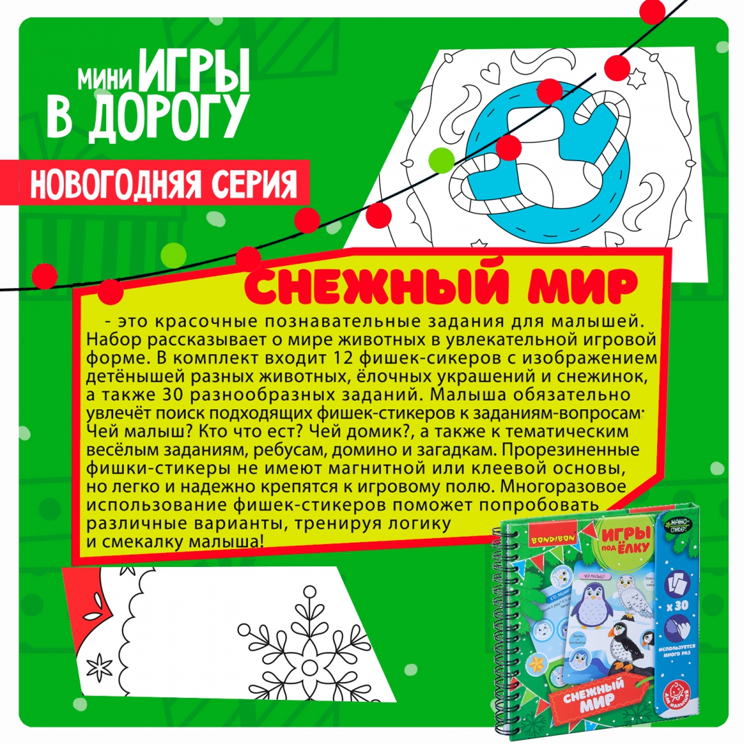 ОписаниеВместе с замечательными мини-играми под ёлку от BONDIBON вы прекрасно проведете свой досуг в новогодние праздники! Красочные и интересные, они помогут провести время празднично и с пользой. Игры под ёлку СНЕЖНЫЙ МИР - это набор красочных познавательных заданий для малышей, рассказывающих о мире животных в увлекательной игровой форме. В комплект входит 12 фишек-стикеров с изображением детёнышей разных животных, ёлочных украшений и снежинки, а также 30 разнообразных заданий. Малыша обязательно увлечёт поиск подходящих фишек-стикеров к заданиям-вопросам: Чей малыш? Кто что ест? Чей домик?, а также к тематическим весёлым заданиям, ребусам, домино и загадкам. Прорезиненные фишки-стикеры не имеют магнитной или клеевой основы, но легко и надежно крепятся к игровому полю. Многоразовое использование фишек-стикеров поможет попробовать различные варианты, тренируя логику и смекалку малыша!Для детей от 3-х лет.Сделано в Китае.Вместе с замечательными мини-играми под ёлку от BONDIBON вы прекрасно проведете свой досуг в новогодние праздники! Красочные и интересные, они помогут провести время празднично и с пользой. Игры под ёлку СНЕЖНЫЙ МИР - это набор красочных познавательных заданий для малышей, рассказывающих о мире животных в увлекательной игровой форме. В комплект входит 12 фишек-стикеров с изображением детёнышей разных животных, ёлочных украшений и снежинки, а также 30 разнообразных заданий. Малыша обязательно увлечёт поиск подходящих фишек-стикеров к заданиям-вопросам: Чей малыш? Кто что ест? Чей домик?, а также к тематическим весёлым заданиям, ребусам, домино и загадкам. Прорезиненные фишки-стикеры не имеют магнитной или клеевой основы, но легко и надежно крепятся к игровому полю. Многоразовое использование фишек-стикеров поможет попробовать различные варианты, тренируя логику и смекалку малыша!Для детей от 3-х лет.Сделано в Китае.