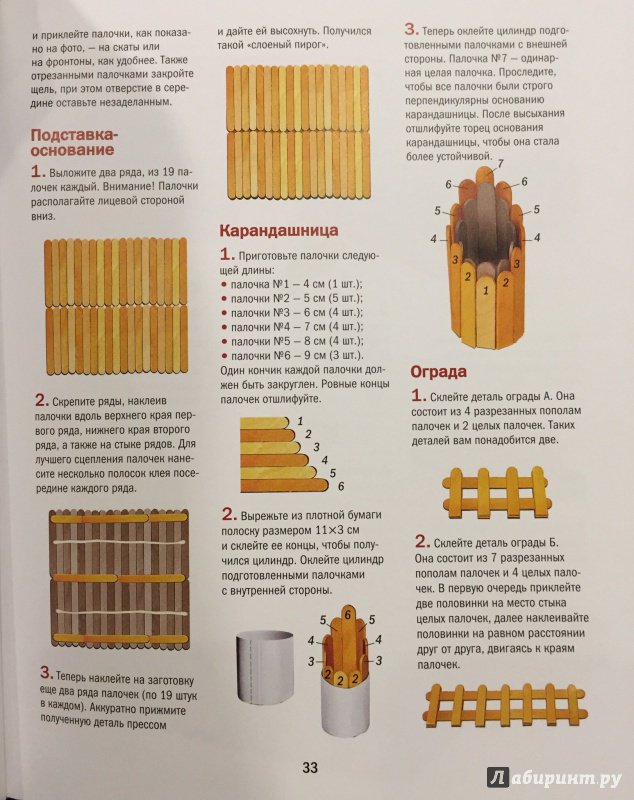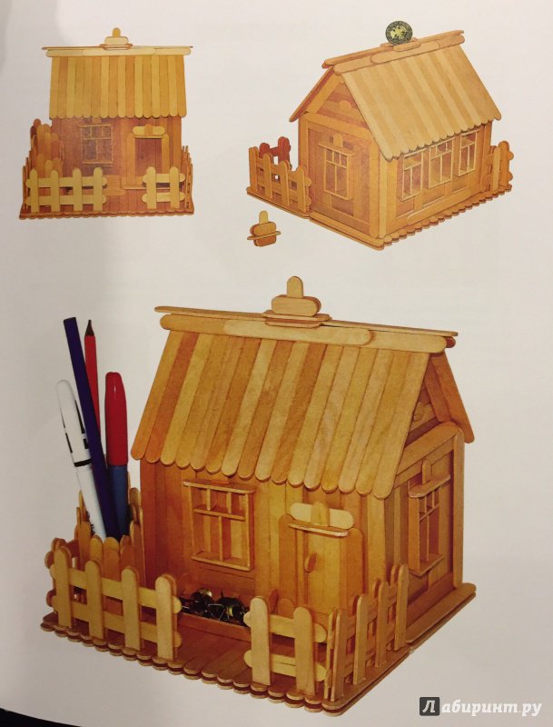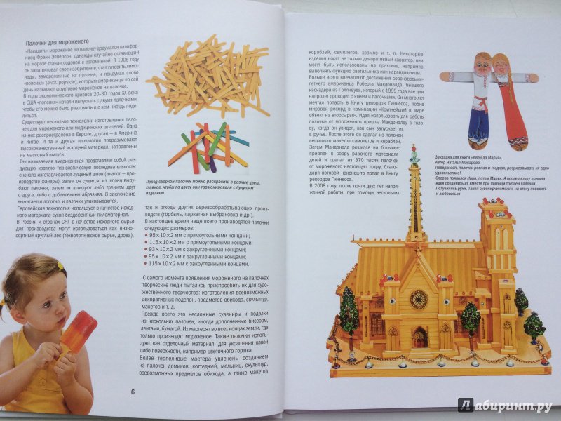 ОписаниеМоделирование из палочек от мороженого - совершенно новый вид творчества. Работать с палочками так просто и интересно! Странно, что никто раньше не нашел им лучшего применения, чем отправить в мусорную корзину, а ведь это готовый материал для работы. Из палочек можно делать удивительные модели: корабли, башни, замки, мельницы и даже целые соборы! Это занятие придется по душе не только мужской половине человечества, изначально склонной к конструированию, - прекрасная половина найдет для себя простые и практичные модели: легкие и изящные подставки под горячее, вазы для фруктов, карандашницы. Подробные инструкции и пошаговые иллюстрации не только гарантируют успех даже начинающему мастеру, но и вдохновят его на самостоятельное творчество.Моделирование из палочек от мороженого - совершенно новый вид творчества. Работать с палочками так просто и интересно! Странно, что никто раньше не нашел им лучшего применения, чем отправить в мусорную корзину, а ведь это готовый материал для работы. Из палочек можно делать удивительные модели: корабли, башни, замки, мельницы и даже целые соборы! Это занятие придется по душе не только мужской половине человечества, изначально склонной к конструированию, - прекрасная половина найдет для себя простые и практичные модели: легкие и изящные подставки под горячее, вазы для фруктов, карандашницы. Подробные инструкции и пошаговые иллюстрации не только гарантируют успех даже начинающему мастеру, но и вдохновят его на самостоятельное творчество.