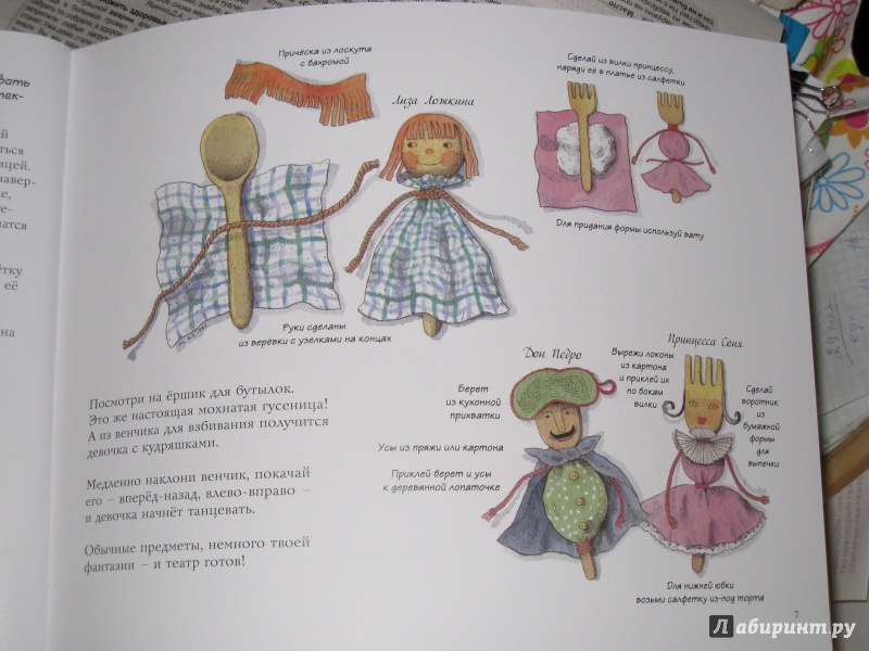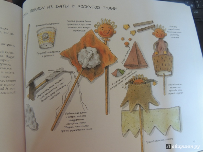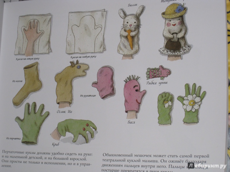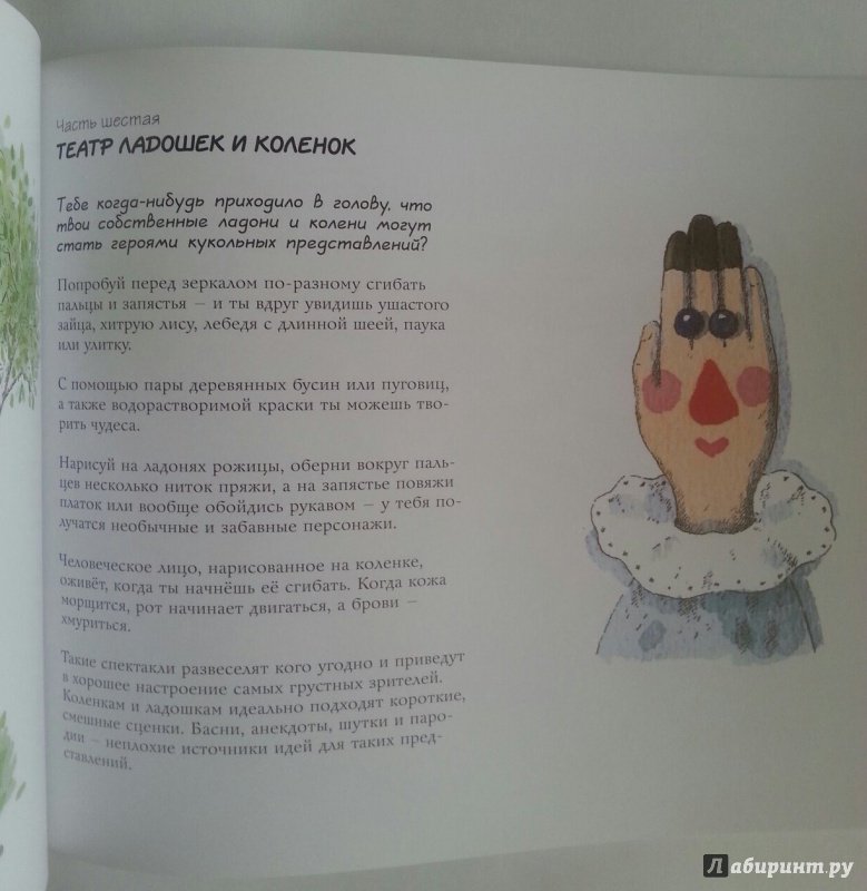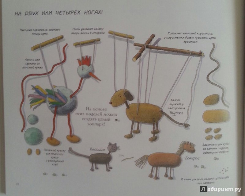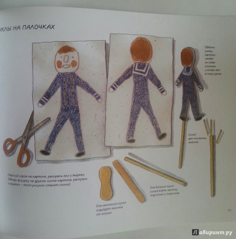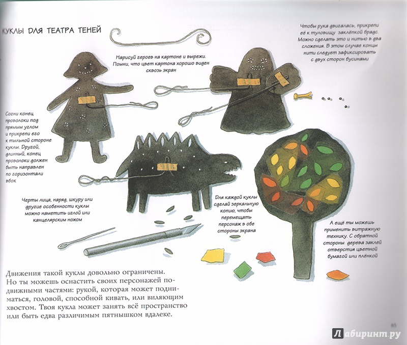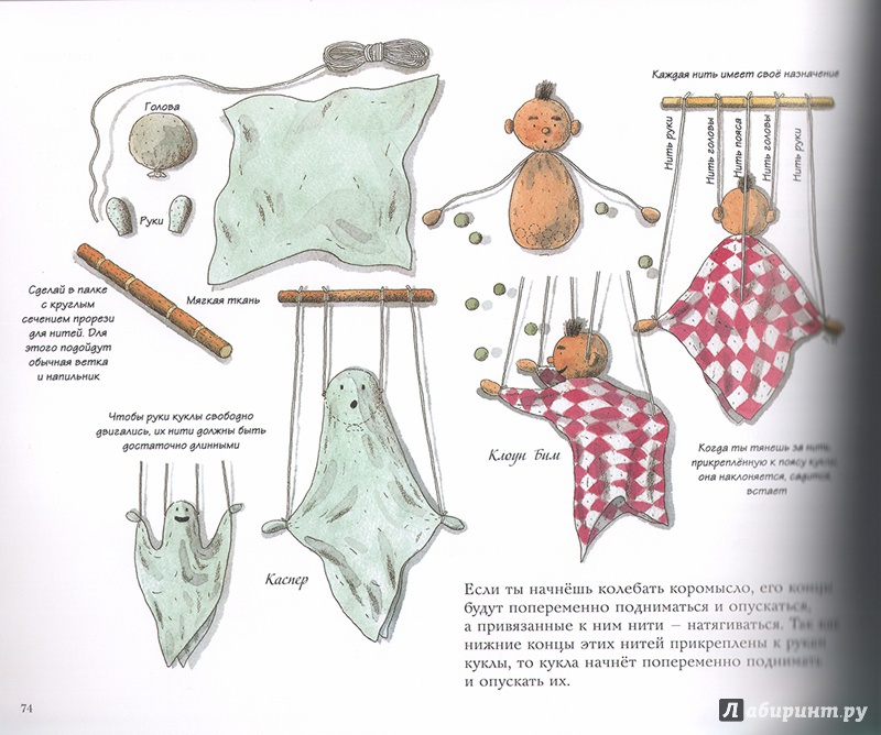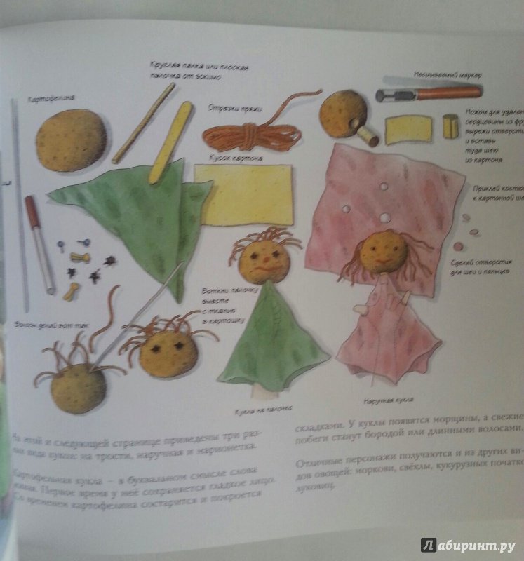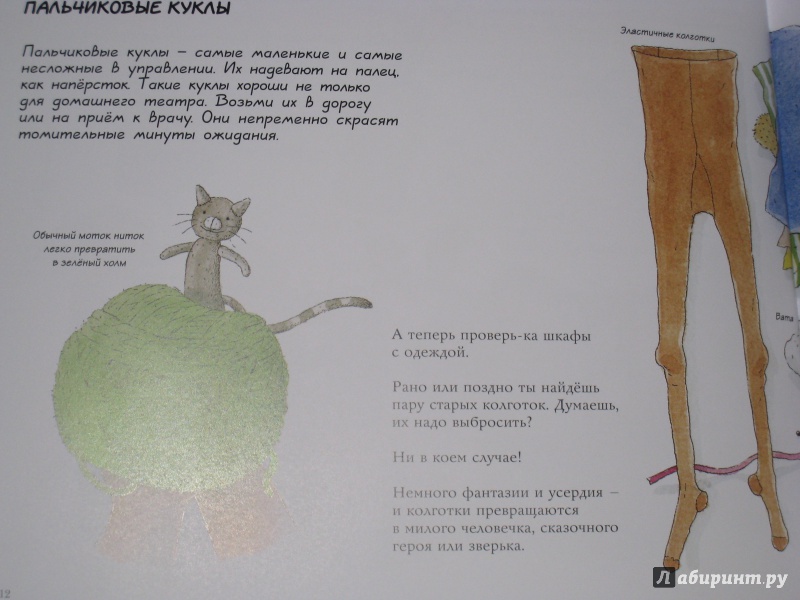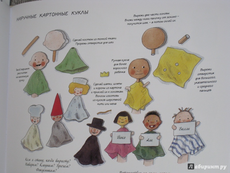 ОписаниеКукольный театр прекрасен сам по себе. Его обожают и взрослые, и дети. Но если персонажи, костюмы и сцена сделаны своими руками, если кукловоды - сами дети, а также мамы, папы, другие члены семьи и друзья, то кукольный театр трансформируется в суперволшебное, невероятно захватывающее действо.Книга Майи Барик, много лет работающей в мастерской кукольного театра, в Хельсинки (Финляндия), - единственная и неповторимая в своем жанре. А всё потому, что автор с упоением описывает процесс создания кукол буквально из ничего: из предметов домашнего обихода - старых колготок, ложек-вилок, веничков и щёток; из камней и веток; из яичной скорлупы и воздушных шариков; из лоскутов и папье-маше. Даже из клубней картофеля! Все стадии создания театра - от и до, а также все виды кукол - перчаточные, тростевые, пикабу, марионетки и т.д. - вдохновенно, остроумно и в то же время очень четко и доходчиво нарисованы Кристиной Лоухи. Стоит рассмотреть всего две-три страницы книги - как руки сами тянутся скорее начать мастерить!Несомненная педагогическая польза книги состоит в том, что она будит детское воображение, вовлекает в так называемую "режиссёрскую игру" - очень важную для развития ребёнка, способствует преодолению стеснительности и "зажатости", формирует полезные навыки (шить, мастерить, клеить, рисовать, вырезать), приучает к последовательности действий. Но главное - эта книга очаровывает, увлекает и объединяет и взрослого, и ребёнка. Работать с книгой уместно и в детском саду, и в школе, и дома, и на даче, и в театральных кружках. Рекомендуется детям всех возрастов, а также их родителям. Будет полезна педагогам дополнительного художественного образования и руководителям детских театрально-кукольных студий.Для старшего дошкольного и младшего школьного возраста.СвернутьКукольный театр прекрасен сам по себе. Его обожают и взрослые, и дети. Но если персонажи, костюмы и сцена сделаны своими руками, если кукловоды - сами дети, а также мамы, папы, другие члены семьи и друзья, то кукольный театр трансформируется в суперволшебное, невероятно захватывающее действо.Книга Майи Барик, много лет работающей в мастерской кукольного театра, в Хельсинки (Финляндия), - единственная и неповторимая в своем жанре. А всё потому, что автор с упоением описывает процесс создания кукол буквально из ничего: из предметов домашнего обихода - старых колготок, ложек-вилок, веничков и щёток; из камней и веток; из яичной скорлупы и воздушных шариков; из лоскутов и папье-маше. Даже из клубней картофеля! Все стадии создания театра - от и до, а также все виды кукол - перчаточные, тростевые, пикабу, марионетки и т.д. - вдохновенно, остроумно и в то же время очень четко и доходчиво нарисованы Кристиной Лоухи. Стоит рассмотреть всего две-три страницы книги - как руки сами тянутся скорее начать мастерить!Несомненная педагогическая польза книги состоит в том, что она будит детское воображение, вовлекает в так называемую "режиссёрскую игру" - очень важную для развития ребёнка, способствует преодолению стеснительности и "зажатости", формирует полезные навыки (шить, мастерить, клеить, рисовать, вырезать), приучает к последовательности действий. Но главное - эта книга очаровывает, увлекает и объединяет и взрослого, и ребёнка. Работать с книгой уместно и в детском саду, и в школе, и дома, и на даче, и в те