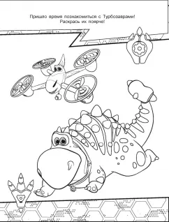 ОписаниеДа-да, динозавры существуют! Они большие, сильные и умеют превращаться в различные машины и механизмы. А ещё они добрые. Раскрась любимых героев — сделай мир Турбозавров ещё ярче!Раскраски по мотивам мультсериала «Турбозавры». Петя и Катя веселятся со своими друзьями-динозаврами. Эти необычные животные добрые и верные. Они превращаются в машины и механизмы: дрон, бульдозер, грузовик-эвакуатор, подъемный кран, гоночный автомобиль и даже гигантский робот. Вместе дети и турбозавры справляются с неприятными задачками, помогают бабушке с дедушкой и отлично проводят время.