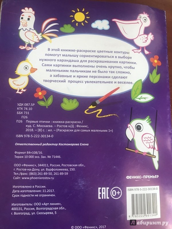 Объем, стр. 8 ISBN 978-5-222-30134-0, 978-5-222-31484-5, 978-5-222-32395-3, 978-5-222-33356-3 Автор Москаева Серафима Художник Москаева Серафима Серия Раскраска для самых маленьких Год издания книги 2020 Тип обложки Мягкий переплет Иллюстрации Черно-белые + цветные Вес, г 40г Размеры 262х200х1 мм - Отзывы