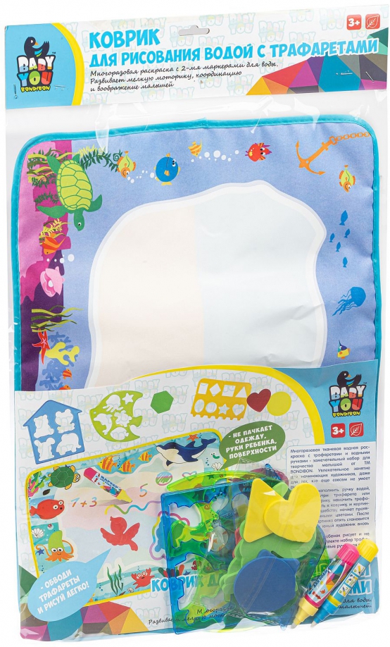 ОписаниеМногоразовая тканевая водная раскраска с трафаретами и водными ручками - замечательный набор для творчества малышей от TM BONDIBON. Водная раскраска послужит увлекательным занятием для юных начинающих художников, даже для тех, кто еще совсем не умеет рисовать. Достаточно наполнить ручку водой, провести внутри трафарета или просто по раскраске, намочить трафарет и приложить к коврику, картинка, как по волшебству, начнет проявляться различными цветами. После высыхания картинка опять становится бесцветной, и юный художник вновь может творить. Безопасная, ребенок рисует и не пачкается, в комплекте набор трафаретов, 2 пластиковые ручки для воды.Многоразовая тканевая водная раскраска с трафаретами и водными ручками - замечательный набор для творчества малышей от TM BONDIBON. Водная раскраска послужит увлекательным занятием для юных начинающих художников, даже для тех, кто еще совсем не умеет рисовать. Достаточно наполнить ручку водой, провести внутри трафарета или просто по раскраске, намочить трафарет и приложить к коврику, картинка, как по волшебству, начнет проявляться различными цветами. После высыхания картинка опять становится бесцветной, и юный художник вновь может творить. Безопасная, ребенок рисует и не пачкается, в комплекте набор трафаретов, 2 пластиковые ручки для воды.