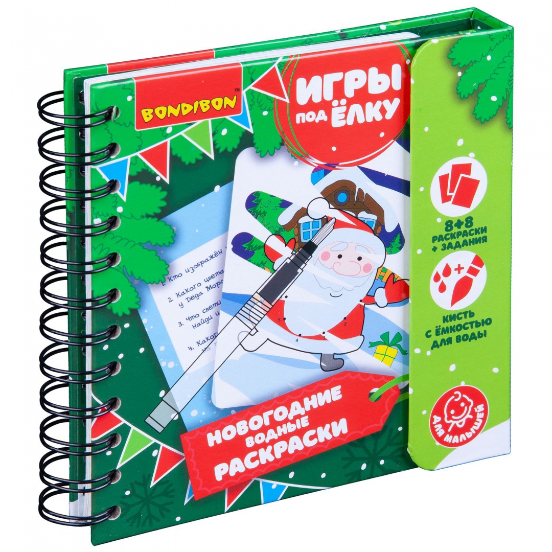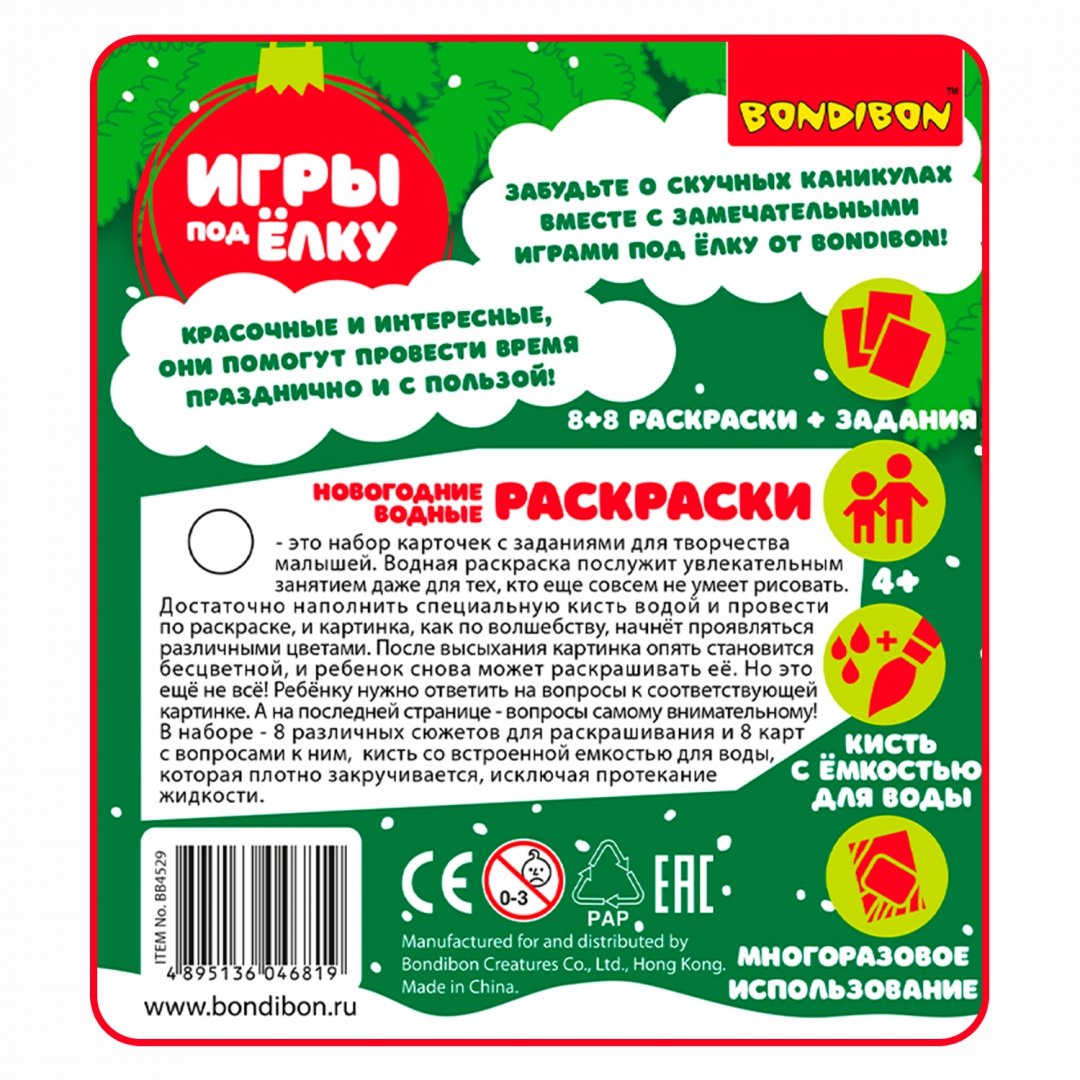ОписаниеВместе с замечательными мини-играми под ёлку от BONDIBON вы прекрасно проведете свой досуг в новогодние праздники! Красочные и интересные, они помогут провести время празднично и с пользой.Новогодние водные раскраски - это набор карточек с заданиями для творчества малышей. Водная раскраска послужит увлекательным занятием даже для тех, кто еще совсем не умеет рисовать. Достаточно наполнить специальную кисть водой и провести по раскраске, и картинка, как по волшебству, начнёт проявляться различными цветами. После высыхания картинка опять становится бесцветной, и ребенок снова может раскрашивать её. Но это ещё не всё! Ребёнку нужно ответить на вопросы к соответствующей картинке. А на последней странице - вопросы самому внимательному!В наборе - 8 различных сюжетов для раскрашивания и 8 карт с вопросами к ним, кисть со встроенной ёмкостью для воды,^ которая плотно закручивается, исключая протекание жидкости.Вместе с замечательными мини-играми под ёлку от BONDIBON вы прекрасно проведете свой досуг в новогодние праздники! Красочные и интересные, они помогут провести время празднично и с пользой.Новогодние водные раскраски - это набор карточек с заданиями для творчества малышей. Водная раскраска послужит увлекательным занятием даже для тех, кто еще совсем не умеет рисовать. Достаточно наполнить специальную кисть водой и провести по раскраске, и картинка, как по волшебству, начнёт проявляться различными цветами. После высыхания картинка опять становится бесцветной, и ребенок снова может раскрашивать её. Но это ещё не всё! Ребёнку нужно ответить на вопросы к соответствующей картинке. А на последней странице - вопросы самому внимательному!В наборе - 8 различных сюжетов для раскрашивания и 8 карт с вопросами к ним, кисть со встроенной ёмкостью для воды,^ которая плотно закручивается, исключая протекание жидкости.