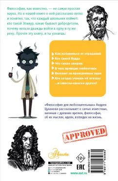 ОписаниеФилософия, как известно, - не самая простая наука. Чтобы в ней как следует разобраться, нужно прочесть немало книг и трудов античных, средневековых, современных философов. Книга Андрея Львовича Цуканова "Философия для любознательных" будет полезна как школьникам 12-16 лет, так и студентам филологических вузов. В ней понятно рассказывается об основных направлениях философии, основных понятиях, учениях таких мыслителей, как Лао-цзы, Демокрит, Сократ, Платон, Аврелий Августин, Френсис Бэкон, Владимир Соловьев. Вы узнаете, какие бывают добродетели, почему нельзя дважды войти в одну и ту же реку, почему человек есть "мыслящий тростник" и многое-многое другое.Для среднего школьного возраста.Философия, как известно, - не самая простая наука. Чтобы в ней как следует разобраться, нужно прочесть немало книг и трудов античных, средневековых, современных философов. Книга Андрея Львовича Цуканова "Философия для любознательных" будет полезна как школьникам 12-16 лет, так и студентам филологических вузов. В ней понятно рассказывается об основных направлениях философии, основных понятиях, учениях таких мыслителей, как Лао-цзы, Демокрит, Сократ, Платон, Аврелий Августин, Френсис Бэкон, Владимир Соловьев. Вы узнаете, какие бывают добродетели, почему нельзя дважды войти в одну и ту же реку, почему человек есть "мыслящий тростник" и многое-многое другое.Для среднего школьного возраста.