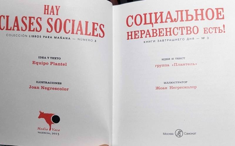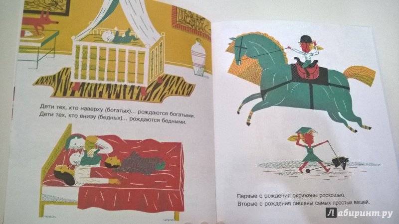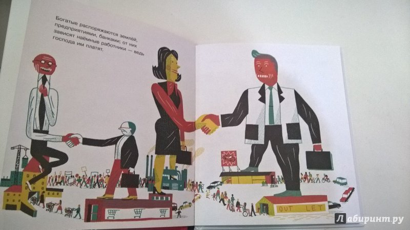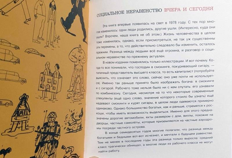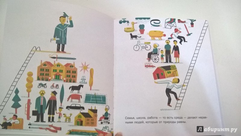 ОписаниеПосле прочтения этой книги старые сказки о принцах и принцессах звучат и воспринимаются по-другому. Ведь речь в ней об экономическом и социальном неравенстве, которое существовало в прошлых веках и существует до сих пор. Еще полвека назад многие полагали, что разница между богатыми и бедными вот-вот исчезнет, и все люди будут иметь равные возможности, не голодать и не бояться за свое будущее. Тем не менее, разрыв между уровнем жизни людей внутри стран и между разными странами становится только больше: кто-то живет в невиданной роскоши, многим из тех, кто считался средним классом, пришлось себя ограничивать, а миллионы людей с трудом находят работу и средства к существованию. Как же развиваться обществу, чтобы достичь идеалов справедливости? "Социальное неравенство есть!" - одна из четырех книг в серии "Книги завтрашнего дня". Серия рассказывает о политике и социологии самым юным читателям - ученикам начальной школы. Впервые серия вышла в 1977-1978 годах в Барселоне. Недавно она была переиздана с новыми иллюстрациями в Испании и получила высшую премию Болонской книжной ярмарки за лучший nonfiction проект для детей.Художник Жоан Негресколор: В качестве иллюстратора Жоан работает в рекламе, в газетах и журналах, оформляет детские книги. Занимается он также анимацией. Кроме того, он сотрудничает с несколькими компаниями, которые делают его город более уютным. Каждый новый заказ помогает ему узнать что-нибудь новое о своей профессии. Когда Жоан не рисует на заказ, он рисует для самого себя. Так, побывав в Мексике, он вернулся оттуда с целым чемоданом рисунков, выполненных на чём попало - от всевозможных тетрадок до листочков самодельной бумаги. В последнее время всё, что он рисует, посвящается его сыну Аметсу, который родился, пока художник иллюстрировал эту книгу. А сам Жоан - удивительное совпадение! - появился на свет, когда эта книга впервые была издана.Группа "Плантель" - это группа испанских журналистов, социологов и политиков, которые собрались в середине 70-х годов специально для того, чтобы сделать серию злободневных книг о политике для самых юных читателей.Для дошкольного, младшего и среднего школьного возраста.СвернутьПосле прочтения этой книги старые сказки о принцах и принцессах звучат и воспринимаются по-другому. Ведь речь в ней об экономическом и социальном неравенстве, которое существовало в прошлых веках и существует до сих пор. Еще полвека назад многие полагали, что разница между богатыми и бедными вот-вот исчезнет, и все люди будут иметь равные возможности, не голодать и не бояться за свое будущее. Тем не менее, разрыв между уровнем жизни людей внутри стран и между разными странами становится только больше: кто-то живет в невиданной роскоши, многим из тех, кто считался средним классом, пришлось себя ограничивать, а миллионы людей с трудом находят работу и средства к существованию. Как же развиваться обществу, чтобы достичь идеалов справедливости? "Социальное неравенство есть!" - одна из четырех книг в серии "Книги завтрашнего дня". Серия рассказывает о политике и социологии самым юным читателям - ученикам начальной школы. Впервые серия вышла в 1977-1978 годах в Барселоне. Недавно она была переиздана с новыми иллюстрациями в Испании и получила высшую премию Болонской книжной ярмарки за лучший nonfiction проект для детей.Художник