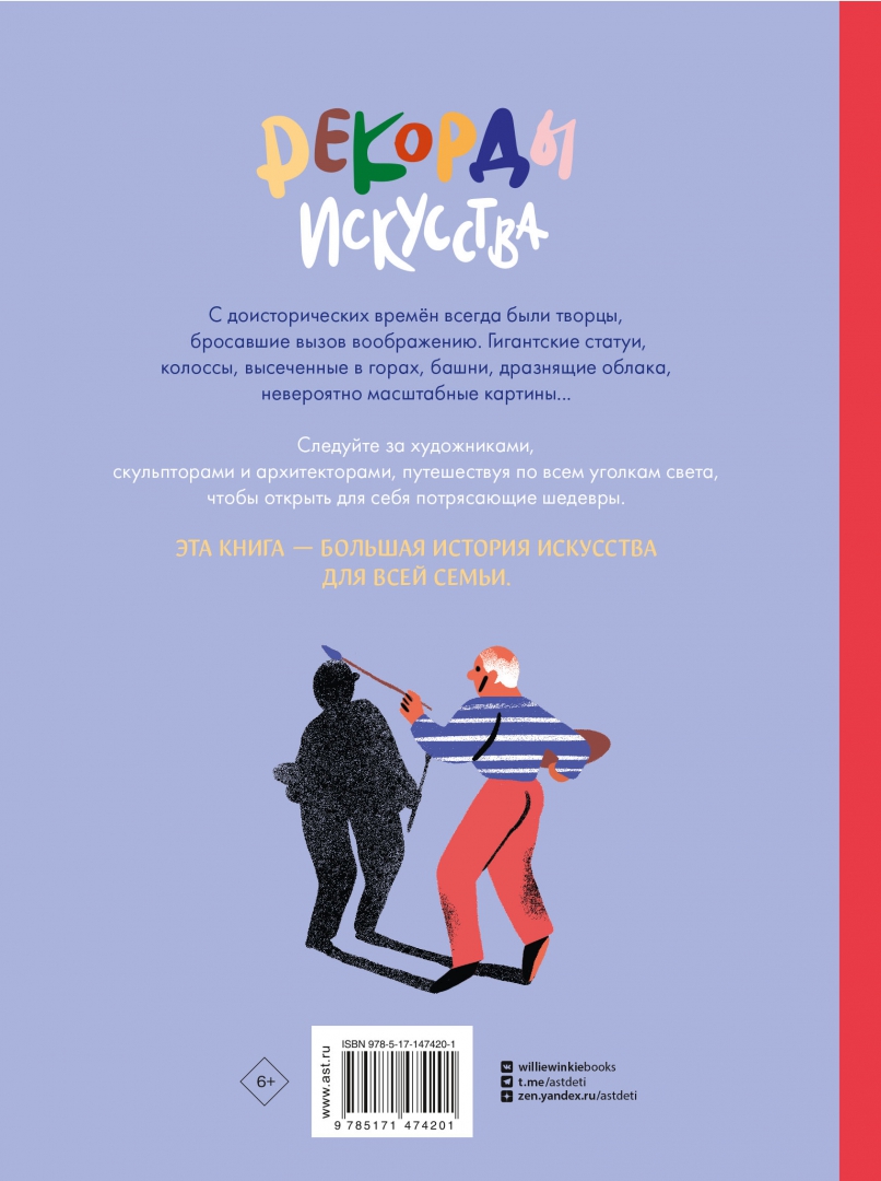 ОписаниеЭти гении сумасшедшие! Во всём мире во все времена создавались произведения искусства, которые бросали вызов воображению. Гигантские статуи, колоссы, высеченные в горах, башни, уходящие в облака, огромные дворцы и картины... Познакомьтесь с художниками, скульпторами и архитекторами и отправляйтесь вместе с ними в кругосветное путешествие, чтобы открыть самые впечатляющие шедевры.Кто является чемпионом по автопортретам? Где находится самая большая большая статуя в мире? И кто устроил самый громкий художественный скандал?"Рекорды искусства" - это оригинальный и увлекательный способ познакомиться с удивительными шедеврами для всей семьи.Для младшего школьного возраста.Эти гении сумасшедшие! Во всём мире во все времена создавались произведения искусства, которые бросали вызов воображению. Гигантские статуи, колоссы, высеченные в горах, башни, уходящие в облака, огромные дворцы и картины... Познакомьтесь с художниками, скульпторами и архитекторами и отправляйтесь вместе с ними в кругосветное путешествие, чтобы открыть самые впечатляющие шедевры.Кто является чемпионом по автопортретам? Где находится самая большая большая статуя в мире? И кто устроил самый громкий художественный скандал?"Рекорды искусства" - это оригинальный и увлекательный способ познакомиться с удивительными шедеврами для всей семьи.Для младшего школьного возраста.