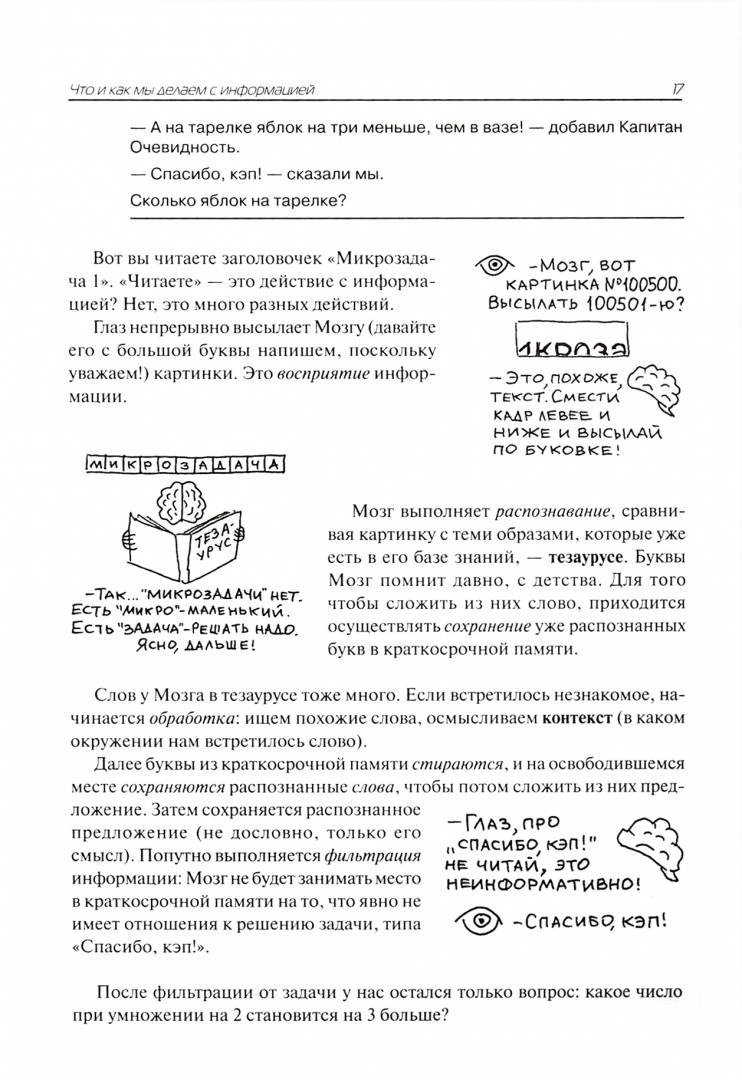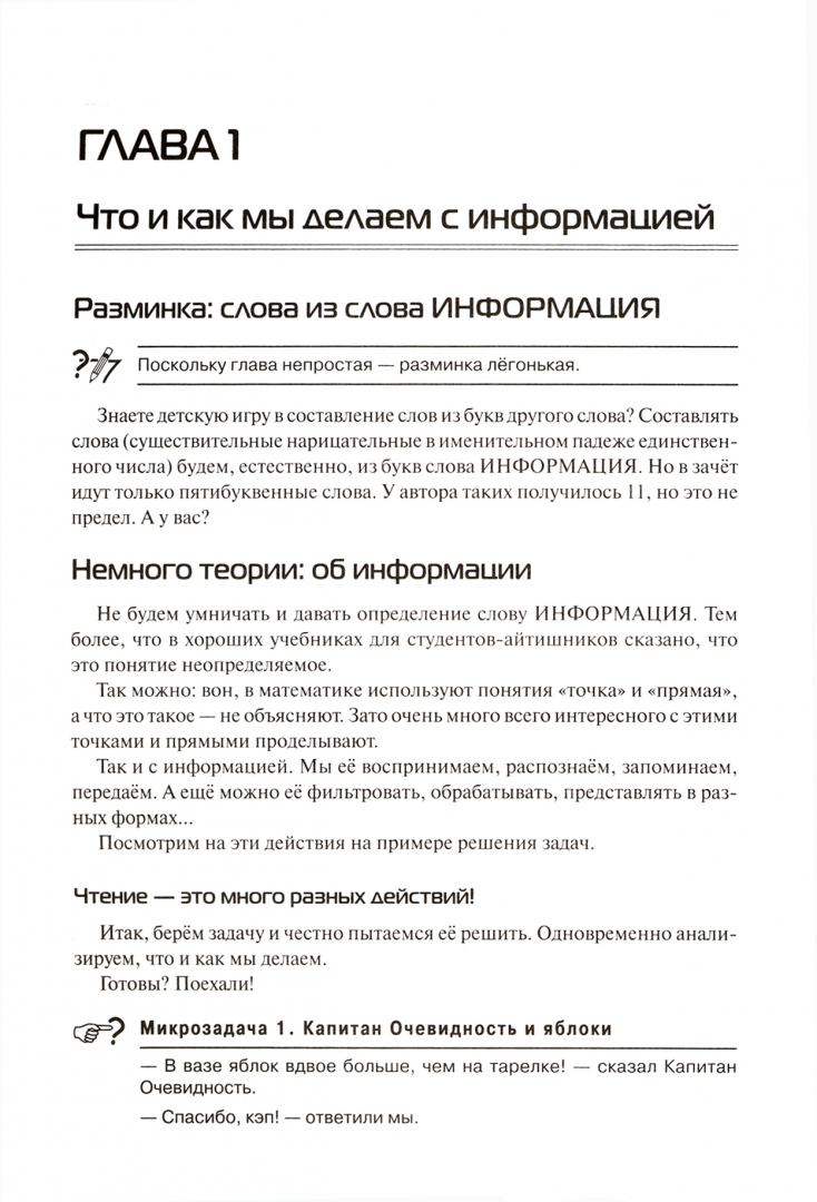 ОписаниеИзначальное значение слова «информатика» (придуманного, кстати, задолго до компьютеров) – наука об эффективной работе с информацией. Именно этой информатике посвящена книга. Это сборник материалов для выработки информационной культуры – умения работать осознанно, быстро и результативно: найти нужные данные, структурировать их, выбрать форму представления и инструменты для работы.В каждой главе – немного нескучной и очень практичной теории, задачи, упражнения, тесты. Чёткой привязки к школьной программе нет, книга значительно шире учебной дисциплины.Книга адресована подросткам 12-15 лет, но будет интересна и их родителям – можно читать по очереди, решать вместе или соревноваться. Уровень – от начального до олимпиадного. Одни задания выполняются на компьютере (доступен электронный архив рабочих материалов), для других потребуется бумага и ручка, третьи – просто повод подумать или поэкспериментировать.Не верите, что теория бывает нескучной, а упражнения – забавными? А вы откройте книгу наугад…СвернутьИзначальное значение слова «информатика» (придуманного, кстати, задолго до компьютеров) – наука об эффективной работе с информацией. Именно этой информатике посвящена книга. Это сборник материалов для выработки информационной культуры – умения работать осознанно, быстро и результативно: найти нужные данные, структурировать их, выбрать форму представления и инструменты для работы.В каждой главе – немного нескучной и очень практичной теории, задачи, упражнения, тесты. Чёткой привязки к школьной программе нет, книга значительно шире учебной дисциплины.Книга адресована подросткам 12-15 лет, но будет интересна и их родителям – можно читать по очереди, решать вместе или соревноваться. Уровень – от начального до олимпиадного. Одни задания выполняются на компьютере (доступен электронный архив рабочих материалов), для других потребуется бумага и ручка, третьи – просто повод подумать или поэкспериментировать.Не верите, что теория бывает нескучной, а упражнения – забавными? А вы откройте книгу наугад…СвернутьСвернуть