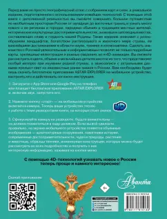 ОписаниеЭнциклопедия-атлас с дополненной реальностью станет вашим гидом в увлекательном путешествии по России. Он расскажет о республиках, краях и областях Российской Федерации, ее крупнейших мегаполисах, таких как столица нашей Родины Москва, главный культурный центр Санкт-Петербург, самый большой город Сибири Новосибирск, краса и гордость Татарстана Казань и многих других. Здесь же содержится интересная информация о городах поменьше, входящих в список "Золотое кольцо России", а также древних селениях, ставших музеями под открытым небом. Вы сможете лучше изучить географию нашей страны, ее растительный и животный мир, природные богатства, достижения науки и техники. Важные сведения и любопытные факты в этой книге приведены в сопровождении огромного количества зрелищных иллюстраций, позволяющих познакомиться с величественными православными храмами и мусульманскими мечетями, великолепными дворцами, неприступными средневековыми башнями и боевыми крепостями, самыми протяженными мостами и грандиозными дамбами, загадочными дольменами и мистическими скальными образованиями, таинственными пещерами и огнедышащими вулканами, высочайшими горными пиками и красивейшими водопадами, удивительными обитателями живой природы и впечатляющими образцами отечественной техники. Но главное - использование новейших 4D-технологий позволит рассмотреть многочисленные природные, культурные и исторические достопримечательности нашей страны со всех сторон, в цвете и объеме, а познавательные сообщения о них прослушать в звукозаписи. Для этого вам нужно будет лишь скачать бесплатное приложение Astar Explorer и действовать согласно несложной инструкции.Дополненная реальность, звуковые эффекты и нестандартно изложенная информация откроют удивительные возможности для изучения географии, истории, культуры, науки и мира живой природы России по-новому.Для среднего и старшего школьного возраста.СвернутьЭнциклопедия-атлас с дополненной реальностью станет вашим гидом в увлекательном путешествии по России. Он расскажет о республиках, краях и областях Российской Федерации, ее крупнейших мегаполисах, таких как столица нашей Родины Москва, главный культурный центр Санкт-Петербург, самый большой город Сибири Новосибирск, краса и гордость Татарстана Казань и многих других. Здесь же содержится интересная информация о городах поменьше, входящих в список "Золотое кольцо России", а также древних селениях, ставших музеями под открытым небом. Вы сможете лучше изучить географию нашей страны, ее растительный и животный мир, природные богатства, достижения науки и техники. Важные сведения и любопытные факты в этой книге приведены в сопровождении огромного количества зрелищных иллюстраций, позволяющих познакомиться с величественными православными храмами и мусульманскими мечетями, великолепными дворцами, неприступными средневековыми башнями и боевыми крепостями, самыми протяженными мостами и грандиозными дамбами, загадочными дольменами и мистическими скальными образованиями, таинственными пещерами и огнедышащими вулканами, высочайшими горными пиками и красивейшими водопадами, удивительными обитателями живой природы и впечатляющими образцами отечественной техники. Но главное - использование новейших 4D-технологий позволит рассмотреть мно