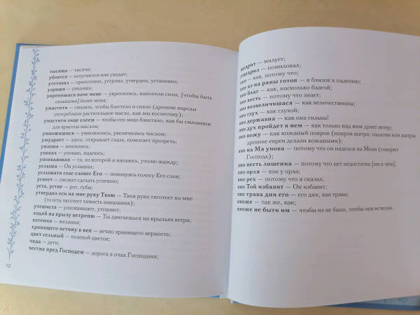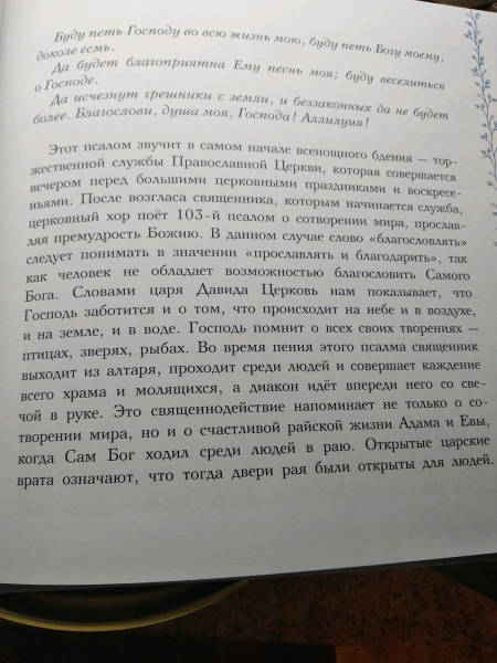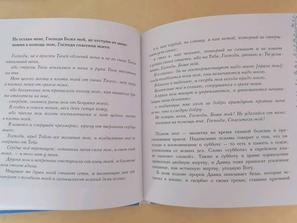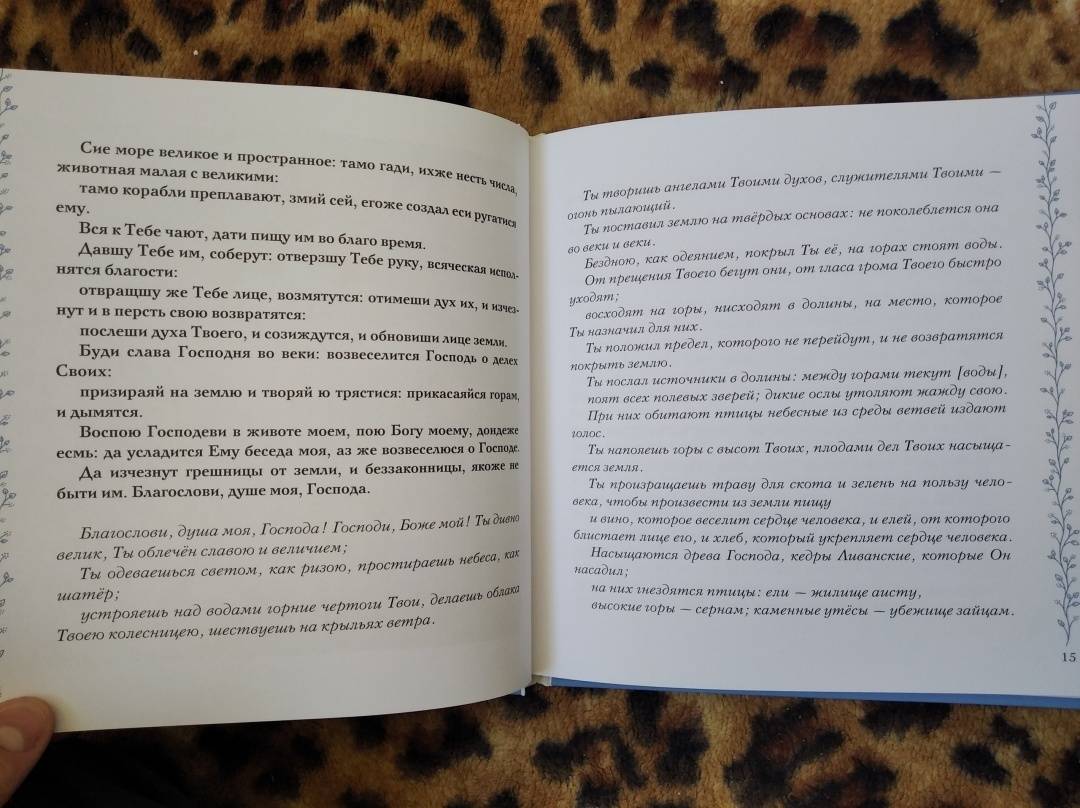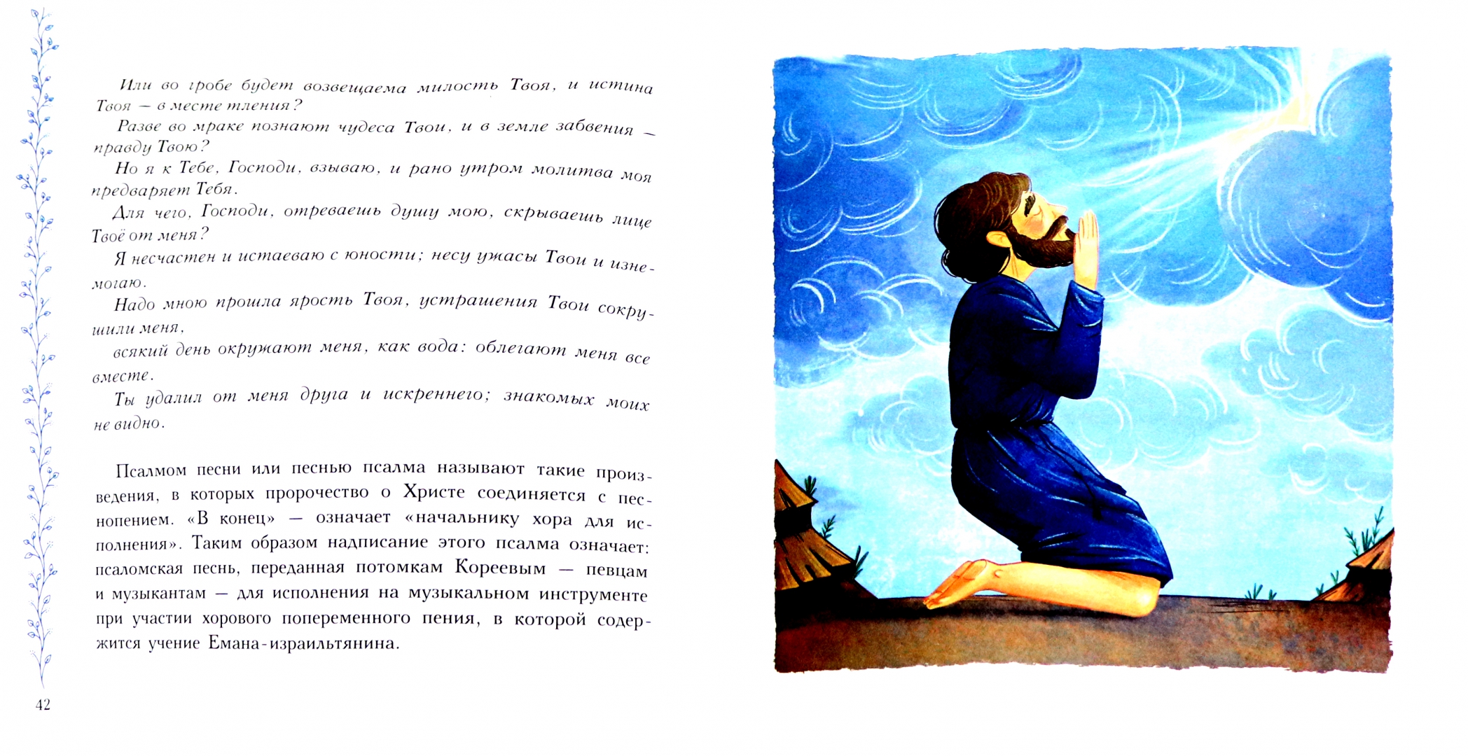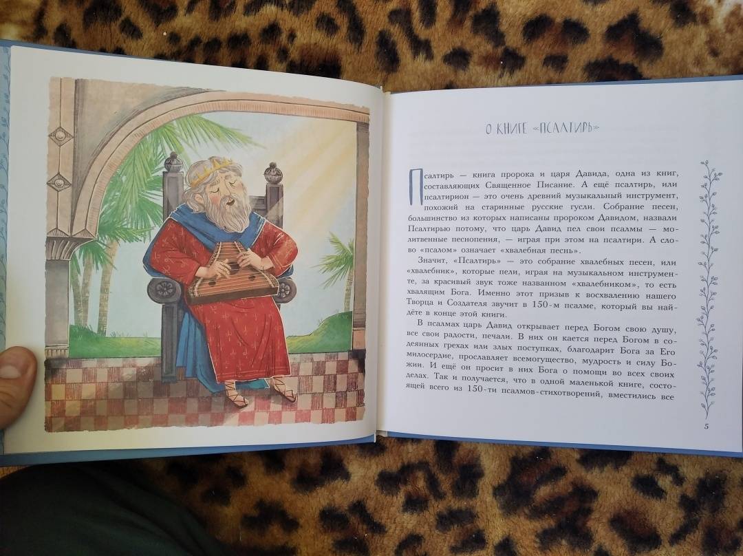 ОписаниеКнига для детей «Избранные псалмы» рассказывает о Псалтири – книге, входящей в состав Священного Писания. Здесь можно узнать о том, как переводится само название «Псалтирь», интересные факты об истории её происхождения и о том, как внутри неё организованы тексты – хвалящие Бога песни, которые называются псалмы. По сути, псалмы – это разные формы общения с Богом: просьбы о помощи и прощении за совершённые грехи, выражение благодарности, восхваление Бога.В книге представлены тексты псалмов на старославянском языке, их перевод на русский, а также простые, но при этом не легковесные комментарии, поясняющие смысл и значение каждого псалма.В конце книги есть словарик церковно-славянских слов с их переводом и объяснением. А яркие и запоминающиеся иллюстрации Аллы Беловой помогут быстрее и лучше почувствовать красоту и мудрость псалмов.Серия «Православие для детей» создана для того, чтобы рассказывать детям о самом-самом сокровенном, непознаваемом и сложном понятно, просто и проникновенно. Так, чтобы не оттолкнуть ребенка, не испугать, а наоборот раскрыть красоту и чудо веры, учения Иисуса Христа, деяний святых, глубину притч и правильное понимание таинств и обрядов Церкви. В каждой книге ребенка ждёт беседа по душам, доверительный разговор, добрые наставления.Рекомендуем все книги серии вместе с ребёнком читать и разглядывать нежные, чуткие и красочные иллюстрации, которых будет очень-очень много.СвернутьКнига для детей «Избранные псалмы» рассказывает о Псалтири – книге, входящей в состав Священного Писания. Здесь можно узнать о том, как переводится само название «Псалтирь», интересные факты об истории её происхождения и о том, как внутри неё организованы тексты – хвалящие Бога песни, которые называются псалмы. По сути, псалмы – это разные формы общения с Богом: просьбы о помощи и прощении за совершённые грехи, выражение благодарности, восхваление Бога.В книге представлены тексты псалмов на старославянском языке, их перевод на русский, а также простые, но при этом не легковесные комментарии, поясняющие смысл и значение каждого псалма.В конце книги есть словарик церковно-славянских слов с их переводом и объяснением. А яркие и запоминающиеся иллюстрации Аллы Беловой помогут быстрее и лучше почувствовать красоту и мудрость псалмов.Серия «Православие для детей» создана для того, чтобы рассказывать детям о самом-самом сокровенном, непознаваемом и сложном понятно, просто и проникновенно. Так, чтобы не оттолкнуть ребенка, не испугать, а наоборот раскрыть красоту и чудо веры, учения Иисуса Христа, деяний святых, глубину притч и правильное понимание таинств и обрядов Церкви. В каждой книге ребенка ждёт беседа по душам, доверительный разговор, добрые наставления.Рекомендуем все книги серии вместе с ребёнком читать и разглядывать нежные, чуткие и красочные иллюстрации, которых будет очень-очень много.СвернутьСвернуть
