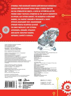 ОписаниеСтраницы этой маленькой книжки действительно волшебные. Сначала они показывают самые разные виды транспорта, техники и сооружений снаружи, как мы привыкли их видеть, а затем - их устройство внутри. Ребёнок может разрезать странички на три части, по ярусам, и посмотреть, как работает винт вертолёта, как устроена космическая ракета, зачем танку гусеницы и как в кабине помещается экипаж, а также прочесть небольшой текст, объясняющий принцип работы различных деталей.Эта книга расскажет, как устроены зерноуборочный комбайн, бульдозер, экскаватор, пожарная машина, мотоцикл, самолёт, корабль и автомобиль.Страницы этой маленькой книжки действительно волшебные. Сначала они показывают самые разные виды транспорта, техники и сооружений снаружи, как мы привыкли их видеть, а затем - их устройство внутри. Ребёнок может разрезать странички на три части, по ярусам, и посмотреть, как работает винт вертолёта, как устроена космическая ракета, зачем танку гусеницы и как в кабине помещается экипаж, а также прочесть небольшой текст, объясняющий принцип работы различных деталей.Эта книга расскажет, как устроены зерноуборочный комбайн, бульдозер, экскаватор, пожарная машина, мотоцикл, самолёт, корабль и автомобиль.