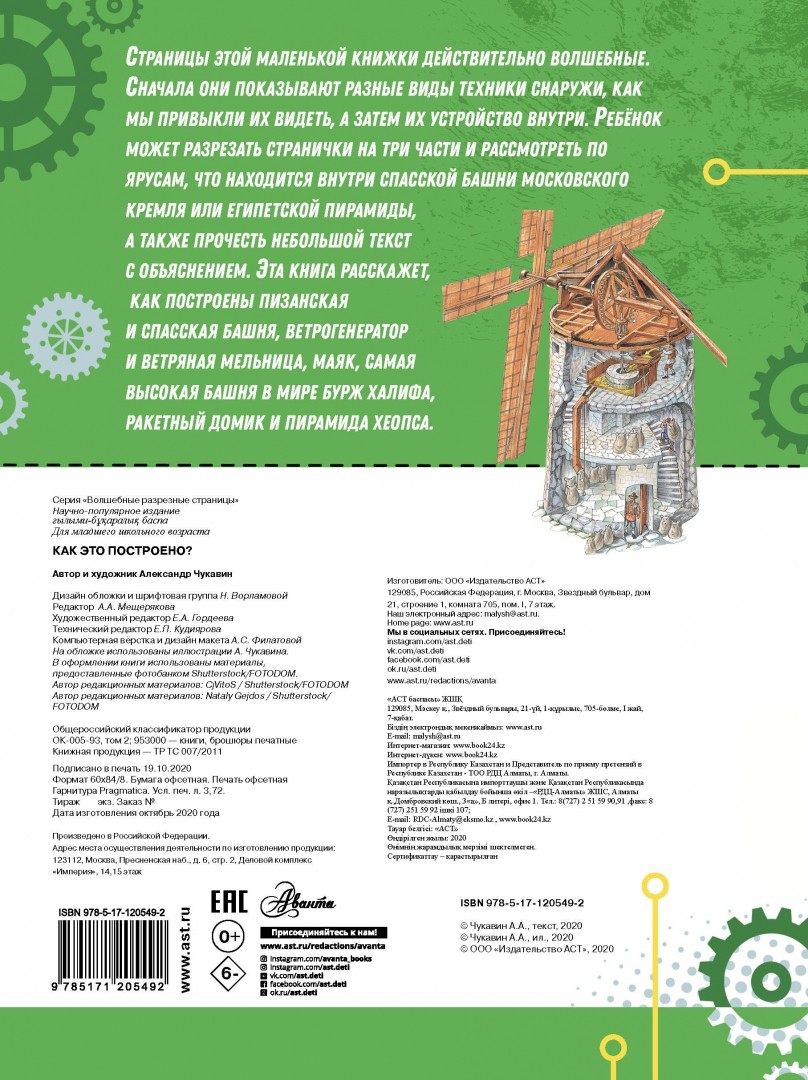 ОписаниеСтраницы этой маленькой книжки действительно волшебные. Сначала они показывают разные виды построек снаружи, как мы привыкли их видеть, а затем их устройство внутри. Ребёнок может разрезать странички на три части и рассмотреть по ярусам, что находится внутри Спасской башни московского Кремля или египетской пирамиды, а также прочесть небольшой текст с объяснением. Эта книга расскажет, как построены Пизанская и Спасская башня, ветрогенератор и ветряная мельница, маяк, самый высокий небоскрёб Бурдж-Халифа, ракетный домик и пирамида Хеопса.Для младшего школьного возраста.Страницы этой маленькой книжки действительно волшебные. Сначала они показывают разные виды построек снаружи, как мы привыкли их видеть, а затем их устройство внутри. Ребёнок может разрезать странички на три части и рассмотреть по ярусам, что находится внутри Спасской башни московского Кремля или египетской пирамиды, а также прочесть небольшой текст с объяснением. Эта книга расскажет, как построены Пизанская и Спасская башня, ветрогенератор и ветряная мельница, маяк, самый высокий небоскрёб Бурдж-Халифа, ракетный домик и пирамида Хеопса.Для младшего школьного возраста.