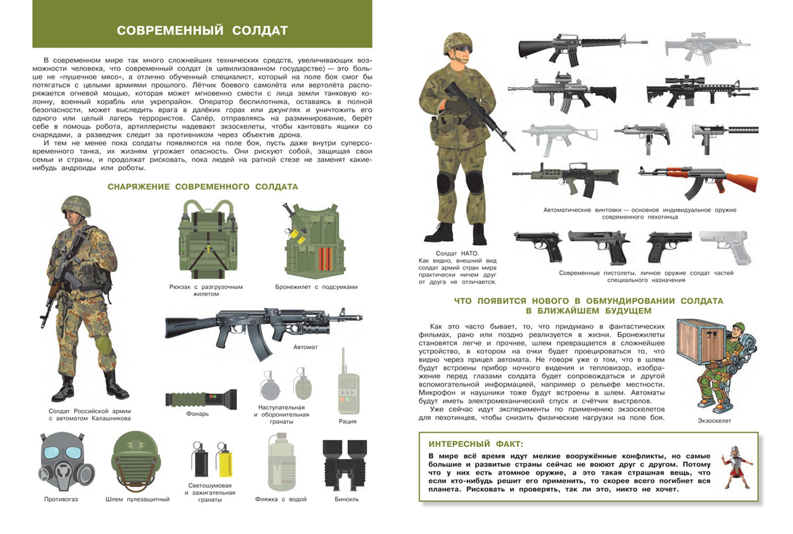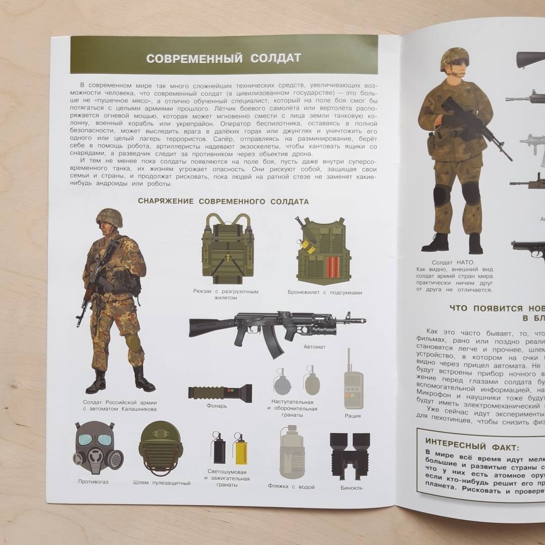ОписаниеСражения и войны, к сожалению, всегда сопровождали человечество. Первобытный охотник, защищающий свое племя или современный, хорошо обученный специалист, который борется с террористами - все они солдаты.Атлас познакомит маленького читателя с солдатами разных эпох - от древнего мира до современности. Покажет, как от века к веку менялись их оружие, экипировка и тактика ведения боя.Эта красочно иллюстрированная энциклопедия с яркими многоразовыми наклейками не оставит равнодушным ни одного ребенка, интересующегося военной историей.Сражения и войны, к сожалению, всегда сопровождали человечество. Первобытный охотник, защищающий свое племя или современный, хорошо обученный специалист, который борется с террористами - все они солдаты.Атлас познакомит маленького читателя с солдатами разных эпох - от древнего мира до современности. Покажет, как от века к веку менялись их оружие, экипировка и тактика ведения боя.Эта красочно иллюстрированная энциклопедия с яркими многоразовыми наклейками не оставит равнодушным ни одного ребенка, интересующегося военной историей.