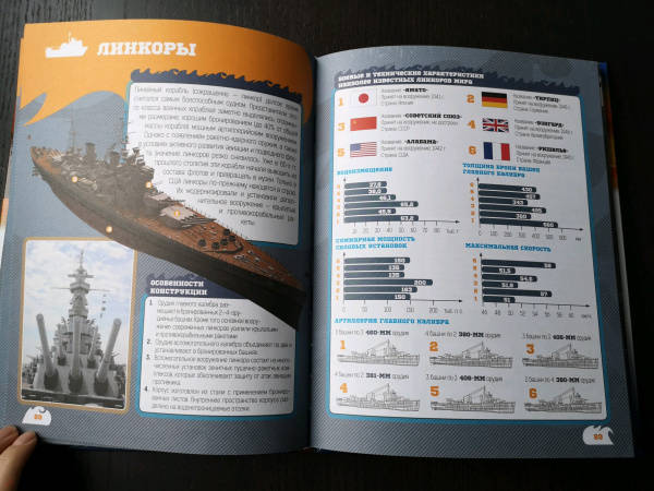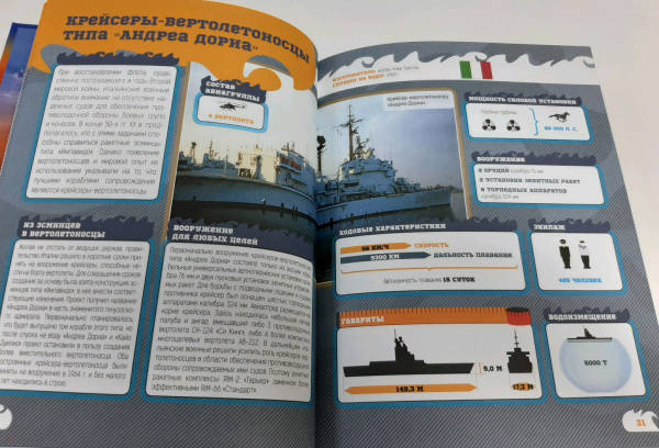 ОписаниеХочешь узнать, чем отличается линкор от эсминца, а корвет от фрегата? Суда какого класса являются самыми большими среди военных кораблей? Какой субмарине принадлежит абсолютный рекорд по глубине погружения? Эти и многие другие интересные факты о боевых кораблях и подводных лодках можно найти на страницах данной книги. наряду с историческими моделями судов здесь можно встретить новейшие и даже перспективные разработки. Познакомиться с кораблями военно-морского флота разных стран поможет богатый иллюстративный материал с использованием инфографики. Без сомнения, такой источник знаний о надводных и подводных судах сделает тебя настоящим экспертом в области боевых кораблей. Для среднего и старшего школьного возраста.Хочешь узнать, чем отличается линкор от эсминца, а корвет от фрегата? Суда какого класса являются самыми большими среди военных кораблей? Какой субмарине принадлежит абсолютный рекорд по глубине погружения? Эти и многие другие интересные факты о боевых кораблях и подводных лодках можно найти на страницах данной книги. наряду с историческими моделями судов здесь можно встретить новейшие и даже перспективные разработки. Познакомиться с кораблями военно-морского флота разных стран поможет богатый иллюстративный материал с использованием инфографики. Без сомнения, такой источник знаний о надводных и подводных судах сделает тебя настоящим экспертом в области боевых кораблей. Для среднего и старшего школьного возраста.