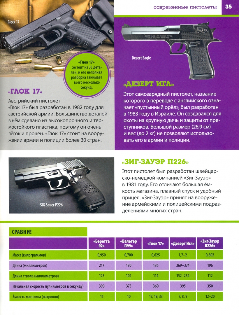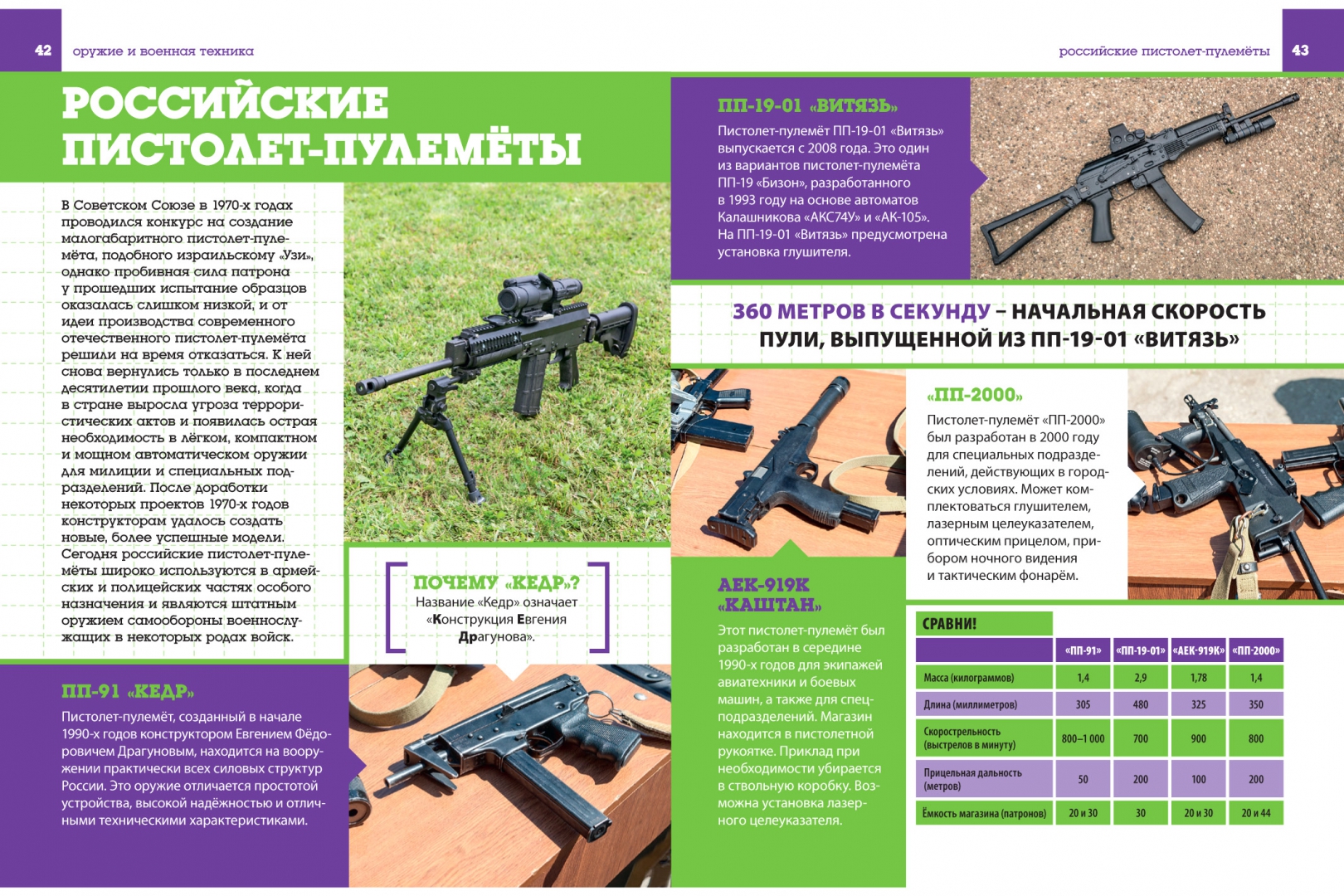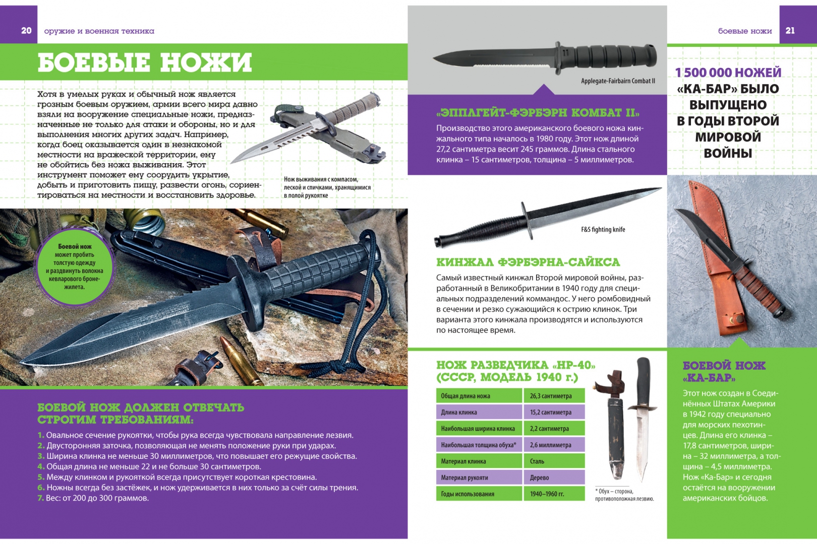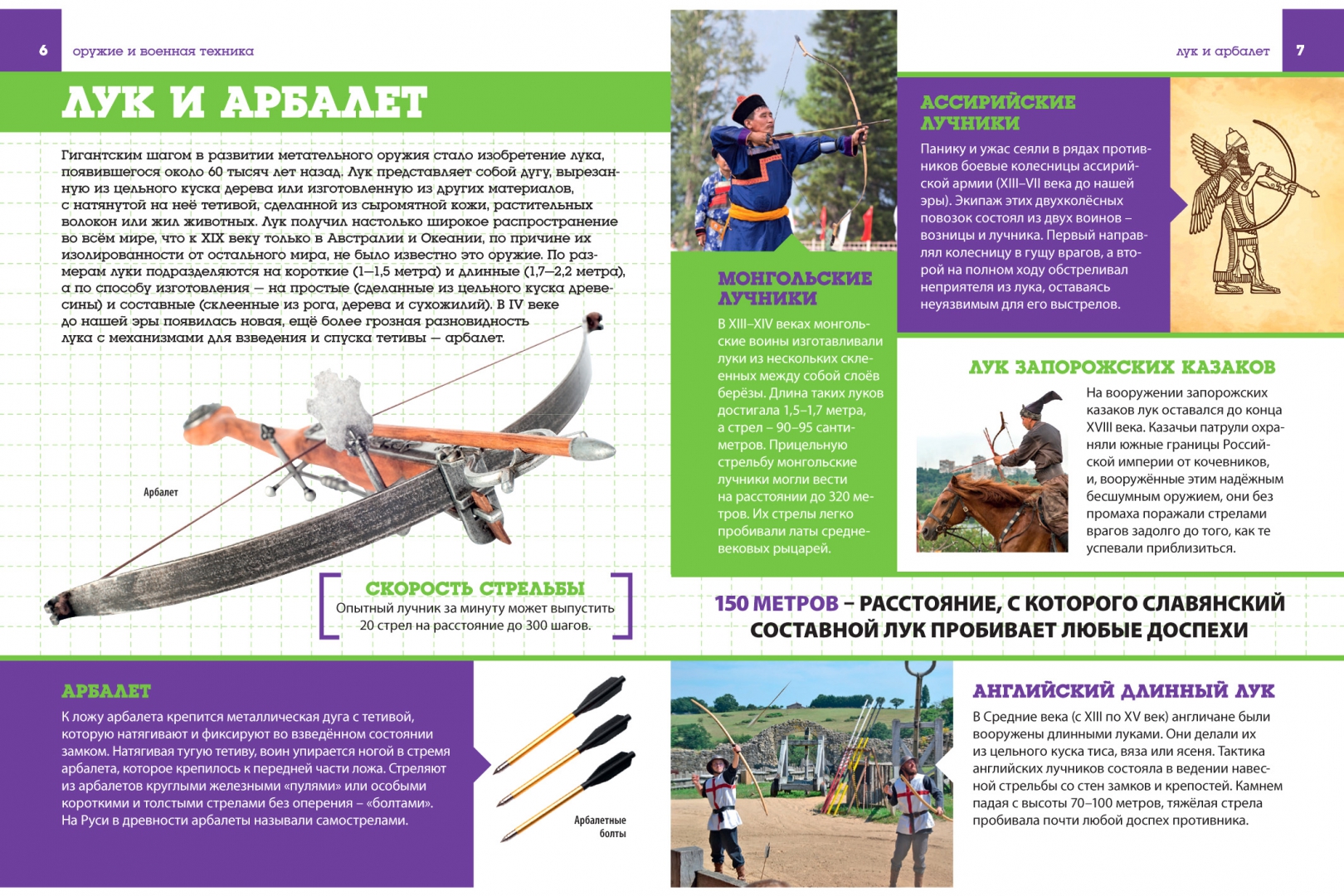ОписаниеДорогой друг! Ты держишь в руках книгу о легендарном и самом современном холодном и огнестрельном оружии. На её страницах ты познакомишься со старинными боевыми топорами и античными мечами, с новыми моделями снайперских винтовок, узнаешь, как стрелять из арбалета, когда появилась сабля, чем знамениты пулемёт-максим и автомат Калашникова. А также ты прочитаешь в этой энциклопедии о военных кораблях и самолётах, танках, боевых машинах и современных ракетных установках. Вперёд, в увлекательное путешествие на борту сверхзвукового истребителя или атомного подводного крейсера!Дорогой друг! Ты держишь в руках книгу о легендарном и самом современном холодном и огнестрельном оружии. На её страницах ты познакомишься со старинными боевыми топорами и античными мечами, с новыми моделями снайперских винтовок, узнаешь, как стрелять из арбалета, когда появилась сабля, чем знамениты пулемёт-максим и автомат Калашникова. А также ты прочитаешь в этой энциклопедии о военных кораблях и самолётах, танках, боевых машинах и современных ракетных установках. Вперёд, в увлекательное путешествие на борту сверхзвукового истребителя или атомного подводного крейсера!