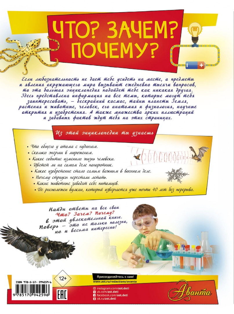 ОписаниеКак возникла Вселенная и всё в ней? Каково наше место в безграничном космосе? Сила притяжения и черная дыра - что общего? Почему извергаются вулканы и случаются землетрясения? Страна и государство - в чем разница? Чем разные виды животных и растений отличаются друг от друга? Почему мы, люди, именно такие? Что такое наука и как она влияет на нашу жизнь? Сколько энергии в мороженом? Почему вода не горит? Как называлось первое огнестрельное оружие? Кто из древних народов пользовался узелковым письмом? Хоть один из этих вопросов задавал себе каждый человек. Если и тебе интересно узнать много нового про окружающую действительность, то эта энциклопедия подойдет как нельзя лучше. на ее страницах содержится краткая и доступная информация буквально обо всем на свете. Здесь ты найдешь ответы на тысячу своих "Что?", "Зачем?", "Почему?". Для среднего и старшего школьного возраста.Как возникла Вселенная и всё в ней? Каково наше место в безграничном космосе? Сила притяжения и черная дыра - что общего? Почему извергаются вулканы и случаются землетрясения? Страна и государство - в чем разница? Чем разные виды животных и растений отличаются друг от друга? Почему мы, люди, именно такие? Что такое наука и как она влияет на нашу жизнь? Сколько энергии в мороженом? Почему вода не горит? Как называлось первое огнестрельное оружие? Кто из древних народов пользовался узелковым письмом? Хоть один из этих вопросов задавал себе каждый человек. Если и тебе интересно узнать много нового про окружающую действительность, то эта энциклопедия подойдет как нельзя лучше. на ее страницах содержится краткая и доступная информация буквально обо всем на свете. Здесь ты найдешь ответы на тысячу своих "Что?", "Зачем?", "Почему?". Для среднего и старшего школьного возраста.
