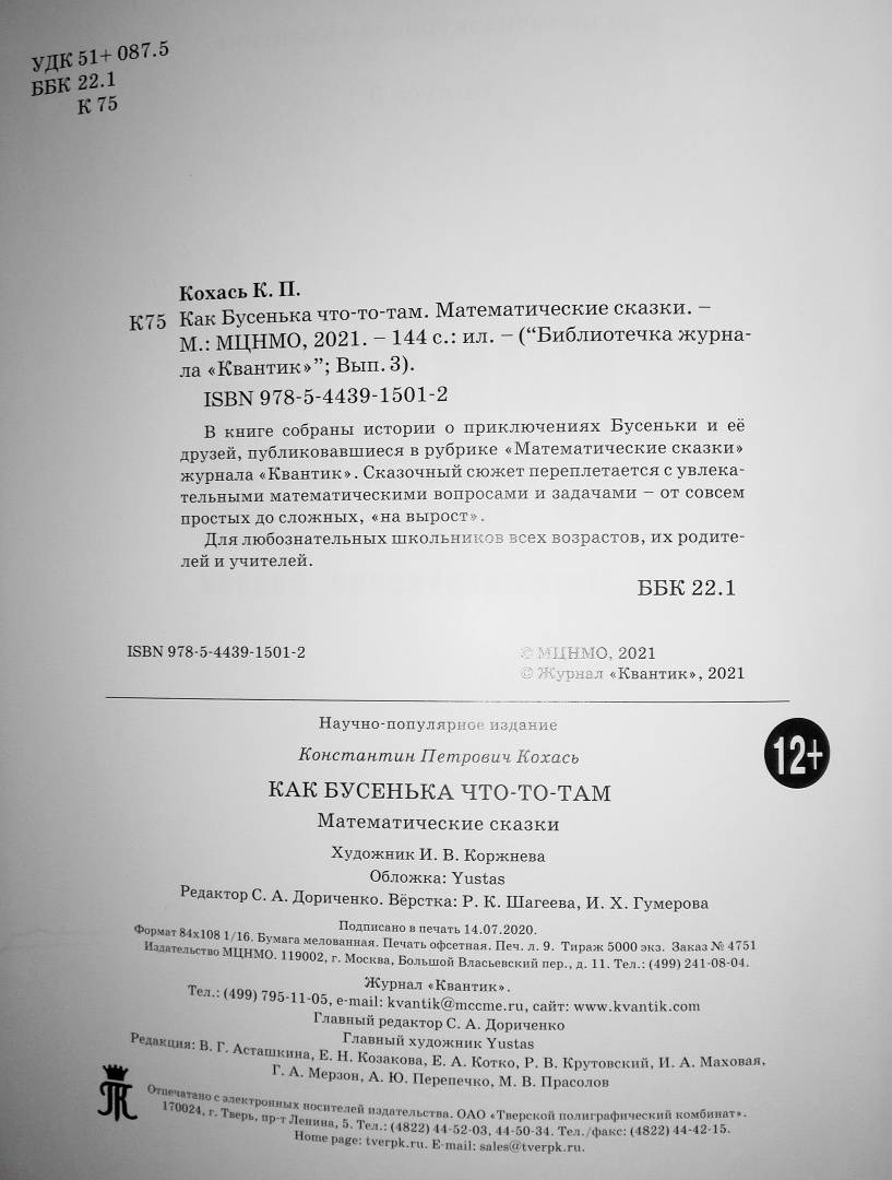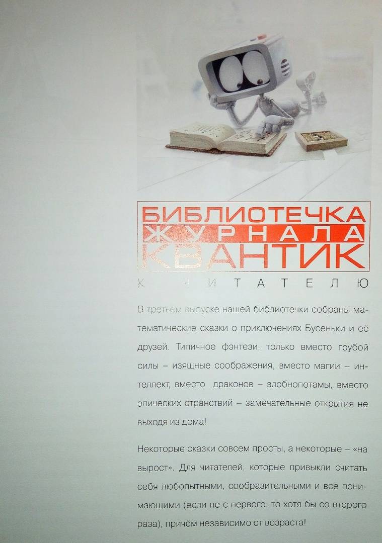 Описание"Как Бусенька что-то-там" - третья книга из серии "Библиотечка журнала "Квантик""В книге собраны истории о приключениях Бусеньки и её друзей, публиковавшиеся в рубрике "Математические сказки" журнала "Квантик". Сказочный сюжет переплетается с увлекательными математическими вопросами и задачами - от совсем простых до сложных, "на вырост".Для любознательных школьников всех возрастов, их родителей и учителей."Как Бусенька что-то-там" - третья книга из серии "Библиотечка журнала "Квантик""В книге собраны истории о приключениях Бусеньки и её друзей, публиковавшиеся в рубрике "Математические сказки" журнала "Квантик". Сказочный сюжет переплетается с увлекательными математическими вопросами и задачами - от совсем простых до сложных, "на вырост".Для любознательных школьников всех возрастов, их родителей и учителей.