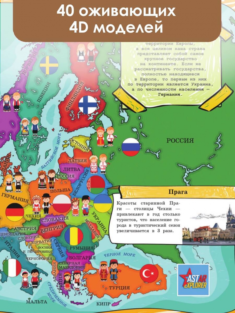 ОписаниеОтправиться в путешествие по материкам и островам земного шара, узнать многое о народах и странах мира, в том числе о крупнейшем на планете государстве - России, - приглашает всех любознательных ребят эта большая иллюстрированная книга с дополненной реальностью. На ее страницах вы с легкостью найдете ответы на самые разные вопросы по географии и истории, как достаточно простые, так и весьма каверзные, и сможете не только увереннее чувствовать себя на школьных уроках, но и прослыть среди сверстников настоящими эрудитами. Хотите знать, как называется главная площадь Санкт-Петербурга и под руководством какого зодчего был возведен знаменитый на весь мир собор Василия Блаженного? Какие города входят в популярный туристический маршрут "Золотое кольцо России" и кем был создан первый русский музей? Какое полезное ископаемое образно именуют черным золотом, а какое после обработки называют бриллиантом? В какой стране была придумана система регулярных парков, а в какой - созданы фантастические Сады у Залива? Какое сооружение называют "Вратами Тегерана", а какое - "Воротами Индии"? Какой замок поразительно напоминает здание Хогвардса из романов о Гарри Поттере, а какой считается домом графа Дракулы?Откройте эту книгу, рассмотрите подробные карты и зрелищные иллюстрации, прочтите важную и полезную информацию и познакомьтесь с самыми выдающимися достопримечательностями разных уголков России и мира с помощью дополненной реальности! Воспользуйтесь возможностями 4D-технологий и начните изучать нашу Родину и всю удивительную планету по-новому!Для среднего и старшего школьного возраста.СвернутьОтправиться в путешествие по материкам и островам земного шара, узнать многое о народах и странах мира, в том числе о крупнейшем на планете государстве - России, - приглашает всех любознательных ребят эта большая иллюстрированная книга с дополненной реальностью. На ее страницах вы с легкостью найдете ответы на самые разные вопросы по географии и истории, как достаточно простые, так и весьма каверзные, и сможете не только увереннее чувствовать себя на школьных уроках, но и прослыть среди сверстников настоящими эрудитами. Хотите знать, как называется главная площадь Санкт-Петербурга и под руководством какого зодчего был возведен знаменитый на весь мир собор Василия Блаженного? Какие города входят в популярный туристический маршрут "Золотое кольцо России" и кем был создан первый русский музей? Какое полезное ископаемое образно именуют черным золотом, а какое после обработки называют бриллиантом? В какой стране была придумана система регулярных парков, а в какой - созданы фантастические Сады у Залива? Какое сооружение называют "Вратами Тегерана", а какое - "Воротами Индии"? Какой замок поразительно напоминает здание Хогвардса из романов о Гарри Поттере, а какой считается домом графа Дракулы?Откройте эту книгу, рассмотрите подробные карты и зрелищные иллюстрации, прочтите важную и полезную информацию и познакомьтесь с самыми выдающимися достопримечательностями разных уголков России и мира с помощью дополненной реальности! Воспользуйтесь возможностями 4D-технологий и начните изучать нашу Родину и всю удивительную планету по-новому!Для среднего и старшего школьного возраста.СвернутьСвернуть