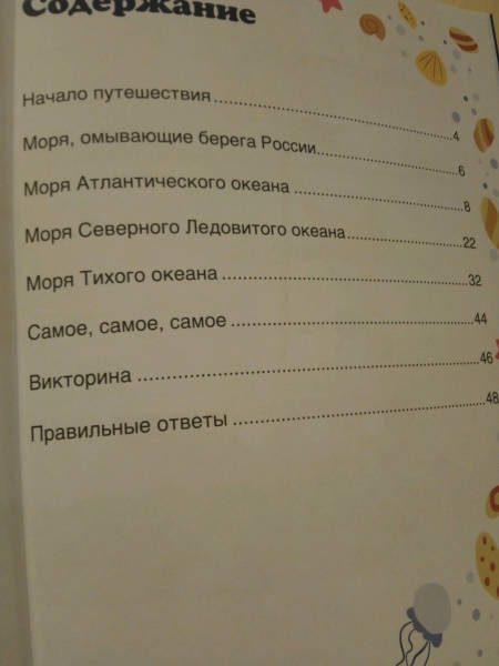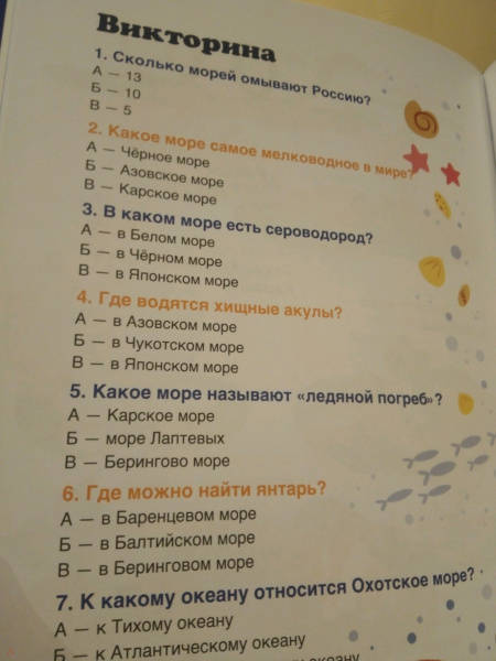 ОписаниеЭта книга приглашает юных читателей отправиться в путешествие по морям России и узнать много интересного: сколько морей омывают берега нашей страны и к каким океанам они относятся; почему Чёрное море называется "чёрное"; какое море самое пресное; где водятся акулы, а где - киты; где можно найти янтарь, и многое другое. В конце книги читателей ждёт викторина.Эта книга приглашает юных читателей отправиться в путешествие по морям России и узнать много интересного: сколько морей омывают берега нашей страны и к каким океанам они относятся; почему Чёрное море называется "чёрное"; какое море самое пресное; где водятся акулы, а где - киты; где можно найти янтарь, и многое другое. В конце книги читателей ждёт викторина.