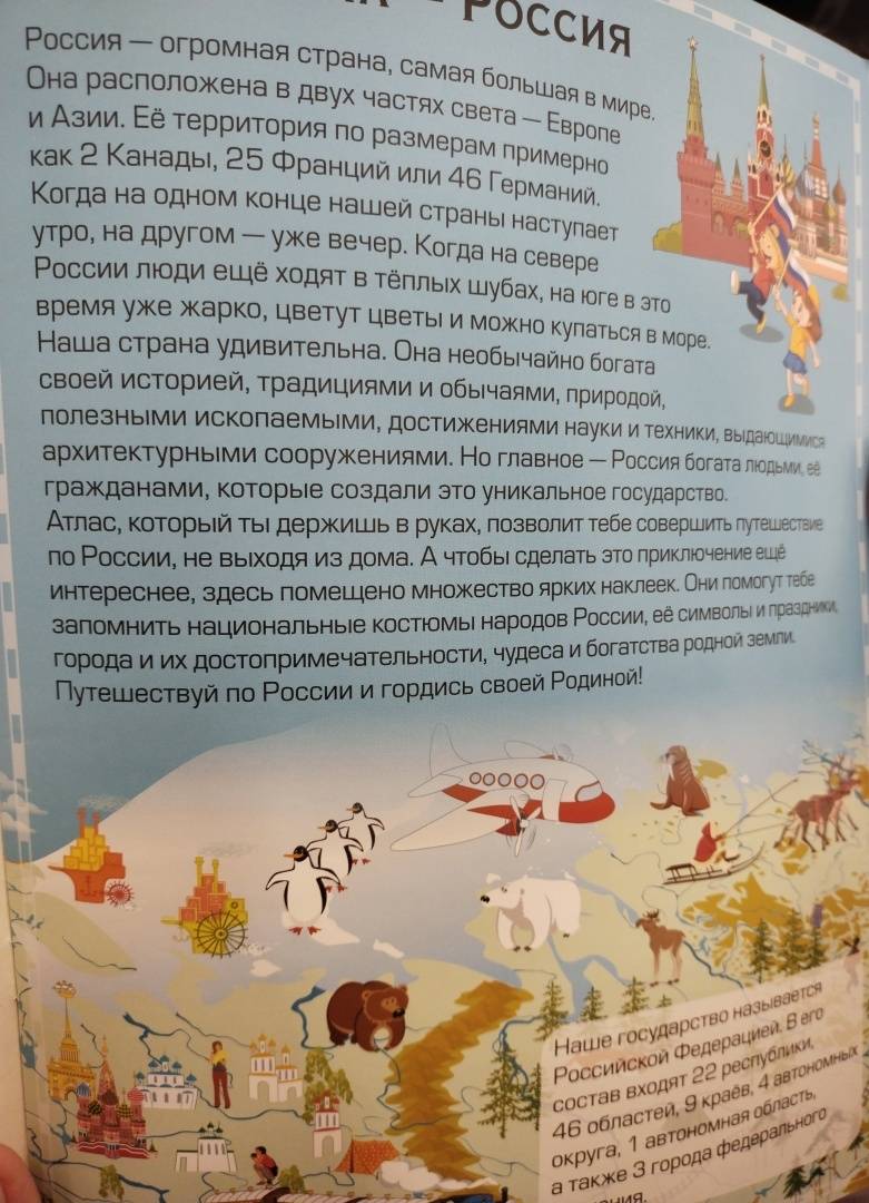 ОписаниеДетский атлас России приглашает ребёнка отправиться в увлекательное путешествие по необъятным просторам нашей страны. Маленький почемучка, не выходя из дома, узнает много нового о государственных символах России, о её народах, традициях и праздниках, о городах и достопримечательностях, о сокровищах недр и достижениях науки и техники, а также о столице нашего государства - Москве. Издание содержит множество цветных наклеек. Подбирая их по темам, малыш сможет разместить на страницах книги изображения представителей различных народов в национальных костюмах, виды уникальных уголков России с их памятниками, инженерными сооружениями и промышленностью, а попутно - запомнить полезную информацию о родной стране. Красочные иллюстрации, карты и наклейки позволят превратить знакомство ребёнка со своей Родиной в весьма интересную и познавательную игру.Для дошкольного возраста.Детский атлас России с наклейками позволит ребенку непринужденно, в процессе игры запомнить важную информацию о нашей Родине, ее государственных символах и народах, федеральных округах и крупнейших городах. Малыш сможет выучить названия и даты главных праздников, познакомиться с основными сооружениями и памятными местами столицы нашего государства Москвы, а также узнать, какими природными богатствами и культурными достопримечательностями славится Россия.СвернутьДетский атлас России приглашает ребёнка отправиться в увлекательное путешествие по необъятным просторам нашей страны. Маленький почемучка, не выходя из дома, узнает много нового о государственных символах России, о её народах, традициях и праздниках, о городах и достопримечательностях, о сокровищах недр и достижениях науки и техники, а также о столице нашего государства - Москве. Издание содержит множество цветных наклеек. Подбирая их по темам, малыш сможет разместить на страницах книги изображения представителей различных народов в национальных костюмах, виды уникальных уголков России с их памятниками, инженерными сооружениями и промышленностью, а попутно - запомнить полезную информацию о родной стране. Красочные иллюстрации, карты и наклейки позволят превратить знакомство ребёнка со своей Родиной в весьма интересную и познавательную игру.Для дошкольного возраста.Детский атлас России с наклейками позволит ребенку непринужденно, в процессе игры запомнить важную информацию о нашей Родине, ее государственных символах и народах, федеральных округах и крупнейших городах. Малыш сможет выучить названия и даты главных праздников, познакомиться с основными сооружениями и памятными местами столицы нашего государства Москвы, а также узнать, какими природными богатствами и культурными достопримечательностями славится Россия.СвернутьСвернуть