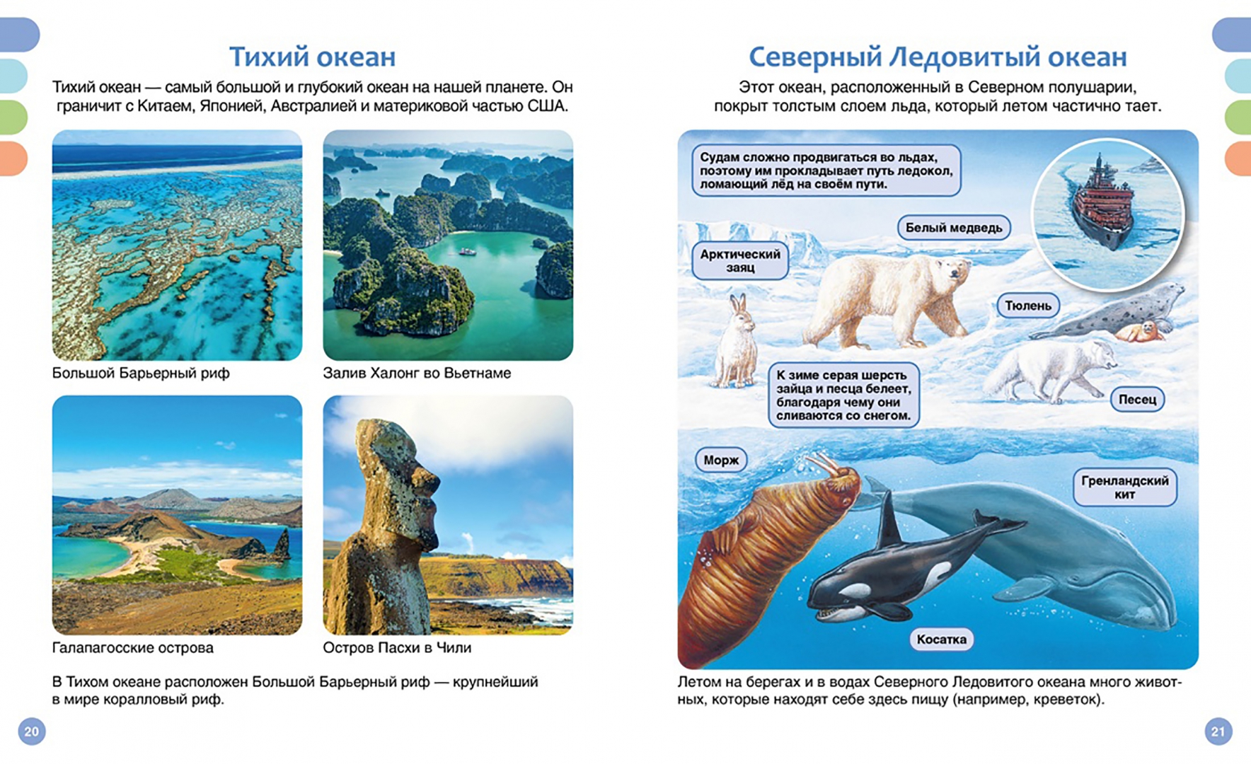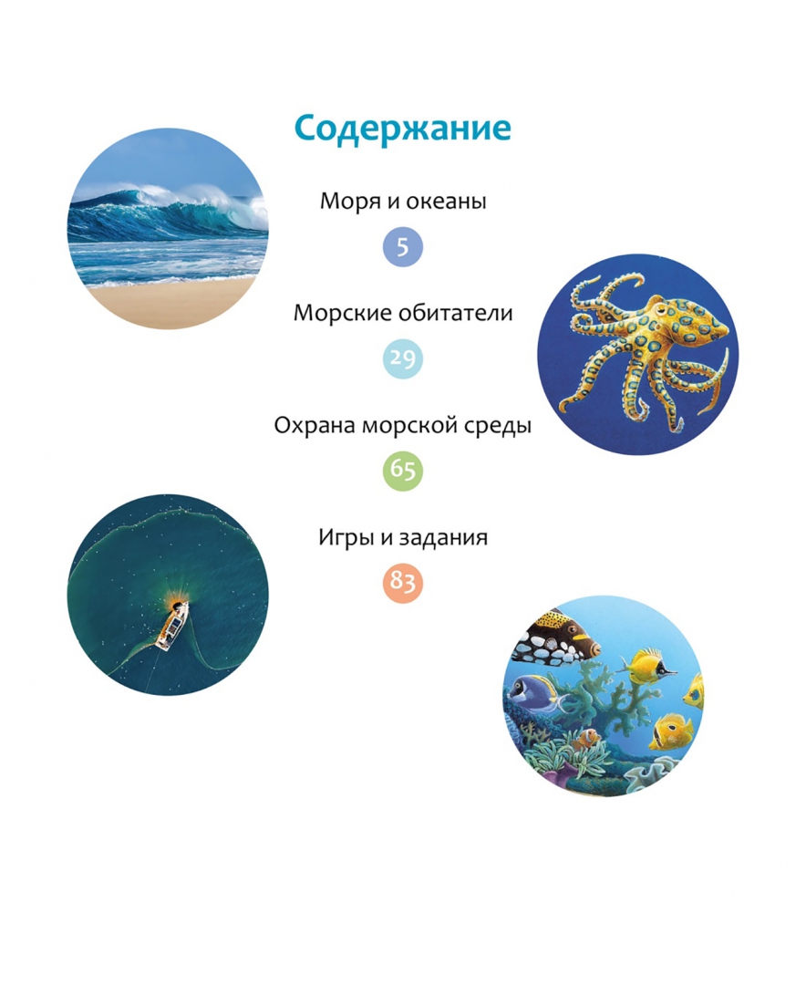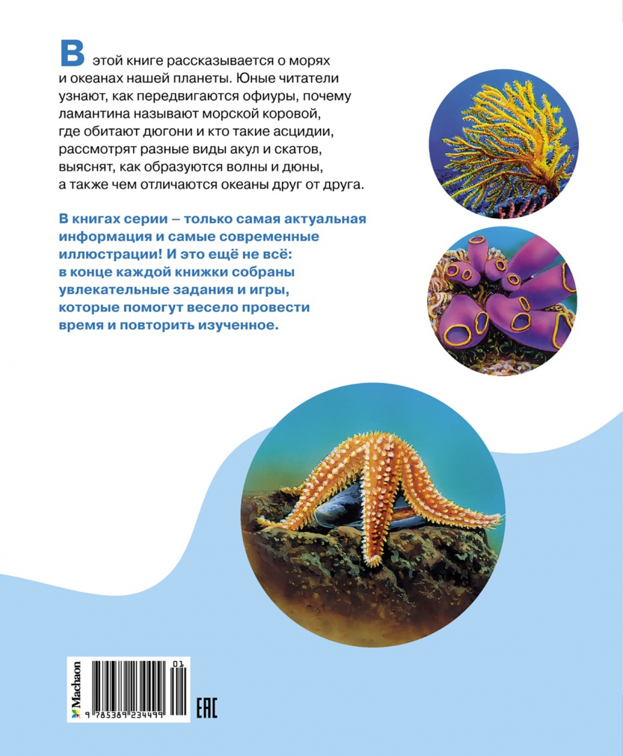 ОписаниеВ этой книге рассказывается о морях и океанах нашей планеты. Юные читатели узнают, как передвигаются офиуры, почему ламантина называют морской коровой, где обитают дюгони и кто такие асцидии, рассмотрят разные виды акул и скатов, выяснят, как образуются волны и дюны, а также чем отличаются океаны друг от друга. В книгах серии – только самая актуальная информация и самые современные иллюстрации! И это ещё не всё: в конце каждой книжки собраны увлекательные задания и игры, которые помогут весело провести время и повторить изученное.В этой книге рассказывается о морях и океанах нашей планеты. Юные читатели узнают, как передвигаются офиуры, почему ламантина называют морской коровой, где обитают дюгони и кто такие асцидии, рассмотрят разные виды акул и скатов, выяснят, как образуются волны и дюны, а также чем отличаются океаны друг от друга. В книгах серии – только самая актуальная информация и самые современные иллюстрации! И это ещё не всё: в конце каждой книжки собраны увлекательные задания и игры, которые помогут весело провести время и повторить изученное.