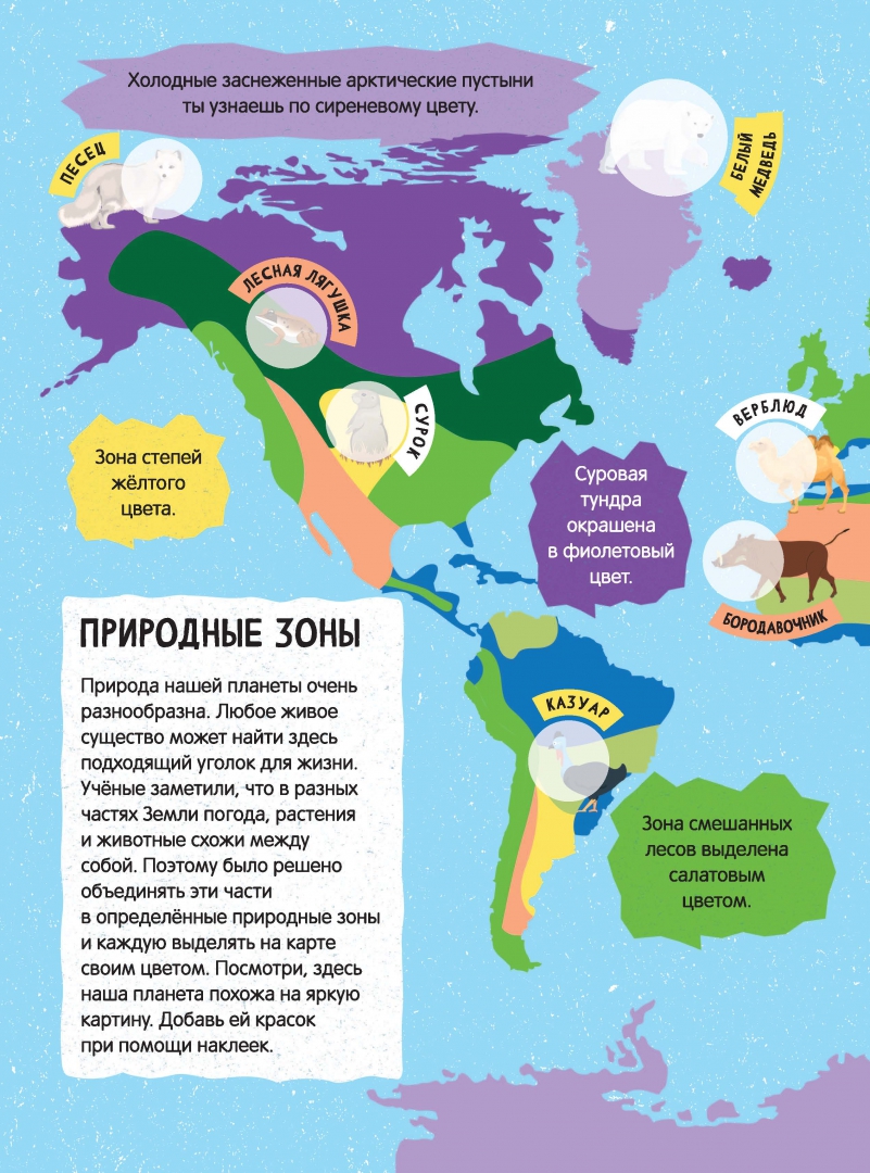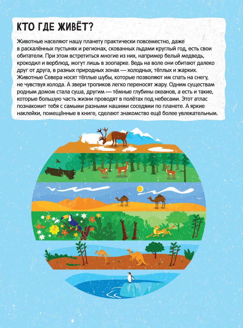 ОписаниеЭтот атлас станет первым путеводителем вашего ребёнка в увлекательном путешествии по нашей планете и знакомстве с её обитателями. С его помощью малыш побывает во всех, даже самых отдалённых уголках света, узнает, на какие природные зоны делится наша планета и какие животные населяют каждую из них. Любопытные факты и яркие картинки сделают это путешествие увлекательным и интересным. А многочисленные наклейки превратят изучение атласа в занимательную игру. Вперёд — приключения ждут самых любознательных!Этот атлас станет первым путеводителем вашего ребёнка в увлекательном путешествии по нашей планете и знакомстве с её обитателями. С его помощью малыш побывает во всех, даже самых отдалённых уголках света, узнает, на какие природные зоны делится наша планета и какие животные населяют каждую из них. Любопытные факты и яркие картинки сделают это путешествие увлекательным и интересным. А многочисленные наклейки превратят изучение атласа в занимательную игру. Вперёд — приключения ждут самых любознательных!