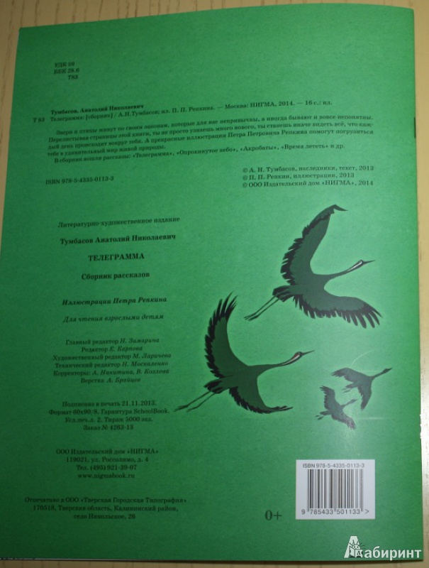 ОписаниеЗвери и птицы живут по своим законам, которые для нас непривычны, а иногда бывают и вовсе непонятны. Перелистывая страницы этой книги, ты не просто узнаешь много нового, ты станешь иначе видеть всё, что каждый день происходит вокруг тебя. А прекрасные иллюстрации Петра Петровича Репкина помогут погрузиться тебе в удивительный мир живой природы.В сборник вошли рассказы: "Телеграмма", "Опрокинутое небо", "Акробаты", "Время лететь" и др.Звери и птицы живут по своим законам, которые для нас непривычны, а иногда бывают и вовсе непонятны. Перелистывая страницы этой книги, ты не просто узнаешь много нового, ты станешь иначе видеть всё, что каждый день происходит вокруг тебя. А прекрасные иллюстрации Петра Петровича Репкина помогут погрузиться тебе в удивительный мир живой природы.В сборник вошли рассказы: "Телеграмма", "Опрокинутое небо", "Акробаты", "Время лететь" и др.