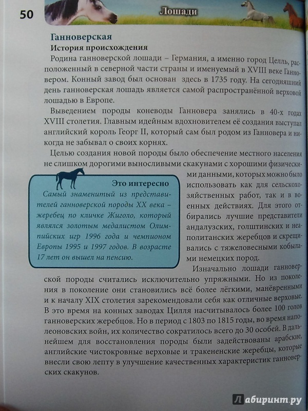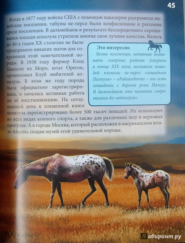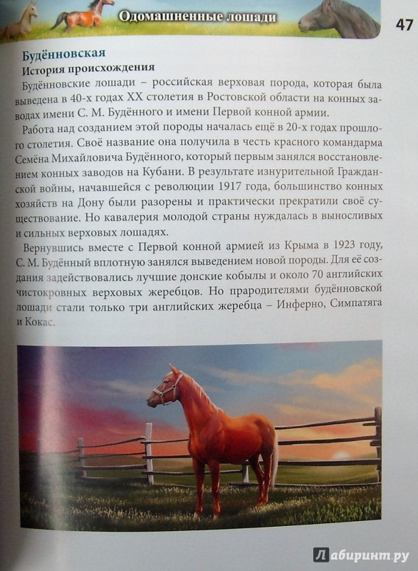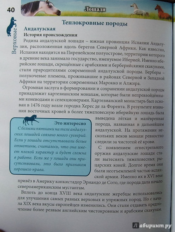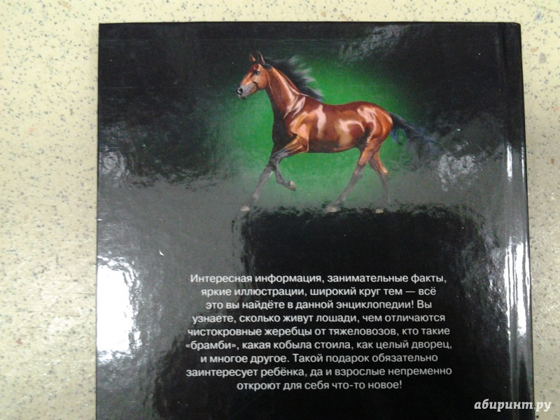 ОписаниеИнтересная информация, занимательные факты, яркие иллюстрации, широкий круг тем - всё это вы найдёте в данной энциклопедии! Вы узнаете, сколько живут лошади, чем отличаются чистокровные жеребцы от тяжеловозов, кто такие "брамби", какая кобыла стоила, как целый дворец, и многое другое. Такой подарок обязательно заинтересует ребёнка, да и взрослые непременно откроют для себя что-то новое!Интересная информация, занимательные факты, яркие иллюстрации, широкий круг тем - всё это вы найдёте в данной энциклопедии! Вы узнаете, сколько живут лошади, чем отличаются чистокровные жеребцы от тяжеловозов, кто такие "брамби", какая кобыла стоила, как целый дворец, и многое другое. Такой подарок обязательно заинтересует ребёнка, да и взрослые непременно откроют для себя что-то новое!
