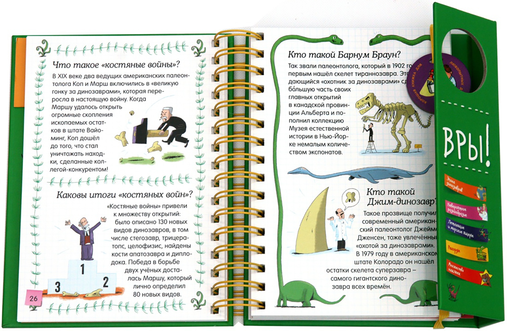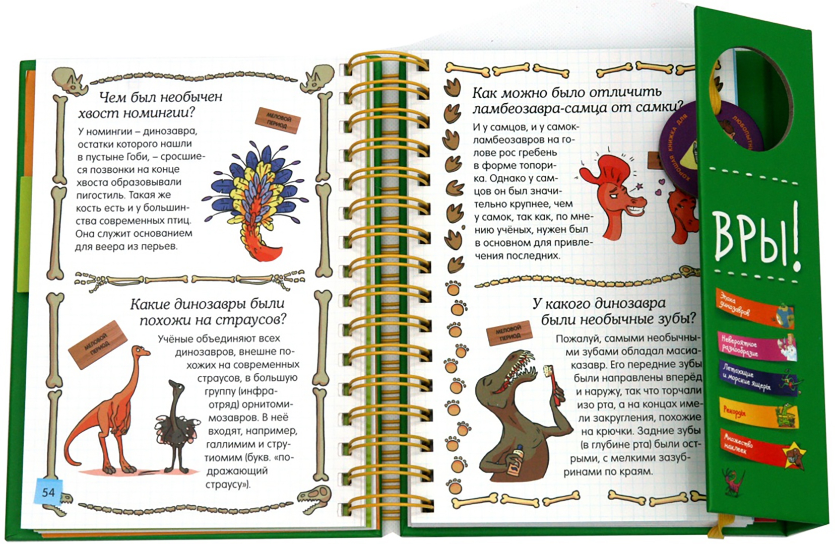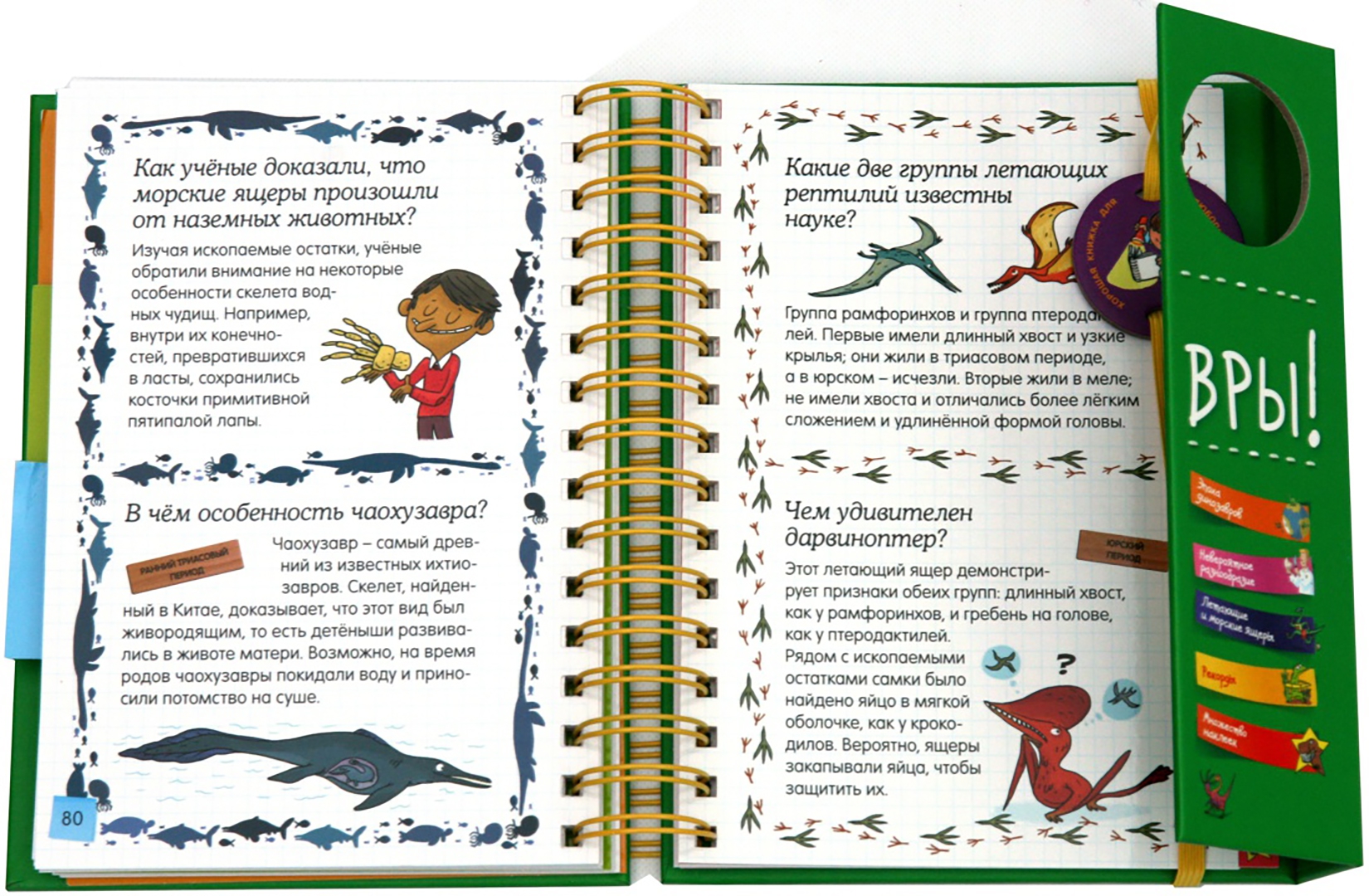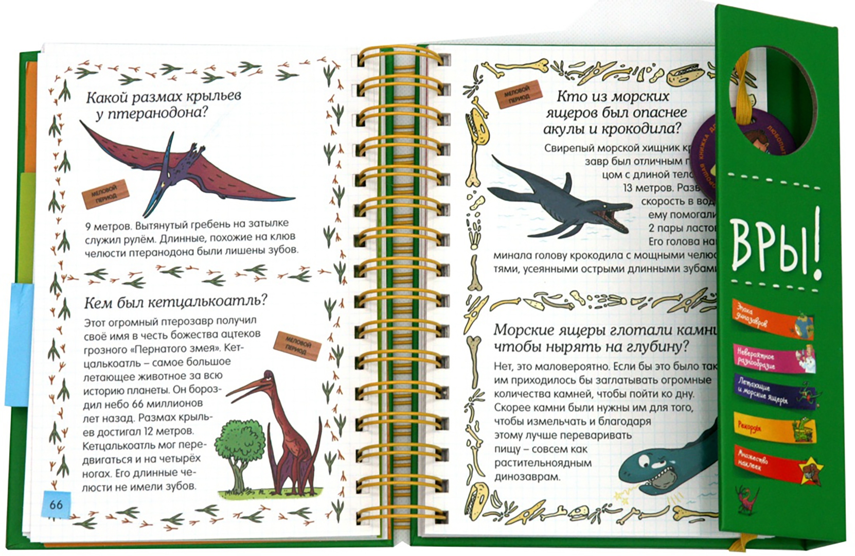 ОписаниеПочему динозавры вымерли?Что было самым грозным "оружием" диплодока?Как распознать динозавра?Кто из динозавров был самым маленьким?Откуда известно, какой была кожа динозавров?Кто из морских хищников самый страшный?Кто такой каудиптерикс?Зачем паразавролофу нужен был гребень?У какого динозавра было больше всего зубов?Эта книга даёт ответы на более чем 200 вопросов, которые задают дети об этих поразительных животных!Непростые вопросы. Забавные рисунки. А так же: множество наклеек.4 темы:Эпоха динозавров.Невероятное разнообразие.Летающие и морские ящеры.Рекорды.Для детей среднего школьного возраста.Почему динозавры вымерли?Что было самым грозным "оружием" диплодока?Как распознать динозавра?Кто из динозавров был самым маленьким?Откуда известно, какой была кожа динозавров?Кто из морских хищников самый страшный?Кто такой каудиптерикс?Зачем паразавролофу нужен был гребень?У какого динозавра было больше всего зубов?Эта книга даёт ответы на более чем 200 вопросов, которые задают дети об этих поразительных животных!Непростые вопросы. Забавные рисунки. А так же: множество наклеек.4 темы:Эпоха динозавров.Невероятное разнообразие.Летающие и морские ящеры.Рекорды.Для детей среднего школьного возраста.