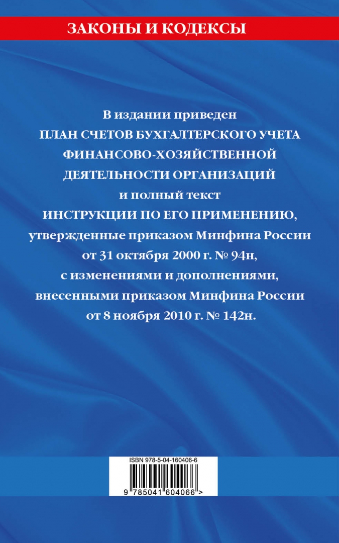 ОписаниеВ издании приведен План счетов бухгалтерского учета финансово-хозяйственной деятельности организаций и полный текст Инструкции по его применению, утвержденные приказом Минфина России от 31 октября 2000 г. № 94н, с изменениями и дополнениями, внесенными приказом Минфина России от 8 ноября 2010 г. № 142н. Издание предназначено для бухгалтеров, аудиторов, работников налоговых и финансовых служб, студентов, аспирантов и преподавателей экономических вузов и колледжей, юристов и руководителей организаций.В издании приведен План счетов бухгалтерского учета финансово-хозяйственной деятельности организаций и полный текст Инструкции по его применению, утвержденные приказом Минфина России от 31 октября 2000 г. № 94н, с изменениями и дополнениями, внесенными приказом Минфина России от 8 ноября 2010 г. № 142н. Издание предназначено для бухгалтеров, аудиторов, работников налоговых и финансовых служб, студентов, аспирантов и преподавателей экономических вузов и колледжей, юристов и руководителей организаций.