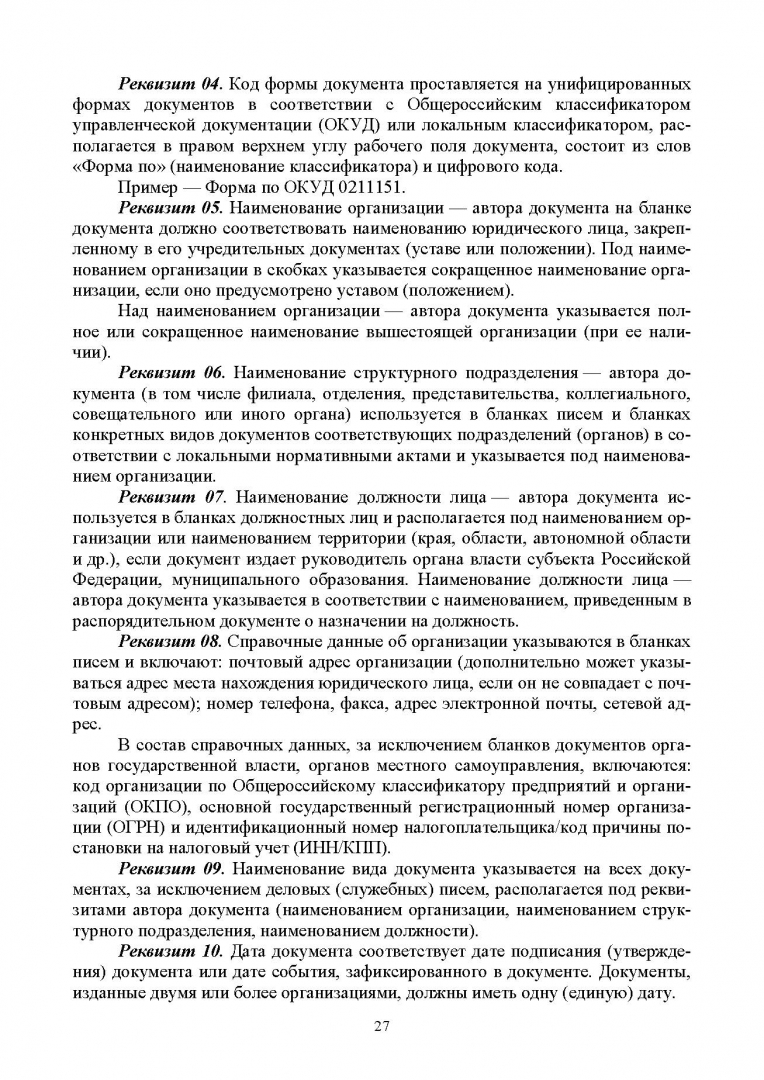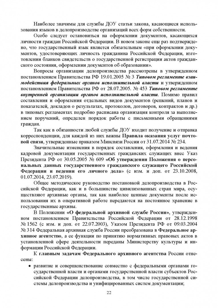 ОписаниеУчебное пособие составлено на основе программы учебной дисциплины "Документационное обеспечение управления" и предназначено для студентов бакалавриата высших учебных заведений, обучающихся по специальностям: "Менеджмент организации", "Менеджмент", "Экономика", "Управление персоналом", "Государственное и муниципальное управление" и др. В соответствии с требованиями ГОСТ Р 7.0.97-2016 рассмотрена система организационно-распорядительной документации (ОРД), документы которой выполняют типовые управленческие функции и являются правовой основой для работы с любой системой документов, в том числе с обращениями граждан. Подробно рассмотрены особенности всех видов устных и письменных обращений граждан и приведены примеры составления, оформления и организации работы с этими видами документов. Для текущего и итогового контроля усвоения материала разработан Практикум с вопросами, тестом, заданиями. Учебное пособие может быть полезным для преподавателей, руководителей малых предприятий, а также для обучающихся в Учебных центрах дополнительного профессионального образования, подготовки и переподготовки, повышения квалификации и всех, кто самостоятельно желает овладеть базовыми знаниями в области общего и делопроизводства с устными и письменными обращениями граждан. Структура и подробное изложение материала позволяют использовать учебное пособие при любой форме обучения: очной, заочной, дистанционной и в формате онлайнСвернутьУчебное пособие составлено на основе программы учебной дисциплины "Документационное обеспечение управления" и предназначено для студентов бакалавриата высших учебных заведений, обучающихся по специальностям: "Менеджмент организации", "Менеджмент", "Экономика", "Управление персоналом", "Государственное и муниципальное управление" и др. В соответствии с требованиями ГОСТ Р 7.0.97-2016 рассмотрена система организационно-распорядительной документации (ОРД), документы которой выполняют типовые управленческие функции и являются правовой основой для работы с любой системой документов, в том числе с обращениями граждан. Подробно рассмотрены особенности всех видов устных и письменных обращений граждан и приведены примеры составления, оформления и организации работы с этими видами документов. Для текущего и итогового контроля усвоения материала разработан Практикум с вопросами, тестом, заданиями. Учебное пособие может быть полезным для преподавателей, руководителей малых предприятий, а также для обучающихся в Учебных центрах дополнительного профессионального образования, подготовки и переподготовки, повышения квалификации и всех, кто самостоятельно желает овладеть базовыми знаниями в области общего и делопроизводства с устными и письменными обращениями граждан. Структура и подробное изложение материала позволяют использовать учебное пособие при любой форме обучения: очной, заочной, дистанционной и в формате онлайнСвернутьСвернуть