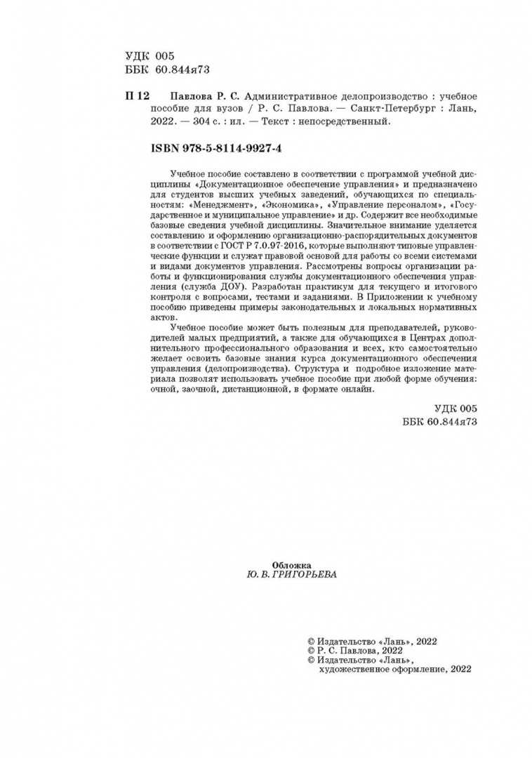 Объем, стр. 304 ISBN 978-5-8114-9927-4 Автор Павлова Раиса Сергеевна Серия Делопроизводство Язык Русский Год издания книги 2022 Тип обложки Твердый переплет Иллюстрации Черно-белые Вес, г 522г Размеры 243х172х18 мм - Отзывы