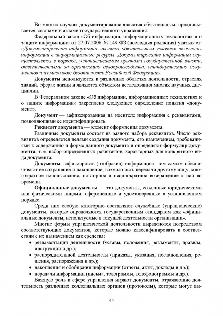 ОписаниеУчебное пособие составлено на основе программы дисциплины «Документационное обеспечение управления». Предназначено для студентов учебных заведений среднего профессионального образования, обучающихсяпо направлениям «Экономика и бухгалтерский учет», «Право и организация социального обеспечения», «Банковское дело», «Правоохранительная деятельность» и др. Соответствует современным требованиям Федерального государственного образовательного стандарта среднего профессионального образования и профессиональным квалификационным требованиям.При составлении учтены изменения, которые произошли в трудовом законодательстве в 2021 году. Дана характеристика основным видам кадровых документов, образующихся в процессе оформления трудовых отношений, с момента рассмотрения персональных документов соискателя до увольнения с примерами составления и оформления в соответствии с Трудовым кодексом РФ. Рассмотрена организационно-распорядительная документация с примерами составления и оформления документов в соответствии с требованиями ГОСТ Р 7.0.972016, документы которой выполняют типовые управленческие функции и являются составной частью документооборота кадровых служб. С целью формирования необходимых компетенций разработан Практикум для текущего и итогового контроля с вопросами, тестом, заданиями. В Приложении приведены примеры локальных нормативных актов в области делопроизводства. Учебное пособие может быть полезным для преподавателей, руководителей малых предприятий, а также для обучающихся в Центрах дополнительного профессионального образования и всех, кто самостоятельно желает освоить базовые знания из области общего и кадрового делопроизводства. Структура и подробное изложение материала, понятное для усвоения, позволят использовать учебное пособие при любой форме обучения: очной, заочной, дистанционной, в формате онлайн.СвернутьУчебное пособие составлено на основе программы дисциплины «Документационное обеспечение управления». Предназначено для студентов учебных заведений среднего профессионального образования, обучающихсяпо направлениям «Экономика и бухгалтерский учет», «Право и организация социального обеспечения», «Банковское дело», «Правоохранительная деятельность» и др. Соответствует современным требованиям Федерального государственного образовательного стандарта среднего профессионального образования и профессиональным квалификационным требованиям.При составлении учтены изменения, которые произошли в трудовом законодательстве в 2021 году. Дана характеристика основным видам кадровых документов, образующихся в процессе оформления трудовых отношений, с момента рассмотрения персональных документов соискателя до увольнения с примерами составления и оформления в соответствии с Трудовым кодексом РФ. Рассмотрена организационно-распорядительная документация с примерами составления и оформления документов в соответствии с требованиями ГОСТ Р 7.0.972016, документы которой выполняют типовые управленческие функции и являются составной частью документооборота кадровых служб. С целью формирования необходимых компетенций разработан Практикум для текущего и итогового контроля с вопросами, тестом, заданиями. В Приложении приведены примеры локальных нормативных актов в област