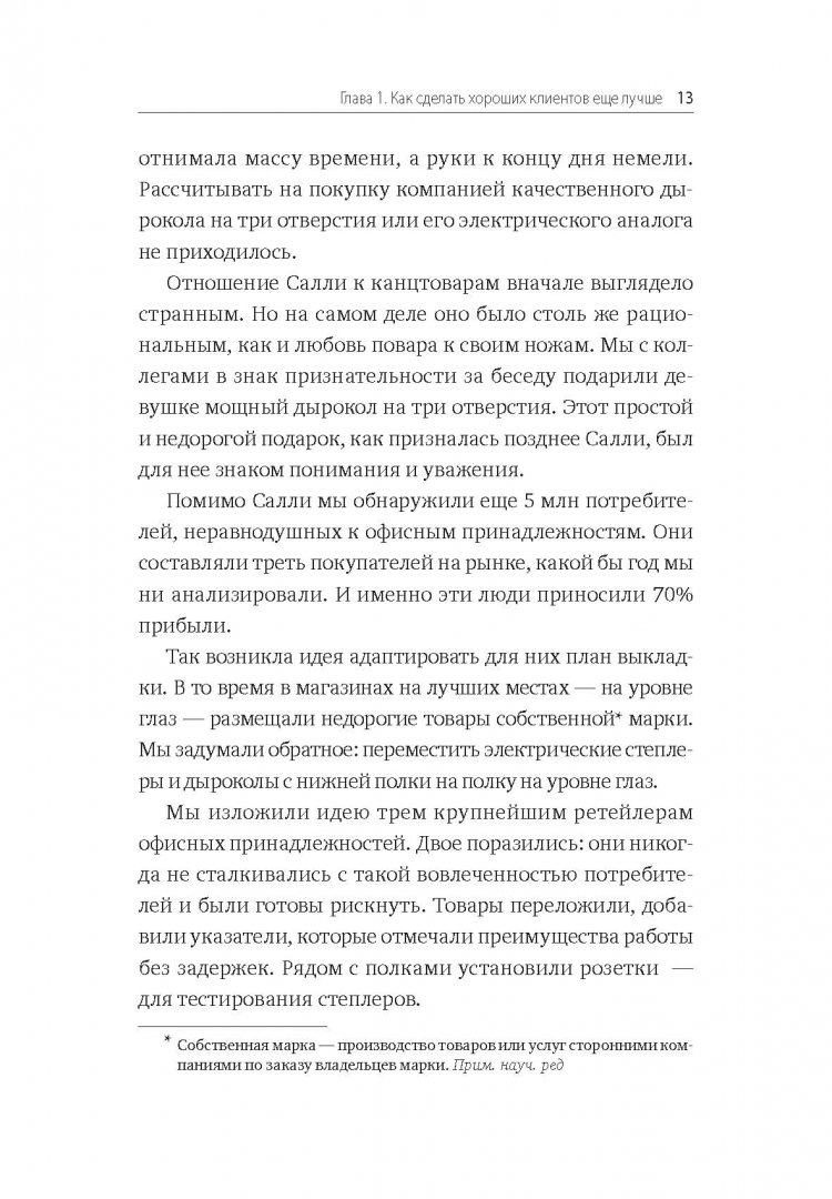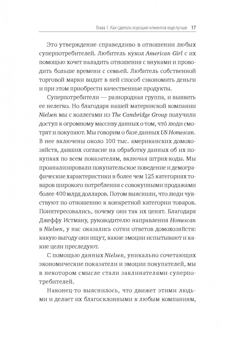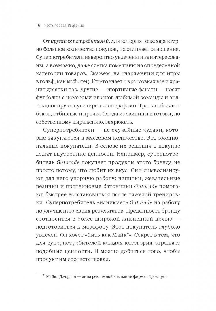 ОписаниеО книге В отличие от обычных покупателей суперпотребители очень заинтересованы в ваших товарах, а возможно, даже слегка помешаны на них.Они знают о кроссовках всё и имеют десятки пар. Они спортивные фанаты c копиями футболок любимой команды, а стены их гаражей украшены подписанной символикой.Суперпотребители не случайные люди, которые закупаются в массовом количестве. Это эмоциональные покупатели, чьи решения о приобретении товаров основаны на жизненных ценностях и стремлениях.Например, суперпотребитель Gatorade покупает продукты компании не просто потому, что ему нравится их вкус. Он выбирает бренд, так как тот отражает упорную работу, а продукты Gatorade позволят ему быстрее восстановиться после тяжёлой тренировки.Суперпотребитель "нанимает" Gatorade на работу по улучшению его результатов - преданность, которая также имеет отношение к более широкой жизненной цели подготовиться к марафону.Суперпотребители могут быть разнородной группой, которую сложно определить. Но автор этой книги вместе с коллегами по The Cambridge Group имеет доступ к огромному объему данных о том, что люди смотрят и покупают. Проанализировав базу данных Nielsen US Homescan, которая состоит из данных по 100 000 американских домохозяйств, согласившихся на измерение их покупок, и другие источники информации, он узнал, что движет этими людьми и что делает их благосклонными к компаниям.Для кого эта книгаДля руководителей, собственников бизнеса, маркетологов и директоров по развитиюОб автореЭдди Юн - руководитель The Cambridge Group, компании по разработке стратегий развития, входящей в состав Nielsen. За 17 лет работы в TCG он помог клиентам добиться более $1 миллиарда роста прибыли в сферах упакованных потребительских товаров, ритейла, медиа и технологий.Юн является экспертом в области маркетинга, инноваций и розничных продаж. Он получил степень бакалавра политических наук и экономики в Университете Чикаго. Исследовал темы стратегий роста и скрытого спроса. Написал десятки статей для hbr.org (Harvard Business Review) и цитировался в Wall Street Journal. Выступал в США, Азии, Австралии и Новой Зеландии.СвернутьО книге В отличие от обычных покупателей суперпотребители очень заинтересованы в ваших товарах, а возможно, даже слегка помешаны на них.Они знают о кроссовках всё и имеют десятки пар. Они спортивные фанаты c копиями футболок любимой команды, а стены их гаражей украшены подписанной символикой.Суперпотребители не случайные люди, которые закупаются в массовом количестве. Это эмоциональные покупатели, чьи решения о приобретении товаров основаны на жизненных ценностях и стремлениях.Например, суперпотребитель Gatorade покупает продукты компании не просто потому, что ему нравится их вкус. Он выбирает бренд, так как тот отражает упорную работу, а продукты Gatorade позволят ему быстрее восстановиться после тяжёлой тренировки.Суперпотребитель "нанимает" Gatorade на работу по улучшению его результатов - преданность, которая также имеет отношение к более широкой жизненной цели подготовиться к марафону.Суперпотребители могут быть разнородной группой, которую сложно определить. Но автор этой книги вместе с коллегами по The Cambridge Group имеет доступ к огромному объему данных о том, что люди смотрят и покупают. Проанализировав базу данных Nielsen US Homescan, которая состоит из данных по 100 000 американских домохозяйств, согласившихся н