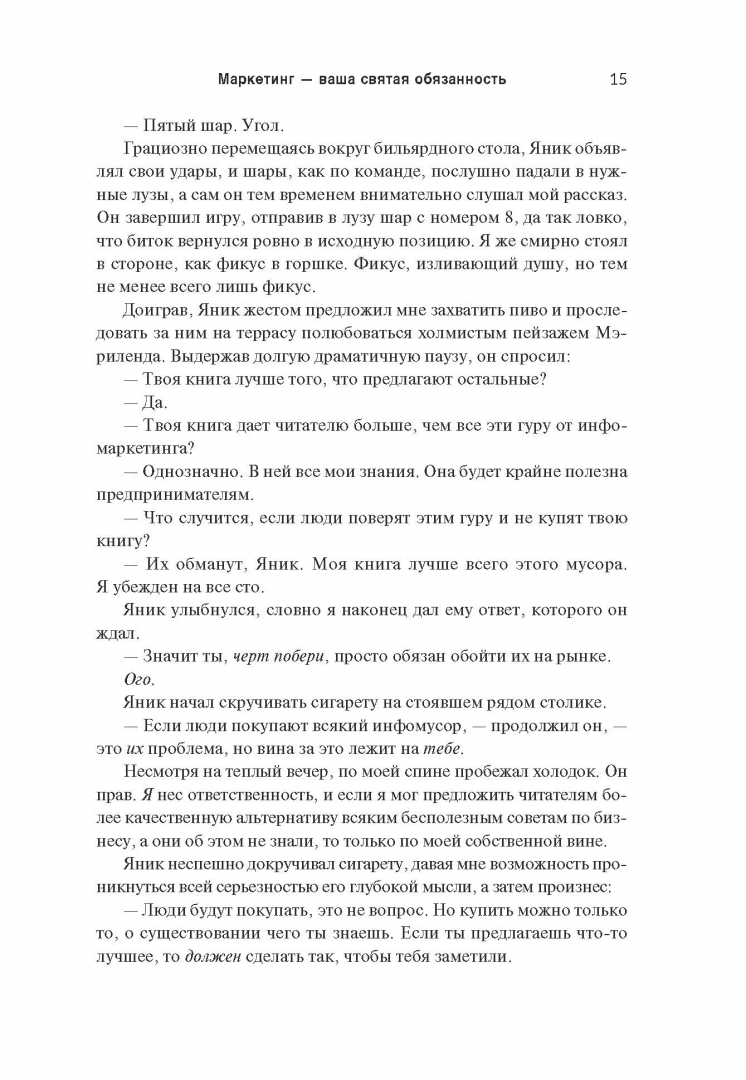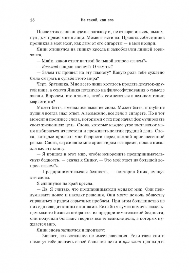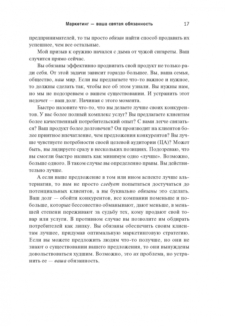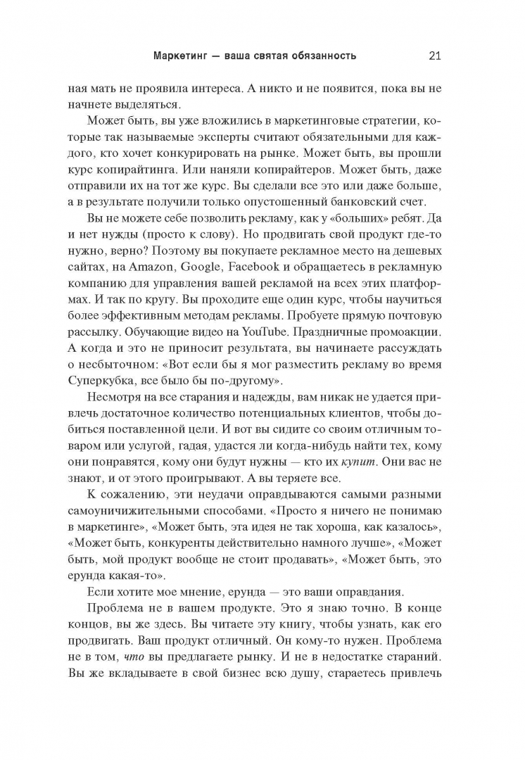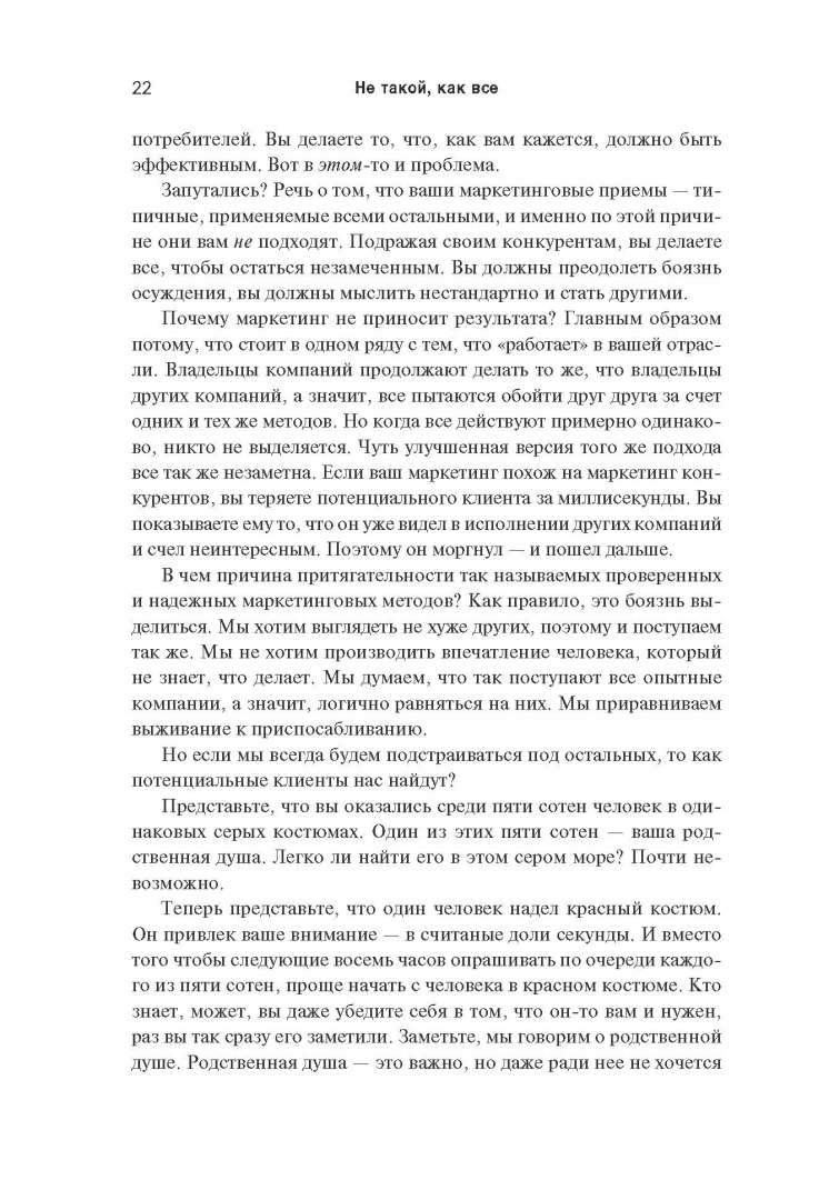 ОписаниеКак выделиться из общей массы конкурентов?Многие предприниматели на перенасыщенных рынках чувствуют себя буквально невидимками. Они точно знают, что обладают конкурентным преимуществом, но никак не могут привлечь потребителей. Причина в том, что для клиентов вы должны быть не просто лучшим, а другим, непохожим на остальных. И победит тот, чей маркетинг перетянет внимание покупателей на себя.В своей новой книге Майк Микаловиц описывает беспроигрышный метод позиционирования компании, услуг или бренда таким образом, чтобы стать заметным, привлечь потенциальных клиентов и конвертировать эти возможности в фактические продажи. Написанная с юмором и прямолинейностью на основе ценных идей из опыта реальных предпринимателей, книга предлагает простую, доступную каждому систему, базирующуюся на трех критических вопросах, которые должен задать себе каждый, кто хочет преуспеть в бизнесе:1. Выделяется ли мой маркетинг?2. Привлекает ли мой маркетинг?3. Подталкивает ли мой маркетинг к действию?Это практическое руководство изменит жизнь всех, кто не развивается из-за того, что его идея, товар или услуга теряются в общей массе и не находят отклика у целевой аудитории.СвернутьКак выделиться из общей массы конкурентов?Многие предприниматели на перенасыщенных рынках чувствуют себя буквально невидимками. Они точно знают, что обладают конкурентным преимуществом, но никак не могут привлечь потребителей. Причина в том, что для клиентов вы должны быть не просто лучшим, а другим, непохожим на остальных. И победит тот, чей маркетинг перетянет внимание покупателей на себя.В своей новой книге Майк Микаловиц описывает беспроигрышный метод позиционирования компании, услуг или бренда таким образом, чтобы стать заметным, привлечь потенциальных клиентов и конвертировать эти возможности в фактические продажи. Написанная с юмором и прямолинейностью на основе ценных идей из опыта реальных предпринимателей, книга предлагает простую, доступную каждому систему, базирующуюся на трех критических вопросах, которые должен задать себе каждый, кто хочет преуспеть в бизнесе:1. Выделяется ли мой маркетинг?2. Привлекает ли мой маркетинг?3. Подталкивает ли мой маркетинг к действию?Это практическое руководство изменит жизнь всех, кто не развивается из-за того, что его идея, товар или услуга теряются в общей массе и не находят отклика у целевой аудитории.СвернутьСвернуть