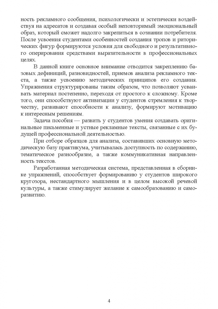 ОписаниеВ сборнике собраны упражнения, направленные на развитие у студентов умений создавать тексты рекламных сообщений. Система заданий включает как разнообразный анализ образцов, так и активную творческую работу. Материалы каждой темы содержат небольшие теоретические справки ("Немного теории!"), способствующие закреплению теоретического материала и облегчающие выполнение заданий. Пособие можно использовать на занятиях при изучении дисциплины "Рекламный текст".Данная книга рассчитана на студентов направления среднего профессионального образования "Реклама", а также широкого круга читателей, интересующихся спецификой рекламных текстов и особенностями их создания.3-е издание, стереотипное.В сборнике собраны упражнения, направленные на развитие у студентов умений создавать тексты рекламных сообщений. Система заданий включает как разнообразный анализ образцов, так и активную творческую работу. Материалы каждой темы содержат небольшие теоретические справки ("Немного теории!"), способствующие закреплению теоретического материала и облегчающие выполнение заданий. Пособие можно использовать на занятиях при изучении дисциплины "Рекламный текст".Данная книга рассчитана на студентов направления среднего профессионального образования "Реклама", а также широкого круга читателей, интересующихся спецификой рекламных текстов и особенностями их создания.3-е издание, стереотипное.