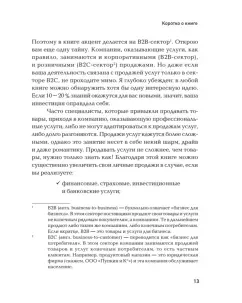 ОписаниеПродавать услуги не сложнее, чем товары - нужно только знать, как. В условиях жесткой конкурентной борьбы продавцу нужно постоянно осваивать новые методы работы. И чем необычнее они будут, тем больше прибыли принесут. В век серьезной конкуренции и корпоративных войн за клиентов книга Мурата Тургунова послужит пошаговым руководством к тому, чтобы не только не проиграть своим конкурентам, но и выйти из борьбы победителем, одновременно делая своих клиентов намного успешнее.Эта книга, основанная на многолетнем личном опыте автора в продажах B2B и B2C, расскажет не только о специфике продажи сложных, профессиональных услуг (финансовых, медицинских, транспортных и многих других). Она содержит минимум теории и максимум практических примеров, которые гарантированно помогут вам увеличить свои личные продажи.В обновленном издании актуализирован раздел "Поиск прибыльных клиентов", что позволит применять более прогрессивные и действенные методики продаж и поиска клиентов, добавлена новая глава "Мягкие продажи".Книга будет полезна менеджерам и руководителям отделов продаж, коммерческим директорам и всем, кто связан с продажами профессиональных услуг: консалтинговых, финансовых, аудиторских, юридических; образовательных, медицинских и в сфере недвижимости; IT, телекоммуникационных и информационных; туристических, охранных, клининговых и многих других.2-издание.СвернутьПродавать услуги не сложнее, чем товары - нужно только знать, как. В условиях жесткой конкурентной борьбы продавцу нужно постоянно осваивать новые методы работы. И чем необычнее они будут, тем больше прибыли принесут. В век серьезной конкуренции и корпоративных войн за клиентов книга Мурата Тургунова послужит пошаговым руководством к тому, чтобы не только не проиграть своим конкурентам, но и выйти из борьбы победителем, одновременно делая своих клиентов намного успешнее.Эта книга, основанная на многолетнем личном опыте автора в продажах B2B и B2C, расскажет не только о специфике продажи сложных, профессиональных услуг (финансовых, медицинских, транспортных и многих других). Она содержит минимум теории и максимум практических примеров, которые гарантированно помогут вам увеличить свои личные продажи.В обновленном издании актуализирован раздел "Поиск прибыльных клиентов", что позволит применять более прогрессивные и действенные методики продаж и поиска клиентов, добавлена новая глава "Мягкие продажи".Книга будет полезна менеджерам и руководителям отделов продаж, коммерческим директорам и всем, кто связан с продажами профессиональных услуг: консалтинговых, финансовых, аудиторских, юридических; образовательных, медицинских и в сфере недвижимости; IT, телекоммуникационных и информационных; туристических, охранных, клининговых и многих других.2-издание.СвернутьСвернуть