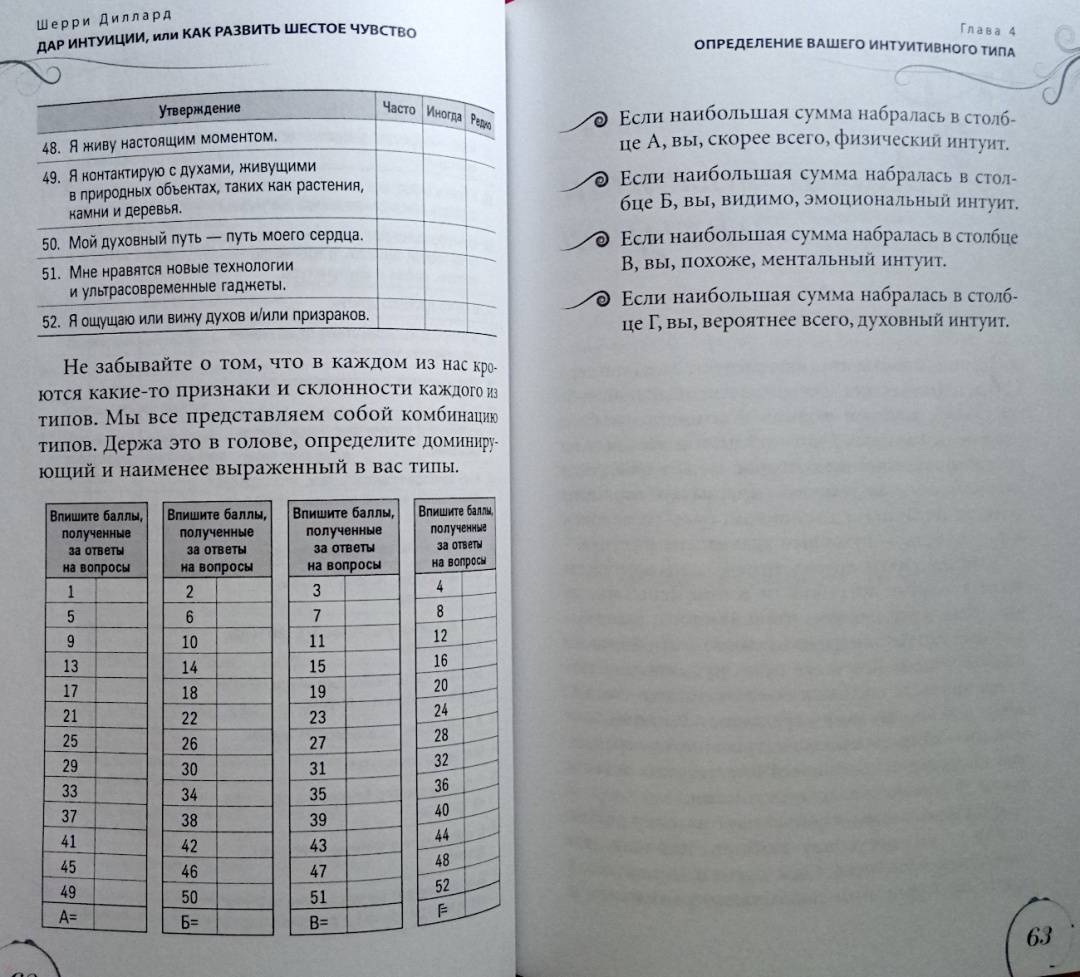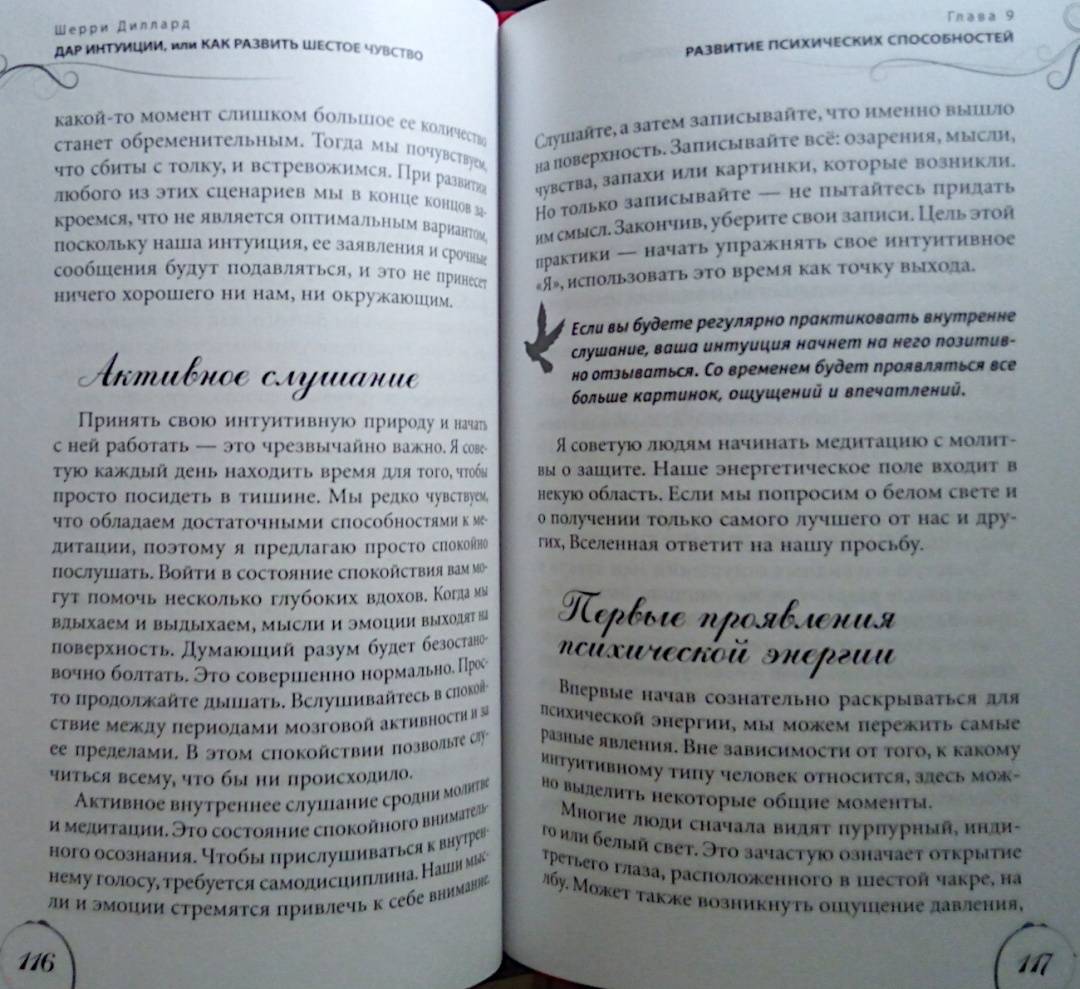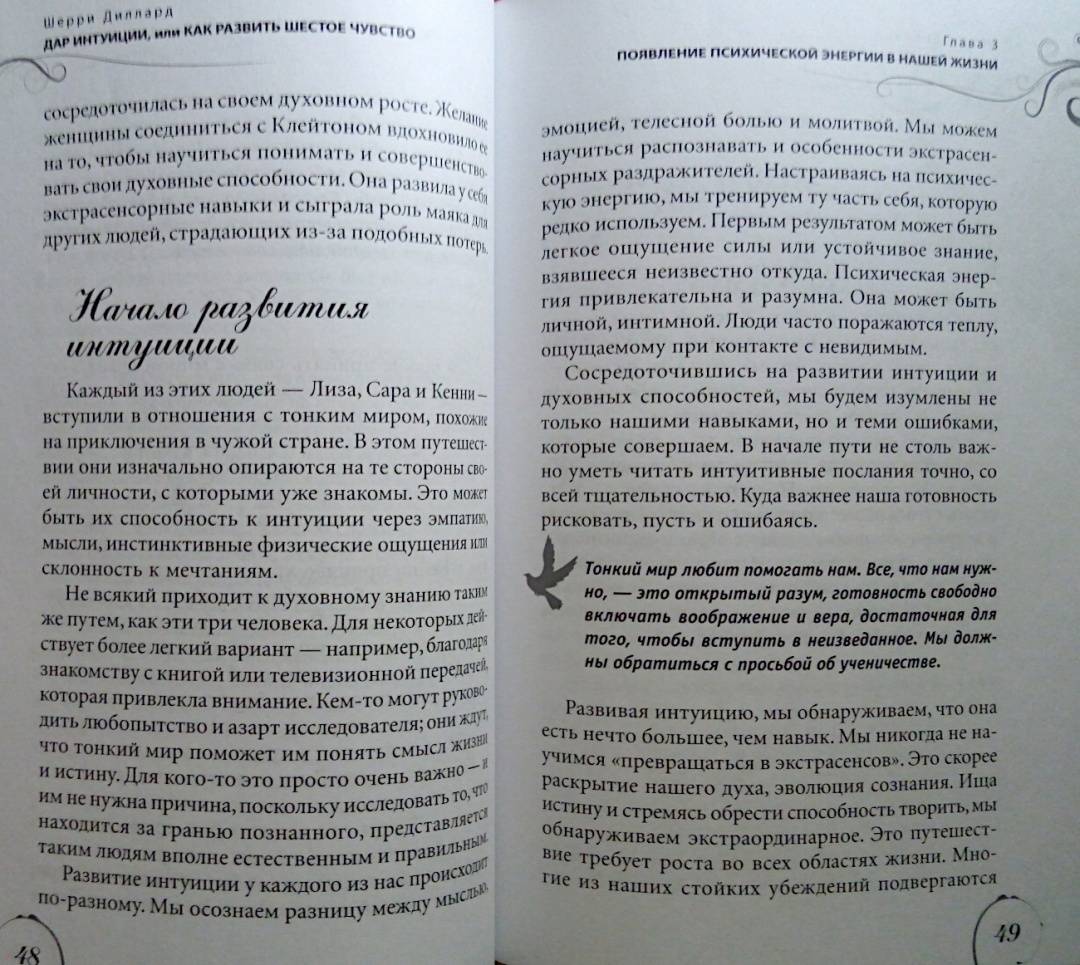 ОписаниеШерри Диллард — медиум с двадцатилетним стажем — убеждена, что каждый человек от природы наделен «шестым чувством» и с помощью определенных техник может максимально его развить.Автор пишет о том, что всех людей с точки зрения особенностей их интуиции можно поделить на четыре типа: эмоциональные, ментальные, физические и духовные интуиты. С помощью теста вы сможете определить свой интуитивный тип. Затем автор подводит к следующему шагу — медитативным упражнениям — особым для каждого типа. Выполнение этих упражнений станет первым шагом на пути развития ваших психических способностей.Руководствуясь советами автора, вы научитесь привлекать помощников из духовного мира — ангелов и наставников — и сможете получать от них сообщения, предостережения и подсказки. Но настоящим даром на пути развития интуиции станет подлинный духовный рост, который позволит вам выйти на высший уровень осознания реальности, обогатить внутренний мир и обрести мудрость.О чем книгаШерии Диллард утверждает, что ваше «шестое чувство» столь же индивидуально, как вы сами. Вы можете быть ментальным интуитом, получающим информацию в виде неких идей — «вспышек в сознании». Либо эмоциональным интуитивным типом — такие люди получают нужные сведения с помощью чувств и эмоций. Физические интуиты способны считывать энергию, проявляющуюся в виде телесных ощущений. А духовные — могут видеть людей, ушедших в иной мир, и вступать с ними в контакт; их интуиция проходит сквозь сны, видения и духовное зрение…Каждый человек принадлежит к одному из четырех интуитивных типов и часто даже не догадывается об этом. К какому типу относитесь вы? Шерри Диллард поможет вам определить это, а также подскажет, как использовать ваши индивидуальные способности в повседневной жизни.Почему книгу стоит прочитатьЭта книга представляет собой максимально эффективное и вместе с тем простое руководство для выявления и развития ваших способностей. Вам нужно сделать всего три шага:— пройти тесты, чтобы определить, к какому интуитивному типу вы относитесь;— ознакомиться с историями из жизни интуитов разных типов, что позволит больше узнать об их природе, сильных и слабых сторонах;— выполнить медитации и упражнения, предложенные для каждого конкретного типа, чтобы обнаружить и развить свои способности.Для кого эта книгаКнига адресована всем, кто хочет развить скрытые способности своей психики. Инновационный подход в области практической эзотерики, разработанный Шерри Диллард, будет интересен и опытным экстрасенсам. А истории из профессиональной практики автора, иллюстрирующие невероятную силу интуиции и ее связь с миром духов, внутренней мудростью и высшим «Я», не оставят равнодушным любителей психологии и эзотерической литературы.Почему решили издатьТеоретическая часть и практические советы, данные в книге, уникальны — они не повторяют ни одну из уже существующих экстрасенсорных техник. Метод по определению и развитию индивидуальных психических способностей был разработан автором самостоятельно и уже в течение нескольких лет не теряет популярности среди клиентов и читателей.Информация об автореШерри Диллард более двадцати лет является практикующим медиумом. Она использует свои уникальные психические способности, чтобы помогать людям, приезжающим к ней 