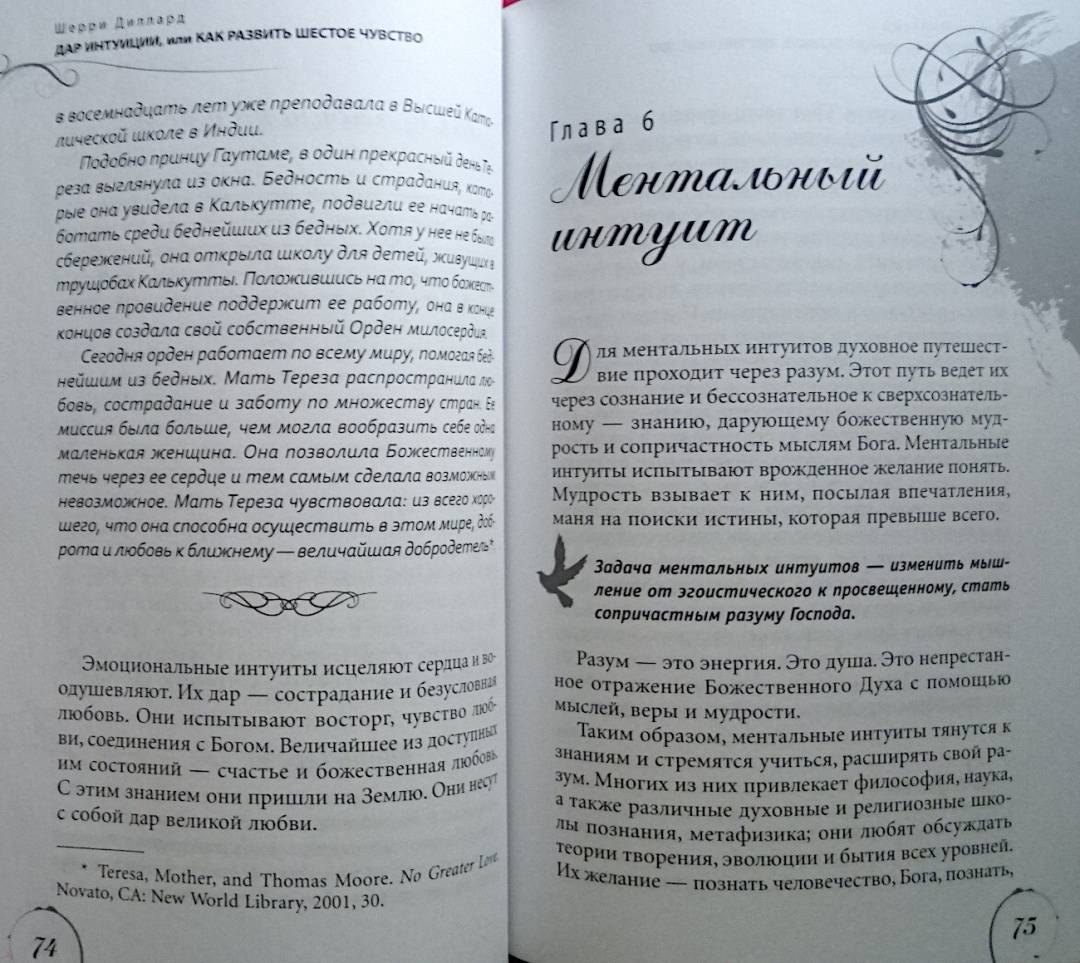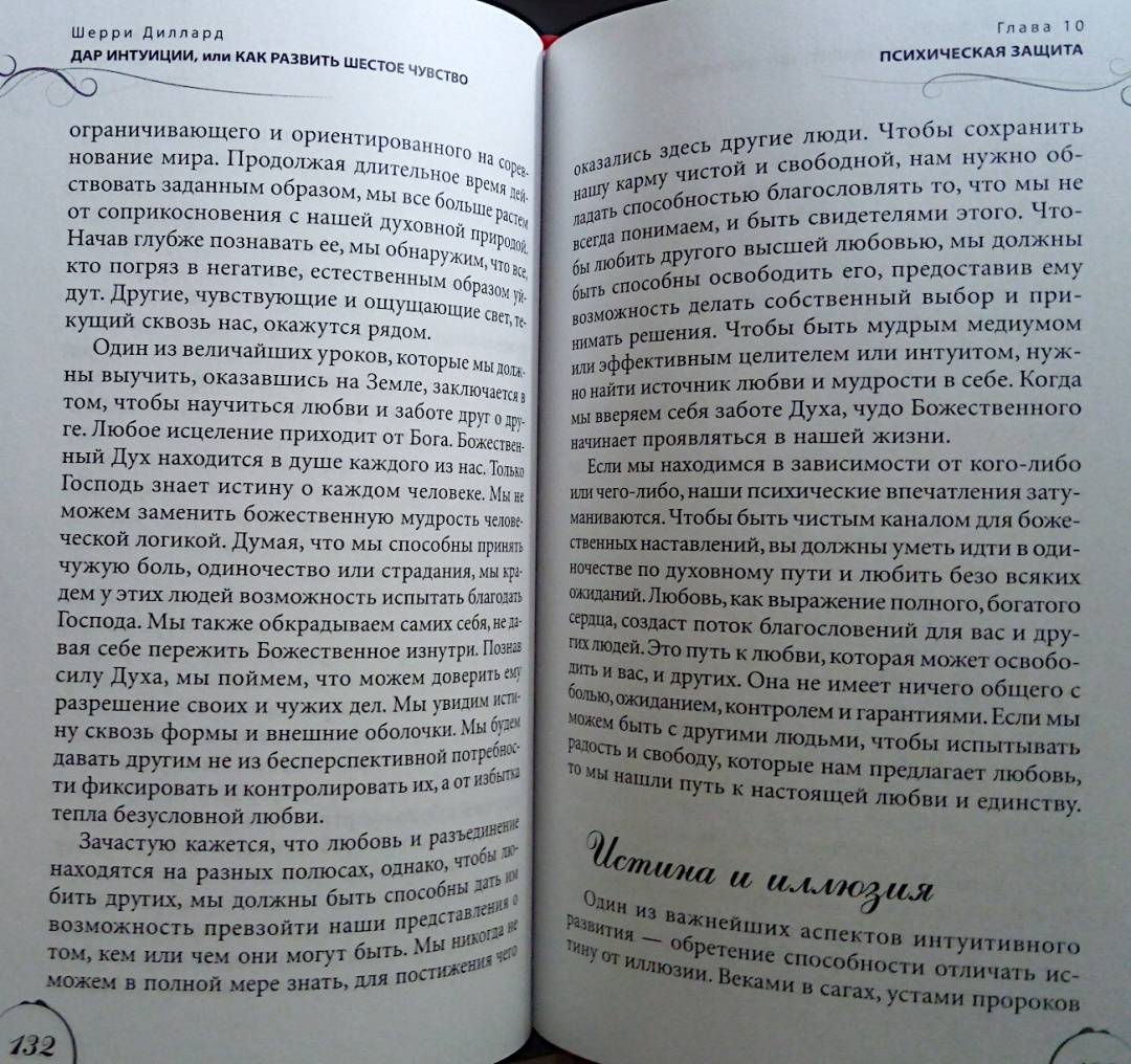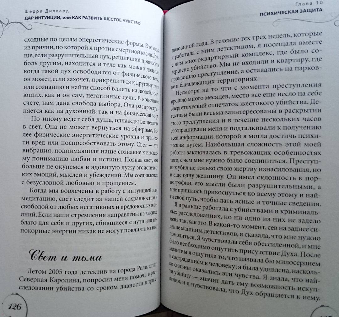 ОписаниеШерри Диллард — медиум с двадцатилетним стажем — убеждена, что каждый человек от природы наделен «шестым чувством» и с помощью определенных техник может максимально его развить.Автор пишет о том, что всех людей с точки зрения особенностей их интуиции можно поделить на четыре типа: эмоциональные, ментальные, физические и духовные интуиты. С помощью теста вы сможете определить свой интуитивный тип. Затем автор подводит к следующему шагу — медитативным упражнениям — особым для каждого типа. Выполнение этих упражнений станет первым шагом на пути развития ваших психических способностей.Руководствуясь советами автора, вы научитесь привлекать помощников из духовного мира — ангелов и наставников — и сможете получать от них сообщения, предостережения и подсказки. Но настоящим даром на пути развития интуиции станет подлинный духовный рост, который позволит вам выйти на высший уровень осознания реальности, обогатить внутренний мир и обрести мудрость.О чем книгаШерии Диллард утверждает, что ваше «шестое чувство» столь же индивидуально, как вы сами. Вы можете быть ментальным интуитом, получающим информацию в виде неких идей — «вспышек в сознании». Либо эмоциональным интуитивным типом — такие люди получают нужные сведения с помощью чувств и эмоций. Физические интуиты способны считывать энергию, проявляющуюся в виде телесных ощущений. А духовные — могут видеть людей, ушедших в иной мир, и вступать с ними в контакт; их интуиция проходит сквозь сны, видения и духовное зрение…Каждый человек принадлежит к одному из четырех интуитивных типов и часто даже не догадывается об этом. К какому типу относитесь вы? Шерри Диллард поможет вам определить это, а также подскажет, как использовать ваши индивидуальные способности в повседневной жизни.Почему книгу стоит прочитатьЭта книга представляет собой максимально эффективное и вместе с тем простое руководство для выявления и развития ваших способностей. Вам нужно сделать всего три шага:— пройти тесты, чтобы определить, к какому интуитивному типу вы относитесь;— ознакомиться с историями из жизни интуитов разных типов, что позволит больше узнать об их природе, сильных и слабых сторонах;— выполнить медитации и упражнения, предложенные для каждого конкретного типа, чтобы обнаружить и развить свои способности.Для кого эта книгаКнига адресована всем, кто хочет развить скрытые способности своей психики. Инновационный подход в области практической эзотерики, разработанный Шерри Диллард, будет интересен и опытным экстрасенсам. А истории из профессиональной практики автора, иллюстрирующие невероятную силу интуиции и ее связь с миром духов, внутренней мудростью и высшим «Я», не оставят равнодушным любителей психологии и эзотерической литературы.Почему решили издатьТеоретическая часть и практические советы, данные в книге, уникальны — они не повторяют ни одну из уже существующих экстрасенсорных техник. Метод по определению и развитию индивидуальных психических способностей был разработан автором самостоятельно и уже в течение нескольких лет не теряет популярности среди клиентов и читателей.Информация об автореШерри Диллард более двадцати лет является практикующим медиумом. Она использует свои уникальные психические способности, чтобы помогать людям, приезжающим к ней 