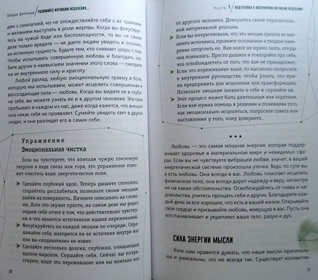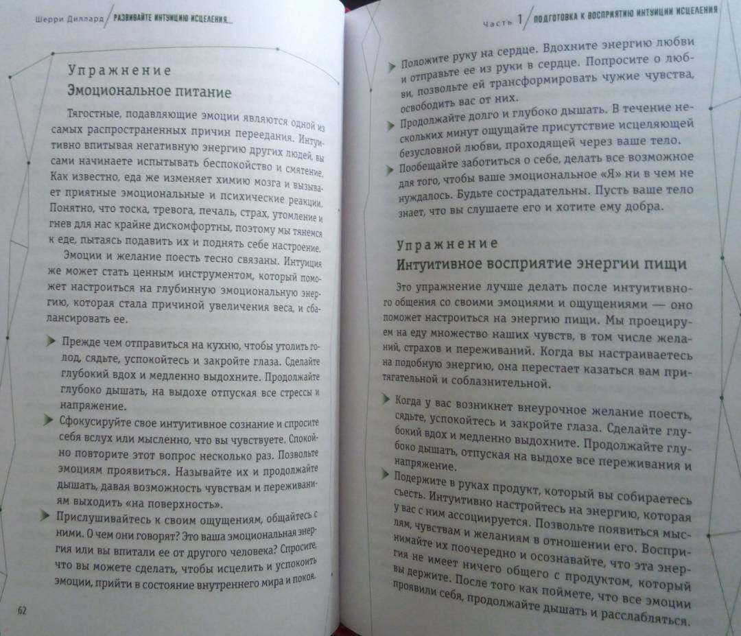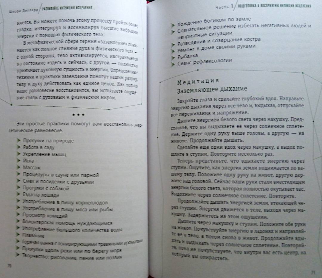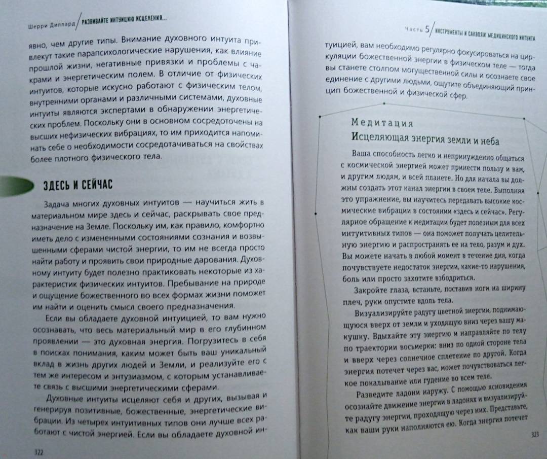 ОписаниеМудрый внутренний голос нашего духа всегда действует через интуицию. Сон про болезнь или послание о состоянии здоровья, полученное от духа близкого человека, побуждают позаботиться о себе или записаться на медицинское обследование. Интуитивное осознание своего самочувствия - это дар каждого человека, который дается ему с рождения. У всех нас есть природная внутренняя сила, благодаря ей мы можем интуитивно воспринимать энергетическую информацию о том, что происходит с организмом. Так мы понимаем, как поддерживать оптимальный уровень здоровья и благополучия.Медицинский мир стремительно меняется. Сегодня никого не удивишь альтернативными методами лечения и терапии. Во многом подобная эволюция происходит благодаря людям, которые сумели выздороветь - они на себе испытали, как эмоции, мысли, отношения, духовность, ежедневный настрой могут влиять на здоровье и качество жизни. Это осознание помогает обретать силы для исцеления и поддерживать здоровье, интуитивно прислушиваясь к потребностям физического тела, залечивая эмоциональные раны, изменяя мысли и убеждения, открываясь силе духа.Шерри ДиллардО чем книгаО том, как научиться слышать послания интуиции о своем здоровье и заботиться о нем. Шерри Диллард, опытный медиум и знаменитый экстрасенс объясняет, как раскрыть в себе дар интуиции, данный от природы каждому. Когда вы определите тип своей интуиции - эмоциональный, физический, духовный или ментальный, то поймете, каким образом внутренний целитель передает вам информацию о состоянии здоровья. Через эмоции, ощущения в теле, духовные озарения или яснознание.Также вы найдете множество практических упражнений и медитаций, эффективность которых подтверждена в ходе целительской работы Диллард. Благодаря советам и рекомендациям автора вы научитесь отслеживать состояние своего организма и вовремя реагировать на ухудшение самочувствия. Вы узнаете:- как очистить свое энергетического поле от чужой токсичной энергии;- как вернуть себе силу, если чувствуете, что ослаблены и нет энергии- как уравновесить и привести в баланс тело, разум и дух;- как диагностировать и улучшать состояние ауры и чакр;- как осознать свою связь со Вселенной и обращаться к высшим силам за помощью в исцелении;- как настроиться на энергию пищи, чтобы получить максимум пользы от еды.Почему книгу стоит прочитатьКогда вы разовьете способность интуитивно оценивать состояние своего здоровья, то сможете принимать обоснованные решения, связанные с вашим самочувствием, тактикой лечения, выбором врачей. Вы станете более осознанными в отношениях со своим телом, будете понимать, что оно хочет сказать вам о своих потребностях. Больше отдыхать, избегать определенных занятий или общения с кем-либо, сменить рацион или режим. Вы научитесь поддерживать хорошее состояние энергетического здоровья, узнаете, как избегать или трансформировать негативную энергию боли, стресса, гнева или плохих вибраций окружающих людей и пространства. Сотрудничество с интуицией поможет соблюдать энергетический баланс тела и души и привлекать позитивную энергию - для здоровой и счастливой жизни.Для кого эта книгаКнига адресована тем, кто:- заботится о своем здоровье;- занимается целительством или применяет методы нетрадиционной медицины;- практикует различные способы работы с 